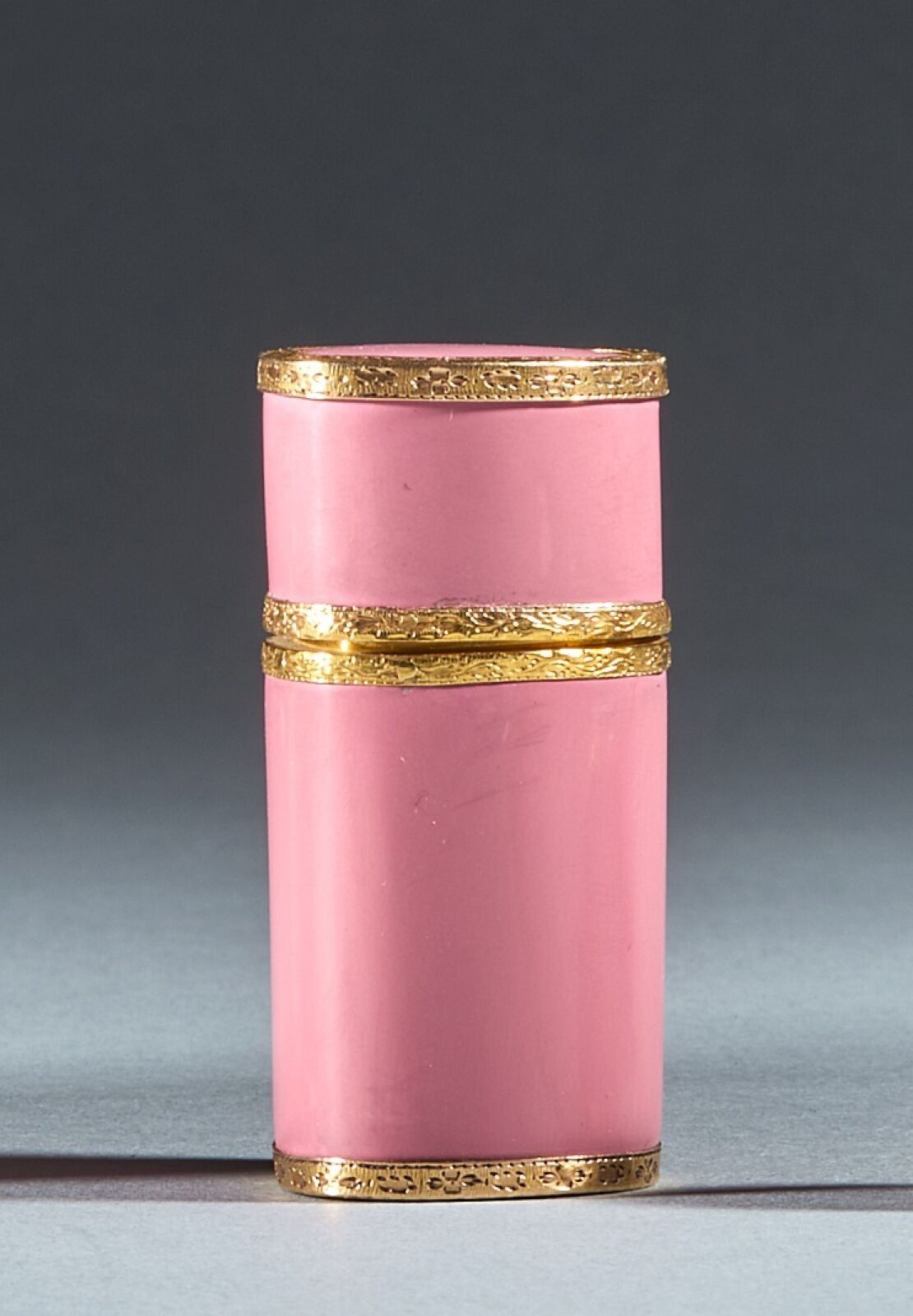 Heart-shaped case in pink lacquered metal, mounted in 18K (750 thousandths) gold.