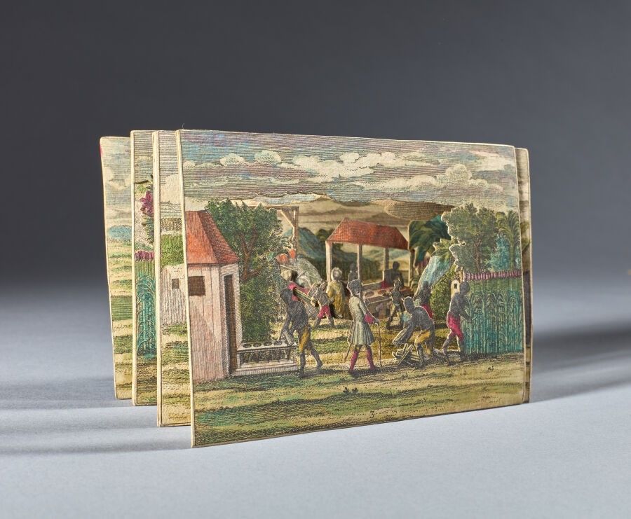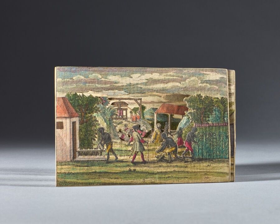 Six engraved cartoons enhanced with watercolours depicting the various stages in the manufacture of sugar on a plantation. The narrative is guided by perspective and regular distance.