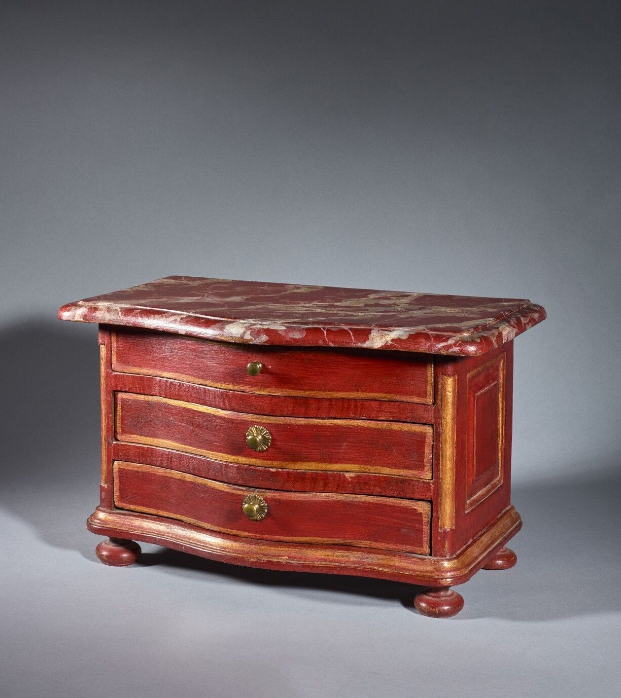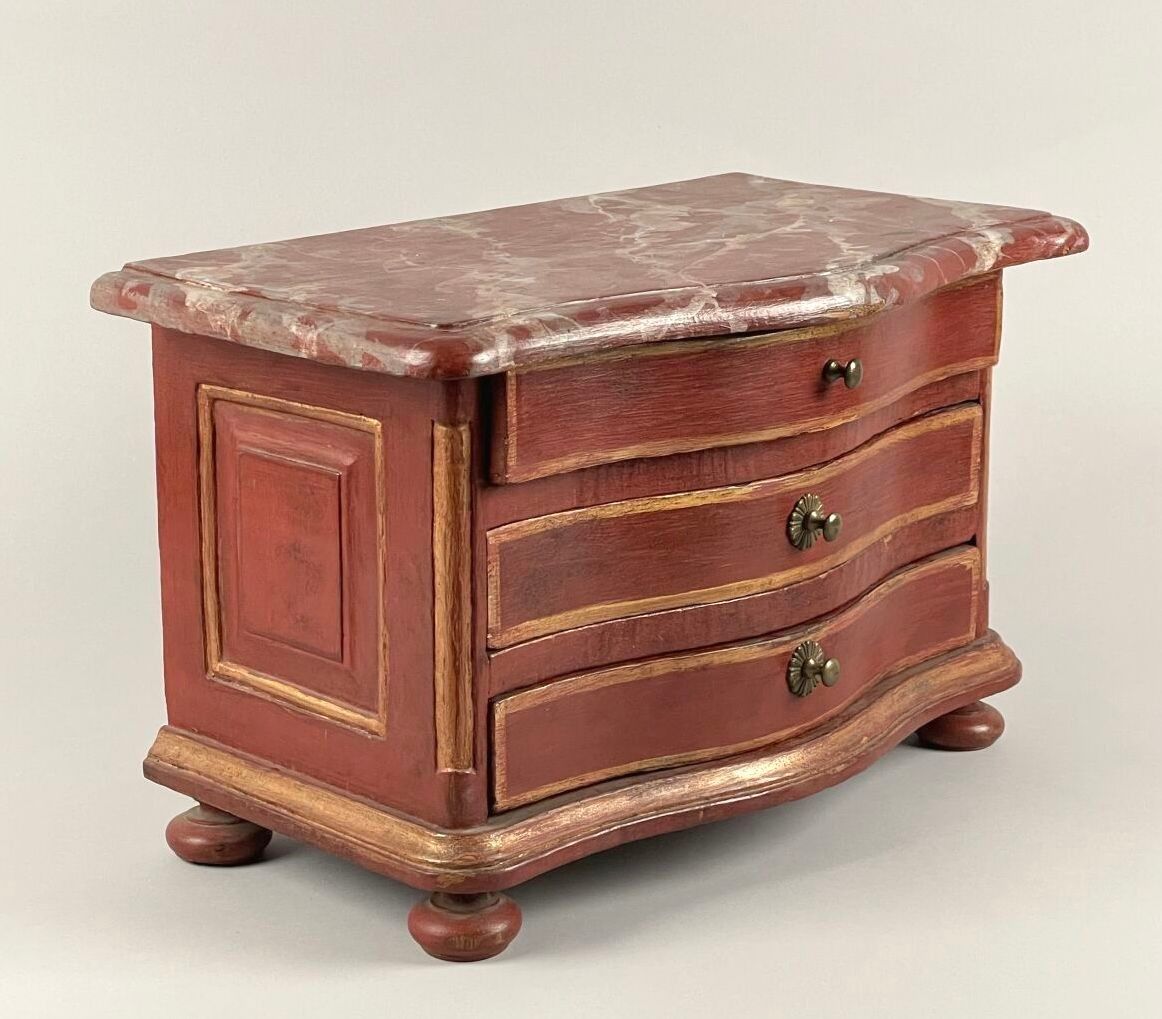 Painted and gilded wood miniature chest of drawers, the curved front opening to three drawers, the painted wood top in the imitation of marble resting on rounded uprights and circular legs.