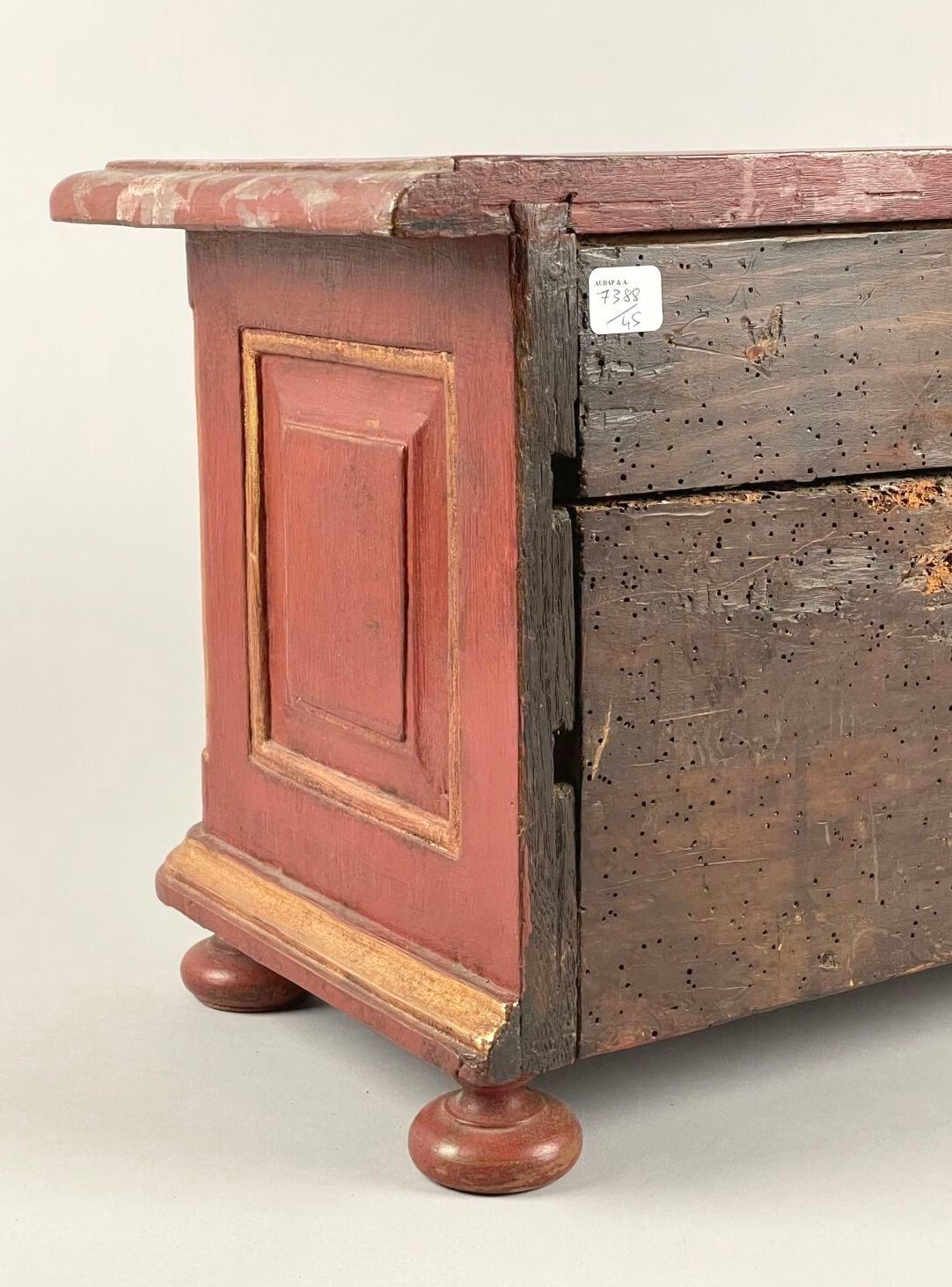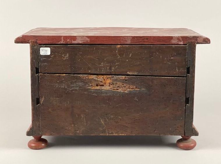 Painted and gilded wood miniature chest of drawers, the curv…