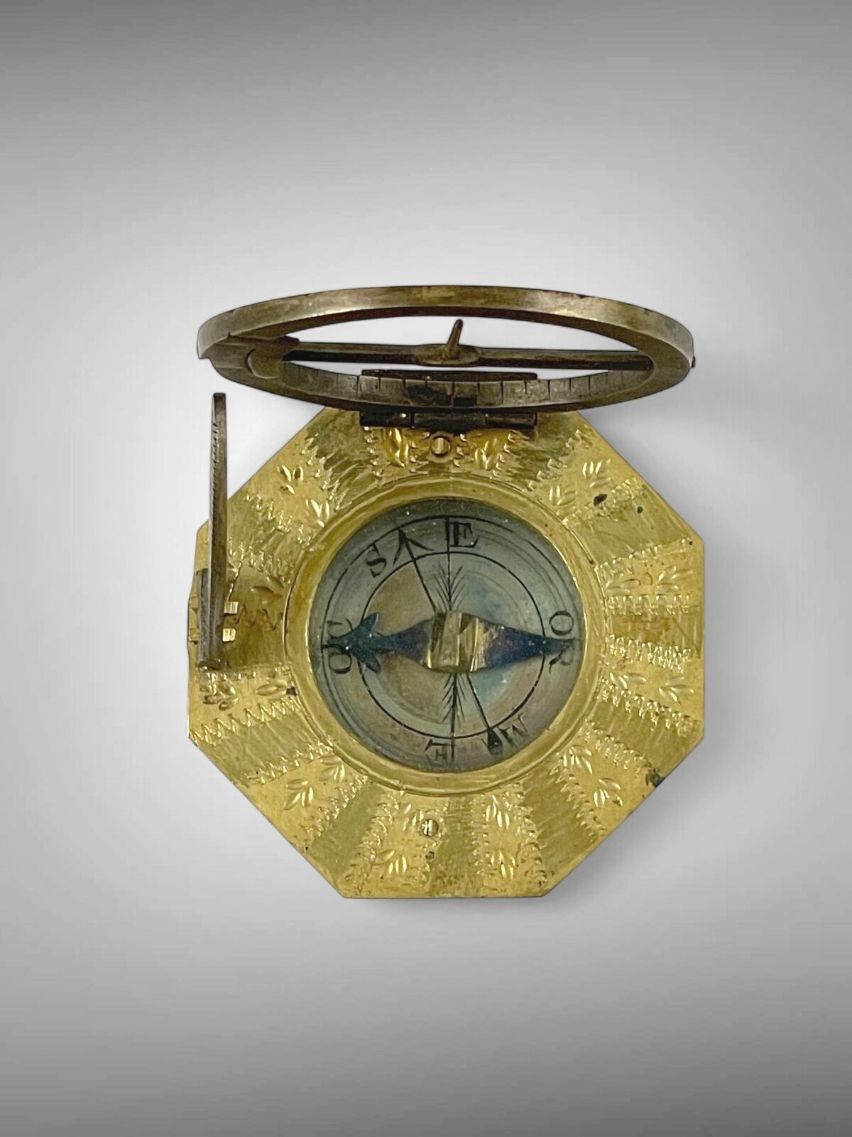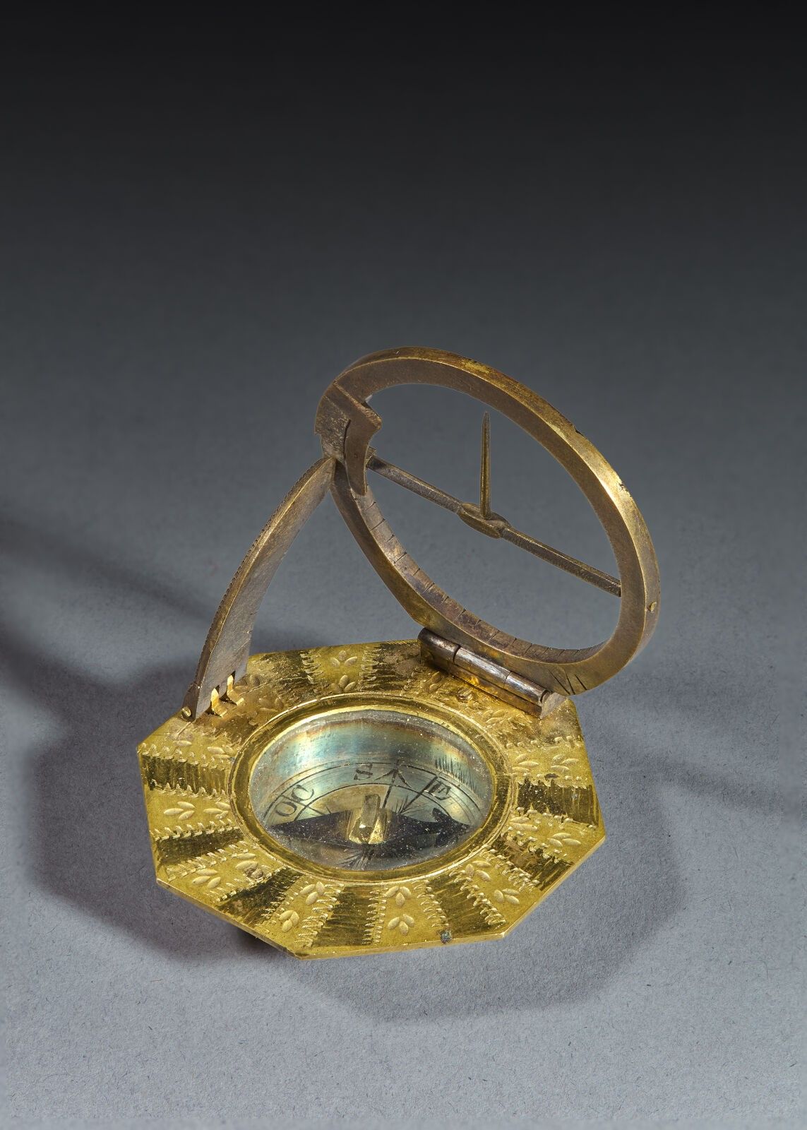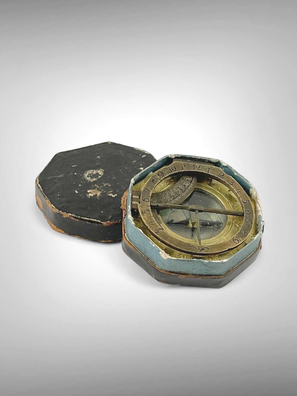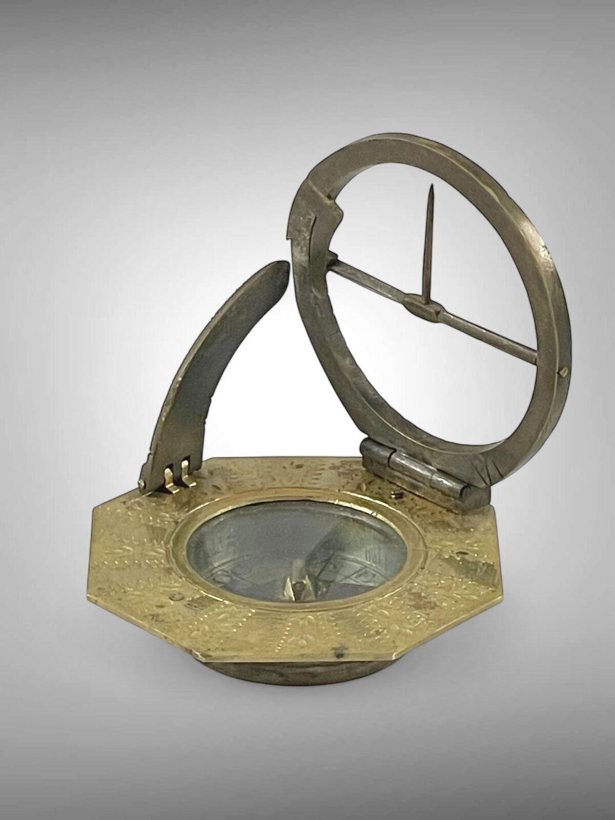 Portable equatorial sundial with engraved brass compass. Baseplate with engraved foliage decoration, engraved equinoctial hour ring with folding gnomon and latitude arc. The reverse is signed Johann Schrettegger in Augusburg; Complete with shaped cardboard case and instructions.