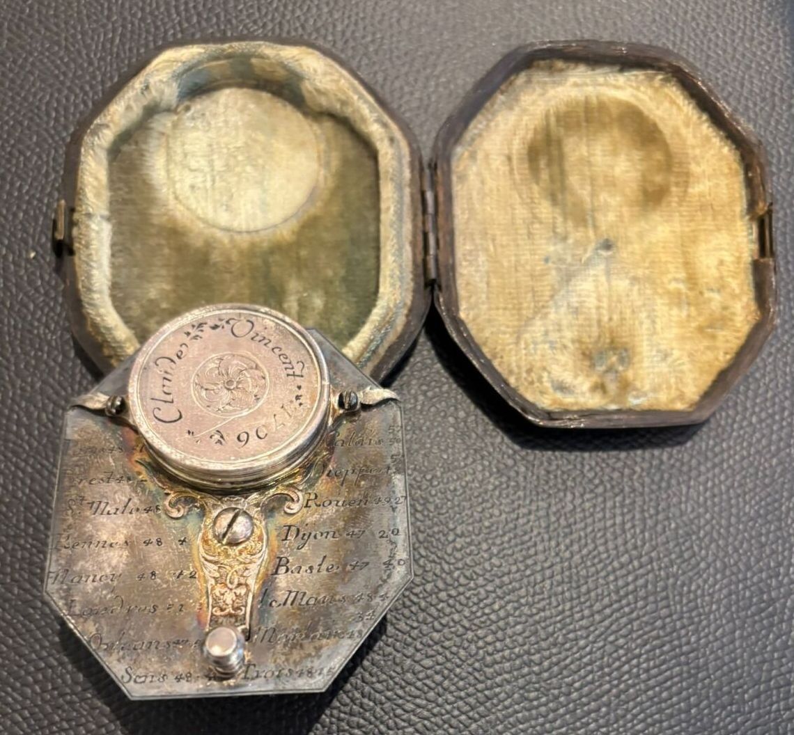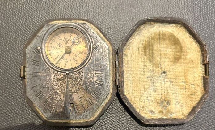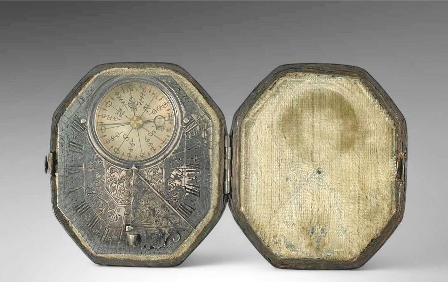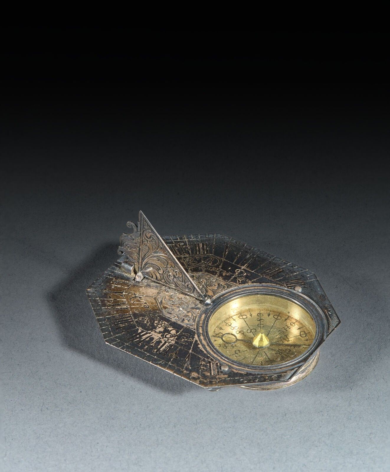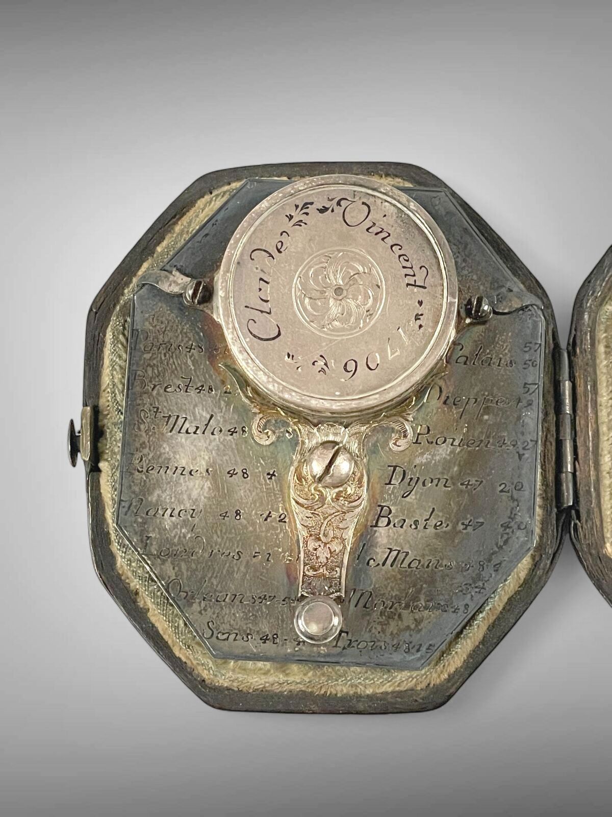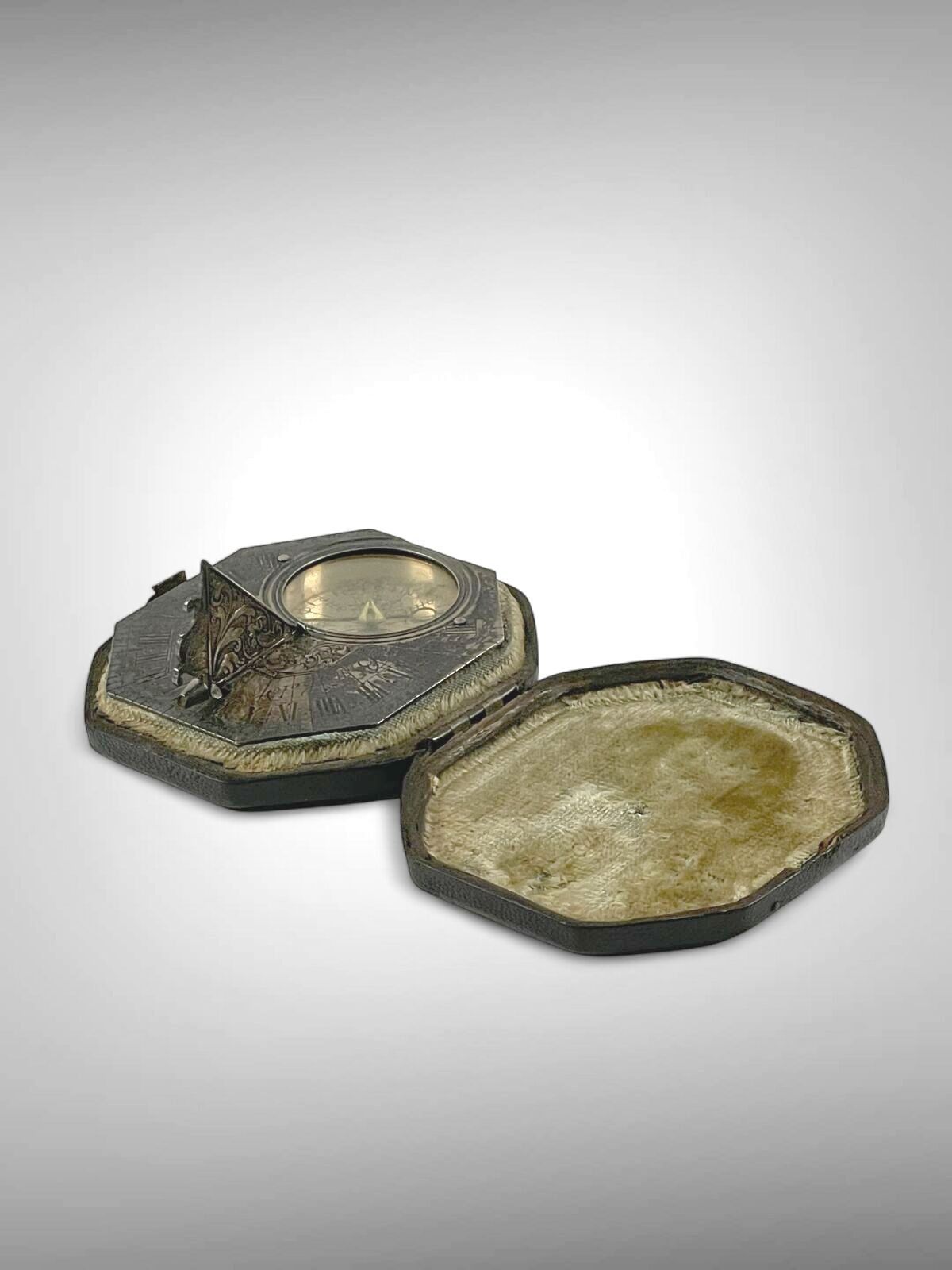 Portable octagonal equinoctial sundial in engraved platinum silver, with compass and folding gnomon engraved with floral motifs. Signed Butterfield A Paris. On the reverse, the compass bowl bears the inscription Claude Vincent 1706, probably the name of the owner, and the back of the frame bears the latitudes of the fifteen major European cities. Original shagreen case.