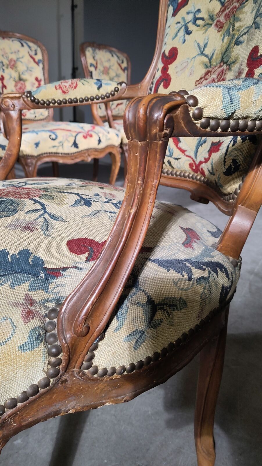 A suite of four moulded and carved beech armchairs with cabriolet backs decorated with foliage and flowers, resting on cambered legs (originally painted).