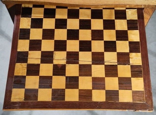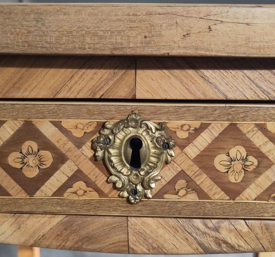 Small table in marquetry of trellises and rosettes, opening to a drawer, with a sliding shelf forming checkerboard, resting on cambered feet; (accidents, restorations and misses).