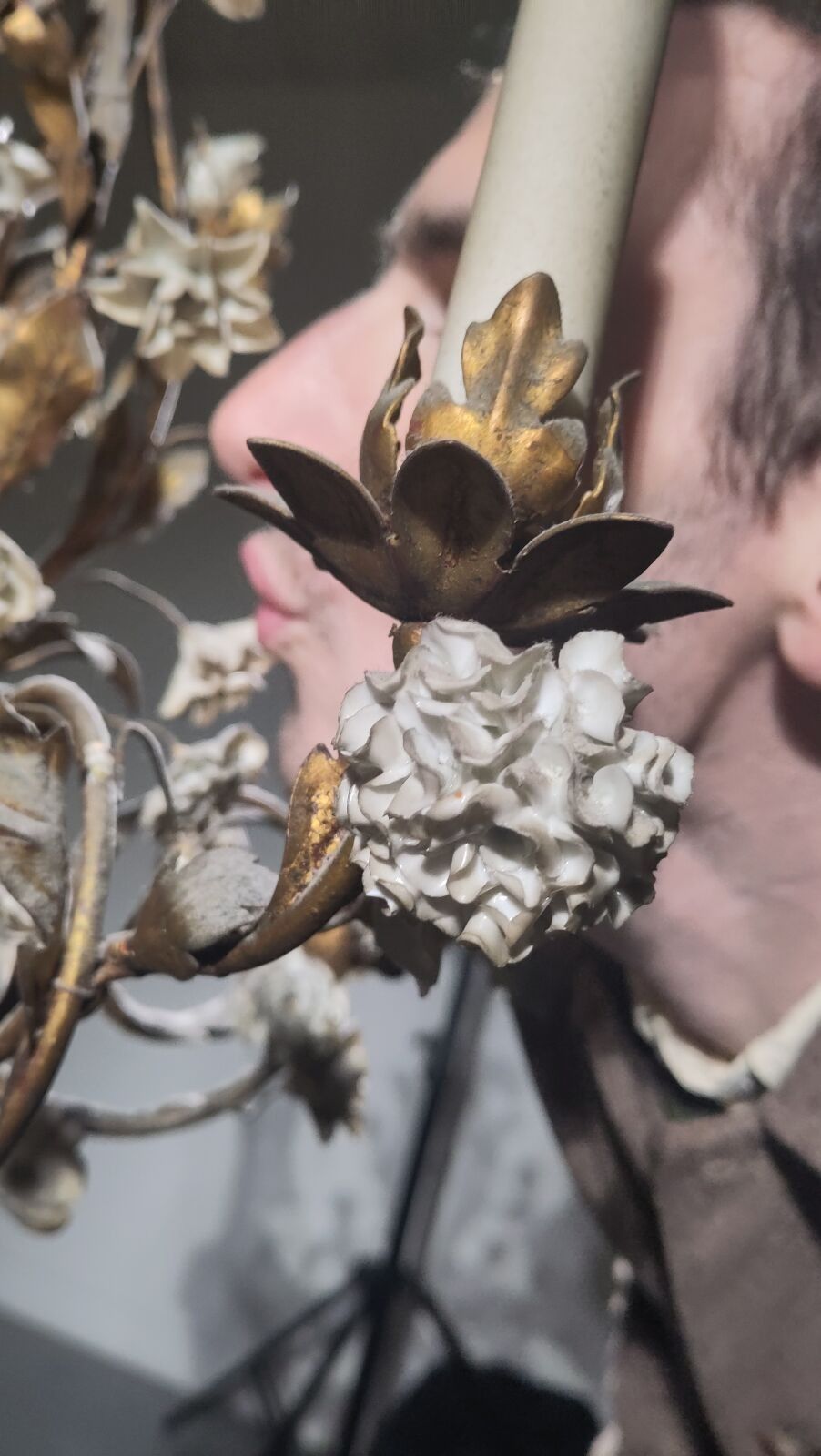 An ormolu chandelier with four arms, decorated with polychrome porcelain flowers in the Vincennes style.