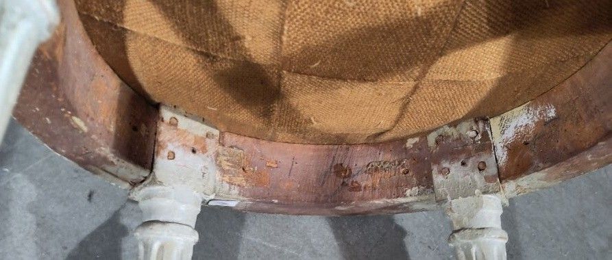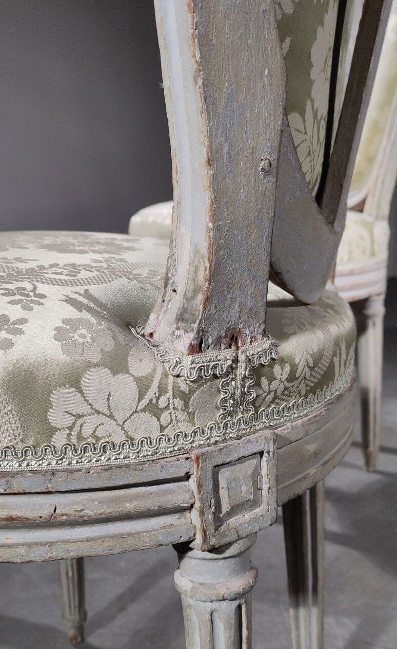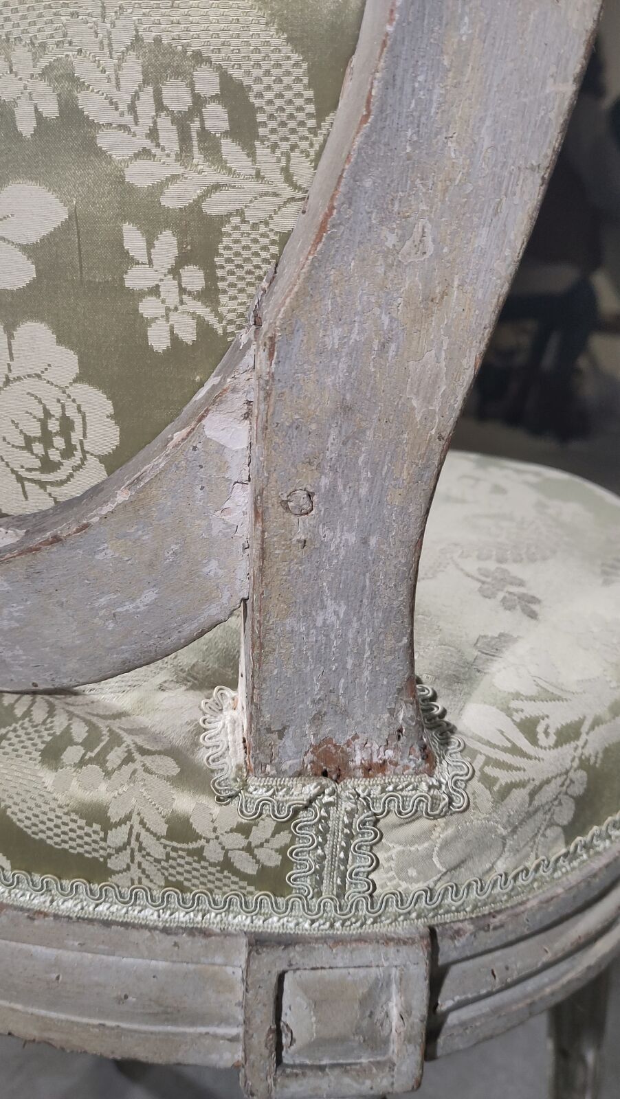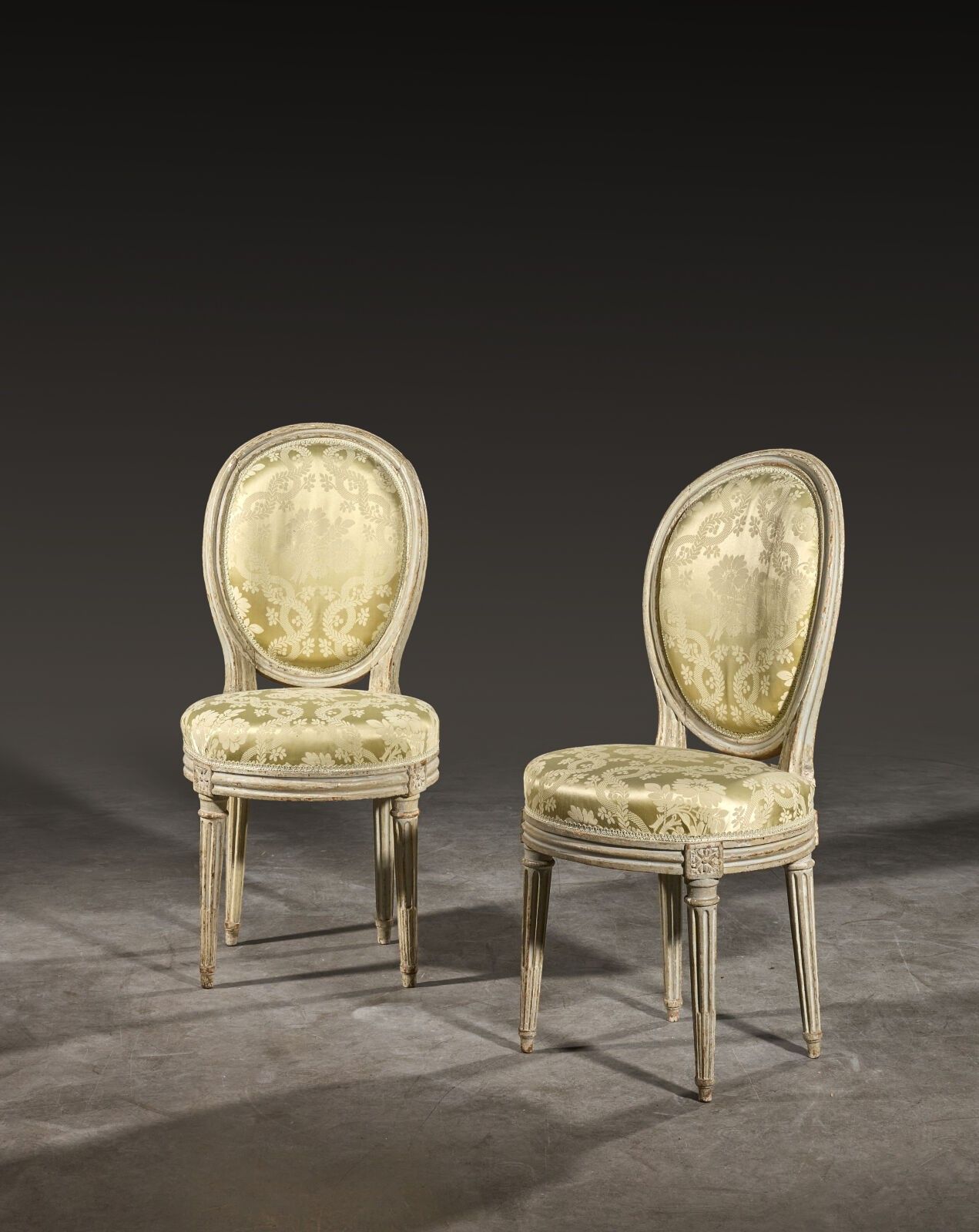 Pair of small chairs with medallion backs and circular seats, resting on tapered fluted legs; (accidents).