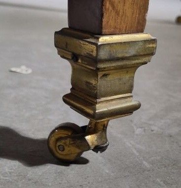 A mahogany and gilt bronze fillet dining table on sheath legs with castors.