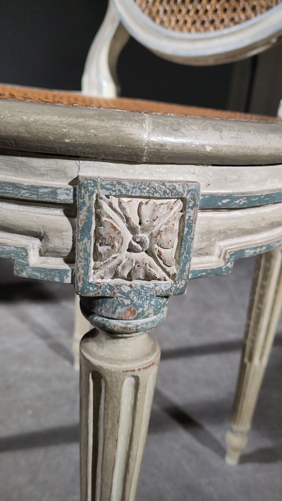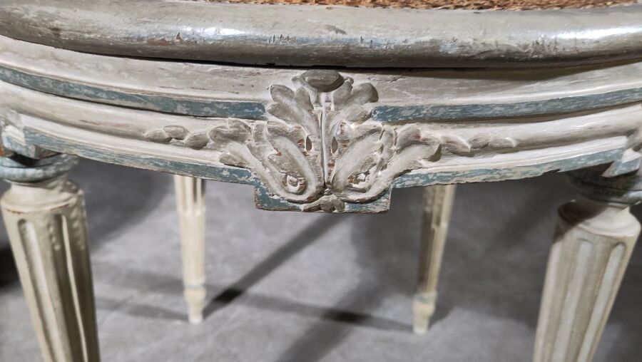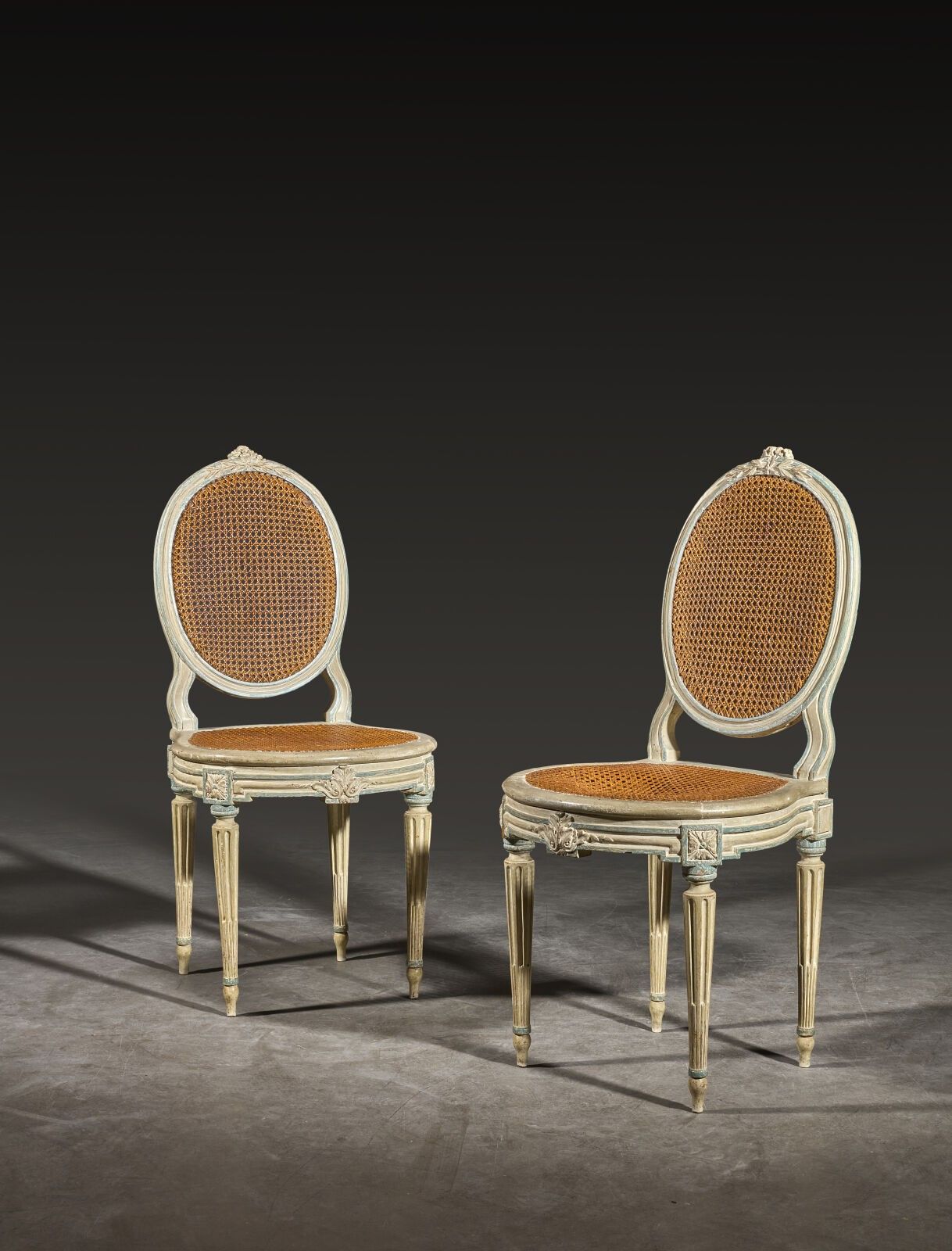 A pair of moulded, carved and painted wooden caned chairs with medallion backs and foliage decoration, resting on fluted tapering legs.