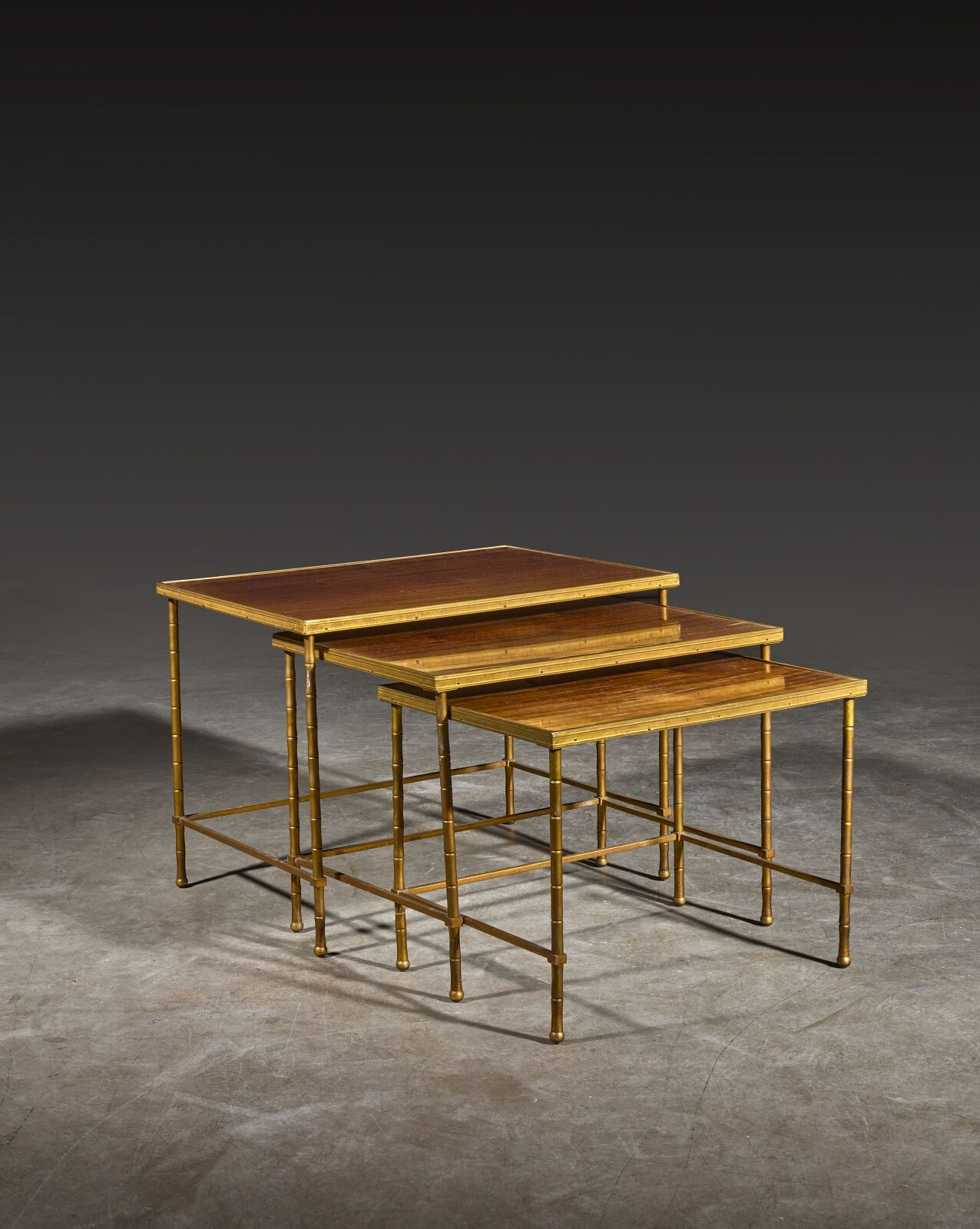 Set of three nesting tables with gilded brass imitation bamboo legs and rectangular varnished wood tops.