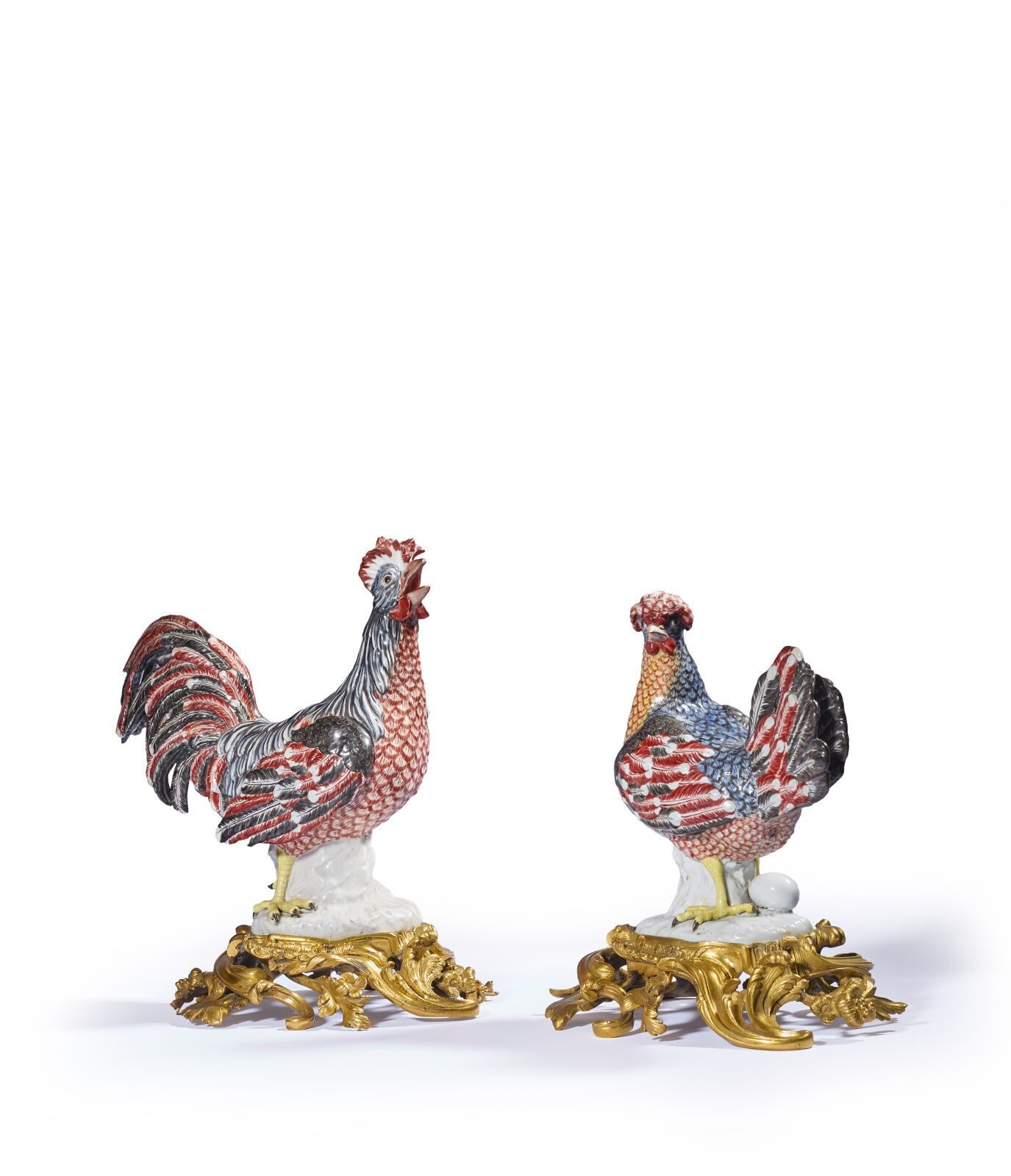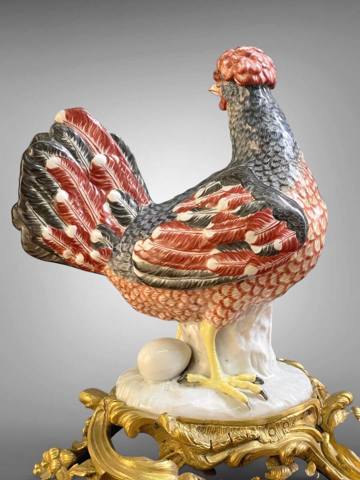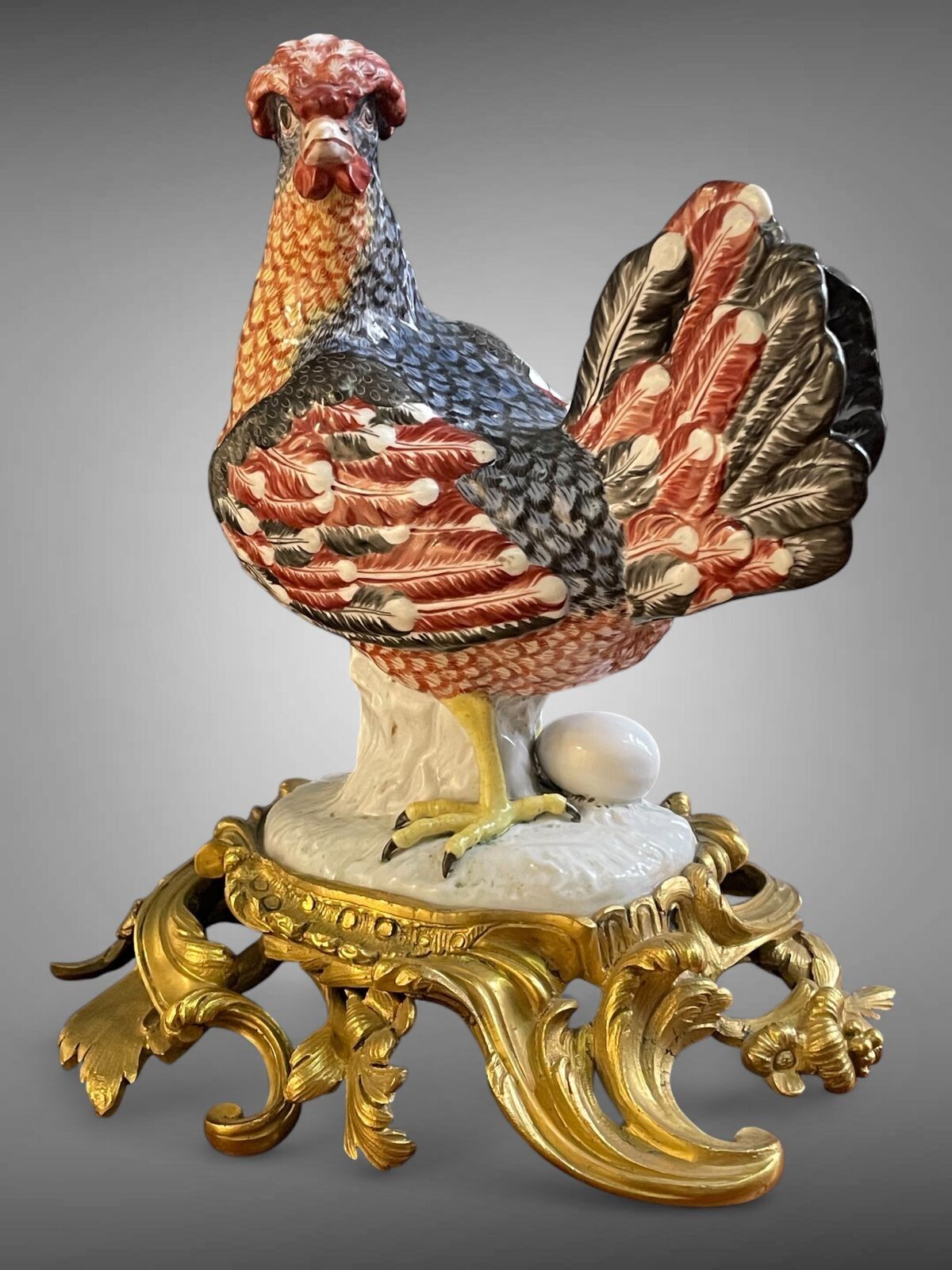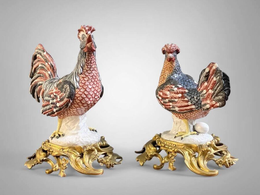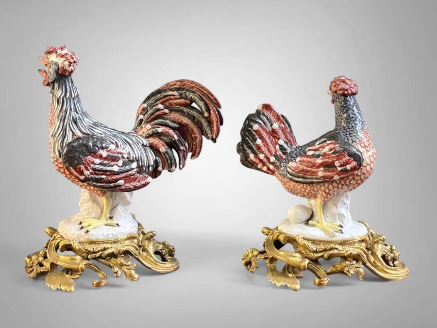 Porcelain rooster and hen with red and black plumage, standing on a mound, the hen having laid an egg.