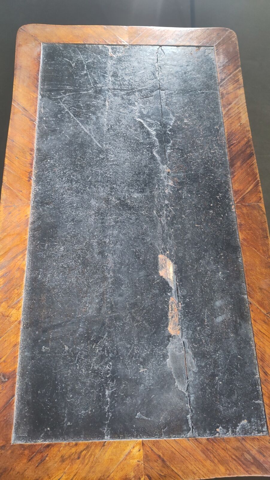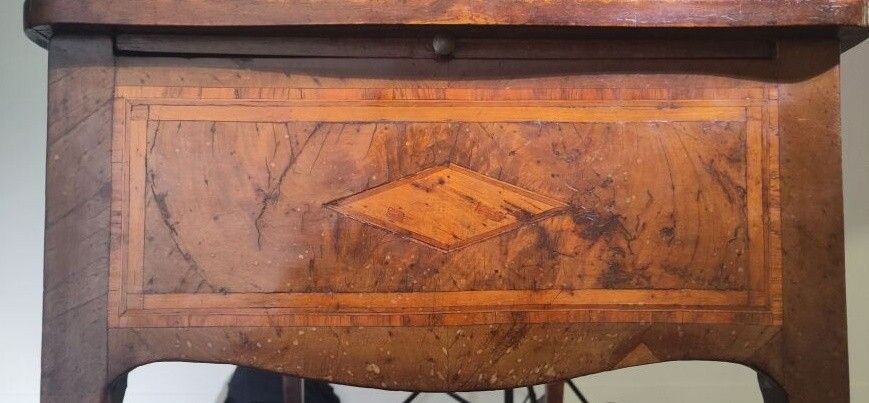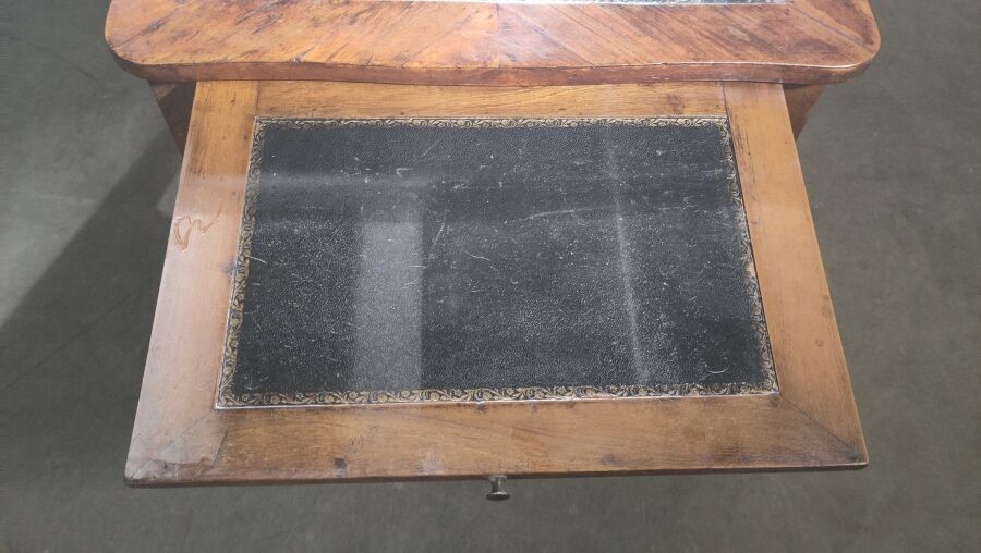 Walnut veneered desk opening to three drawers, with two sliding shelves and resting on curved legs; (accidents and restorations).