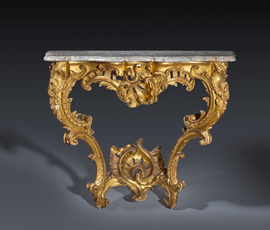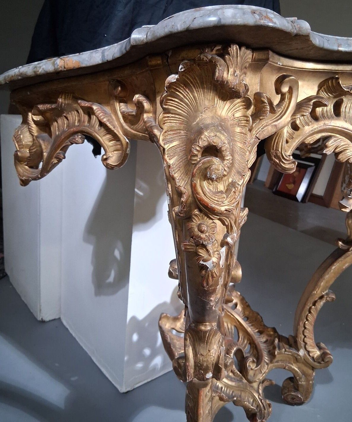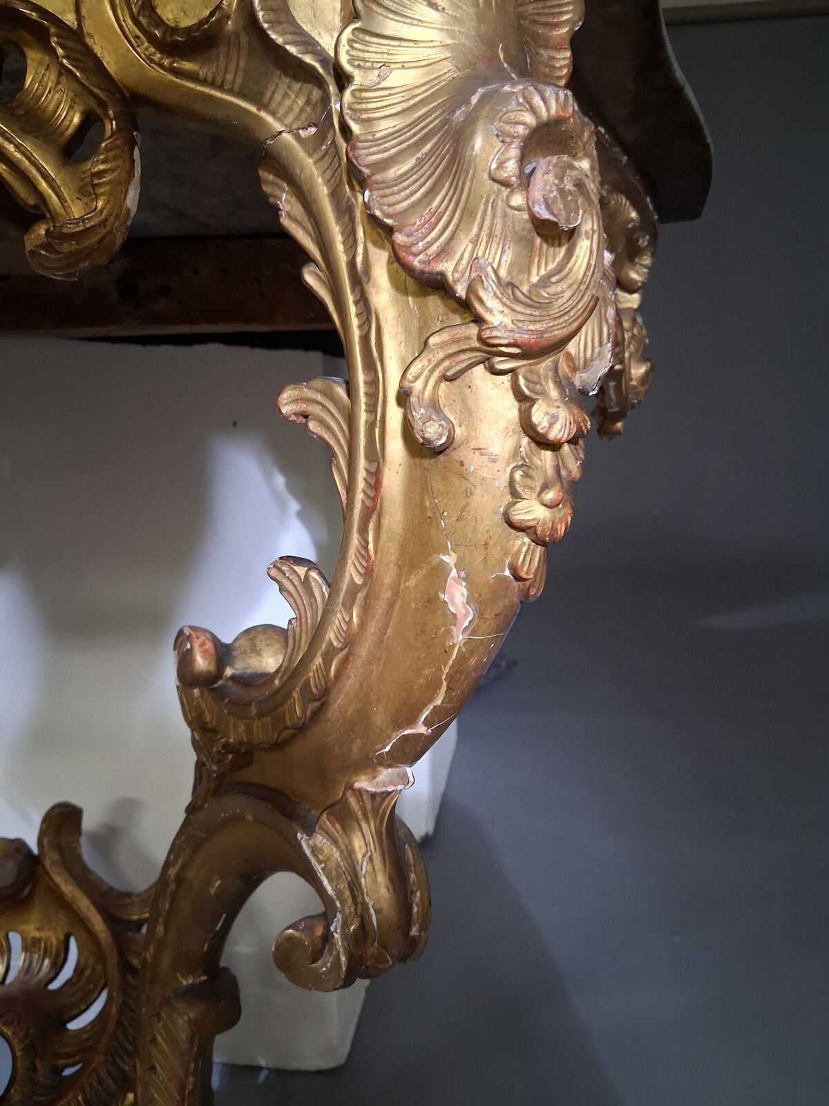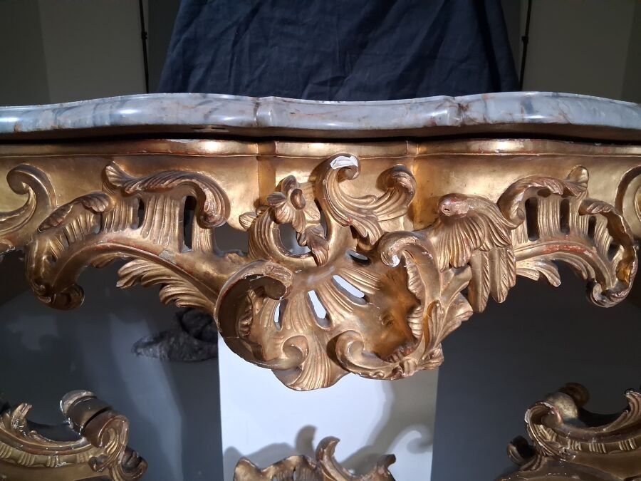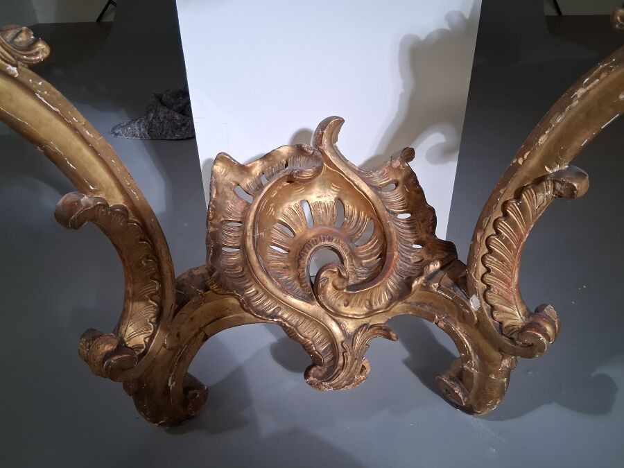 Premium A giltwood console table decorated with foliage, rocaille an…