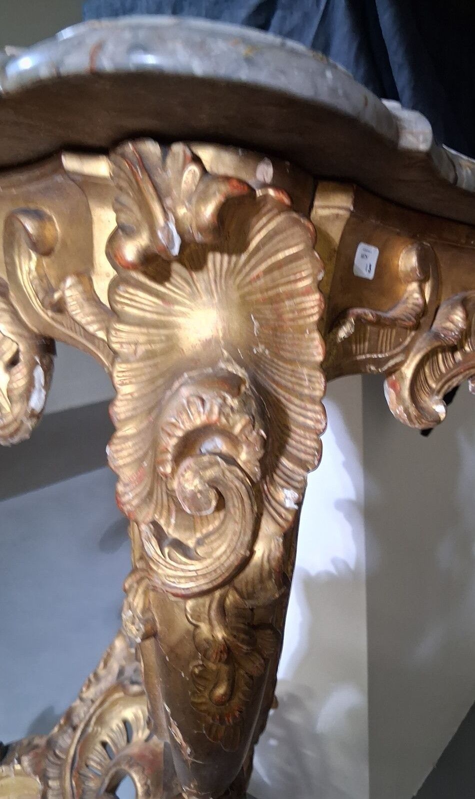 A giltwood console table decorated with foliage, rocaille and openwork oves, resting on counter-curved jambs joined by a brace; grey marble top (brought back at a later date); (accidents and restorations).