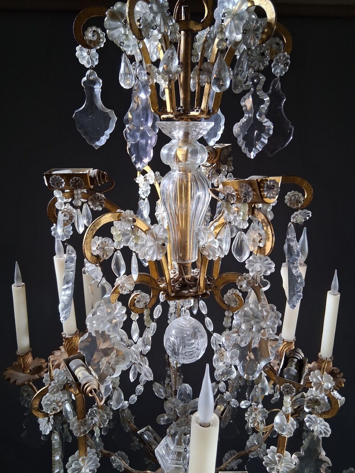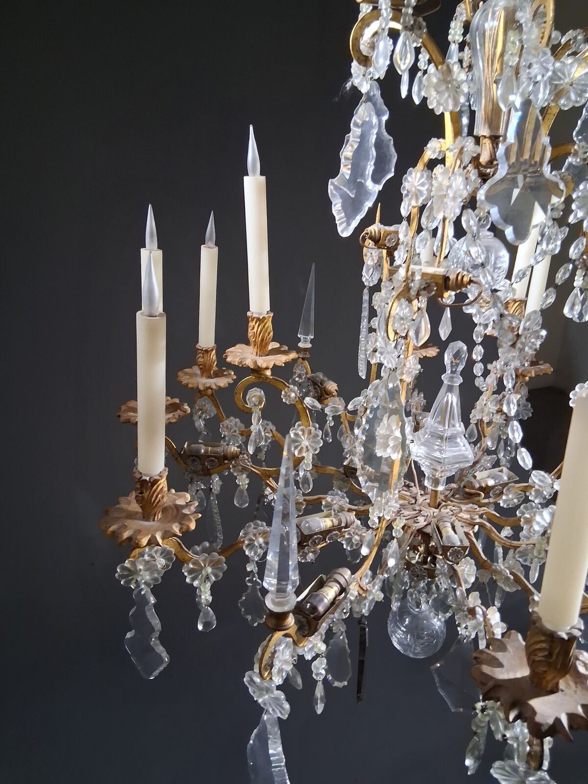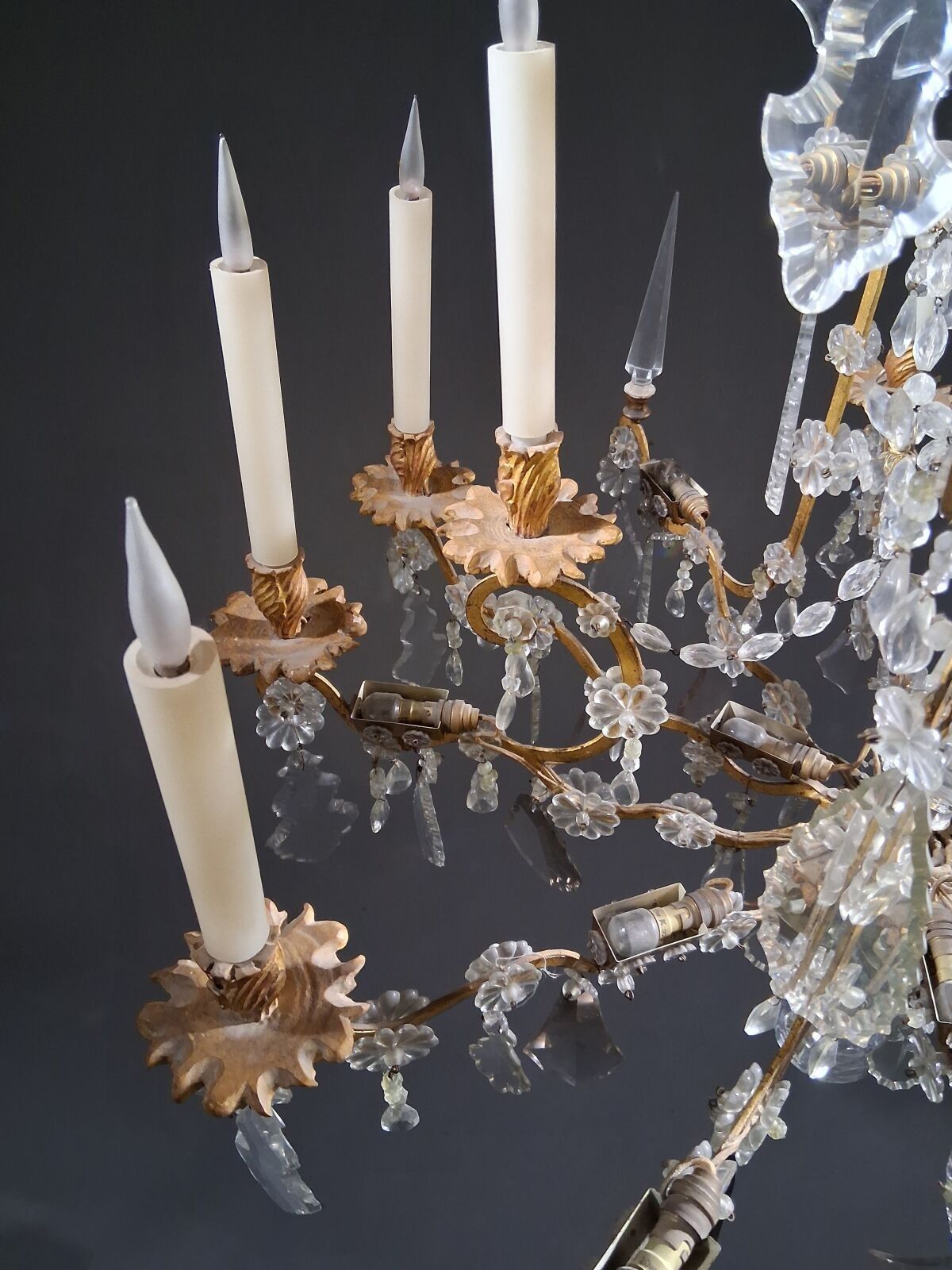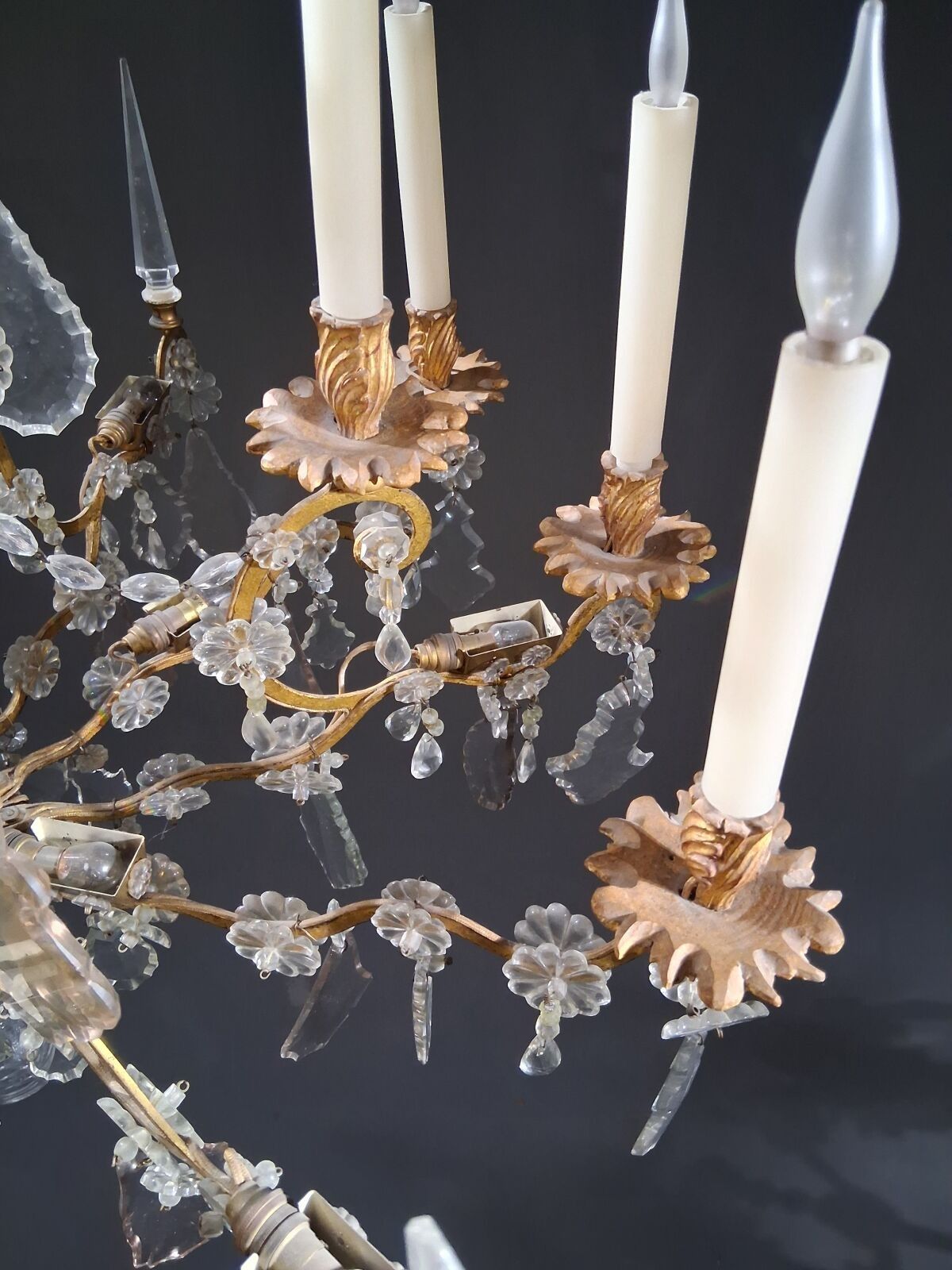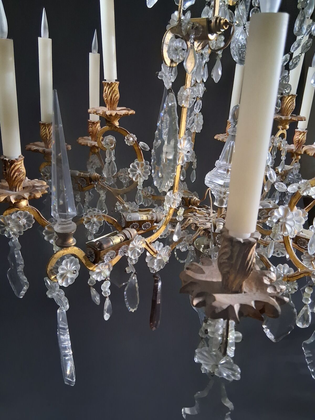 A large chandelier in gilt iron, gilt wood and cut glass, with twelve lights and decoration of pinnacles, pendants, rosettes and cabochons; (mounted electrically).