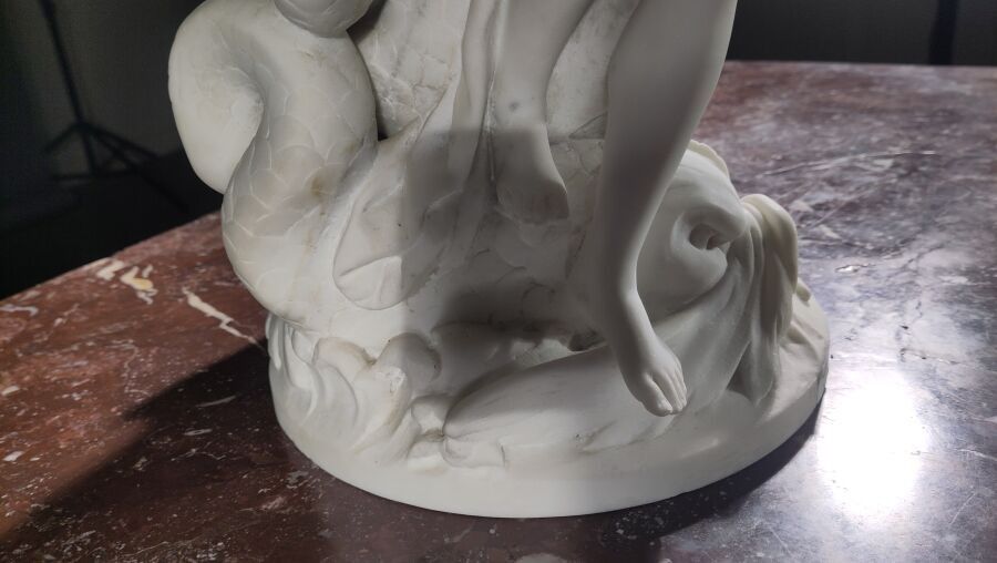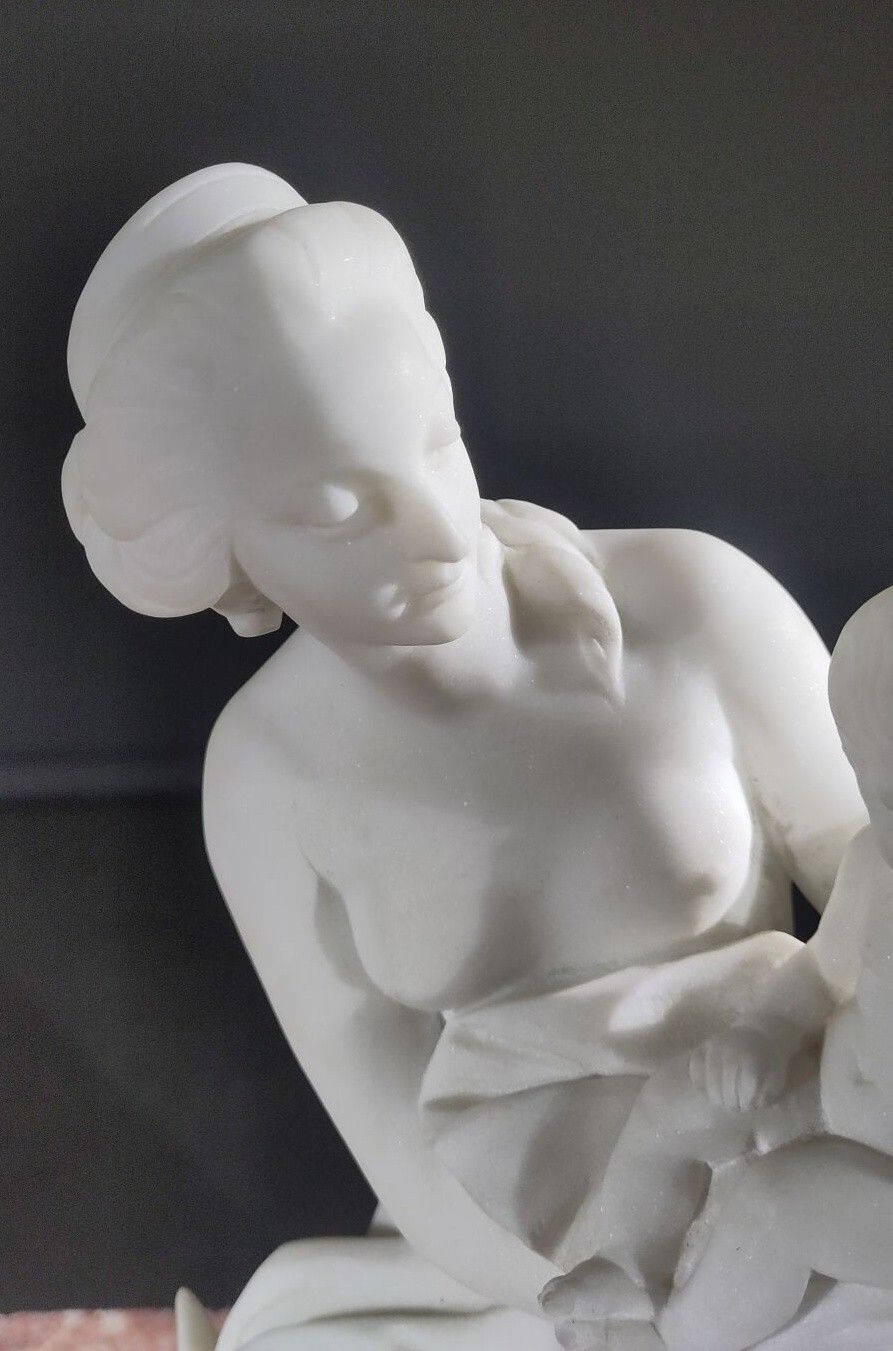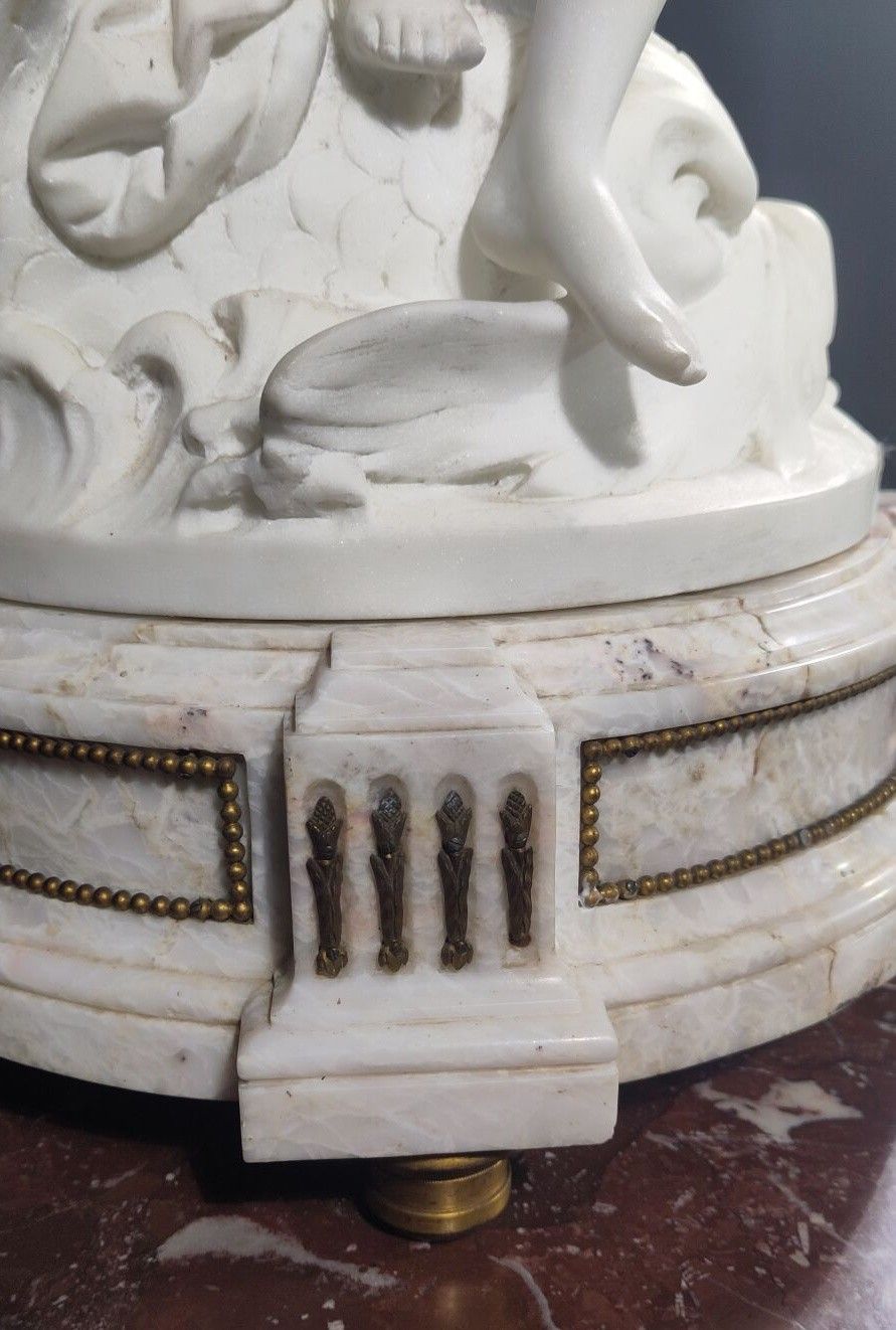 White marble subject on a veined marble base and bronze elements.