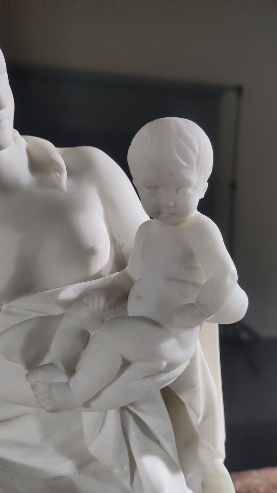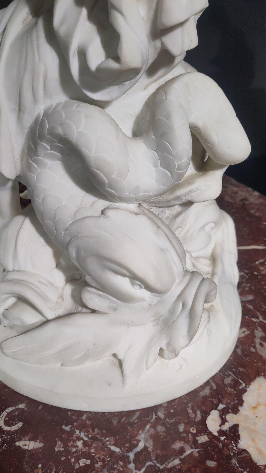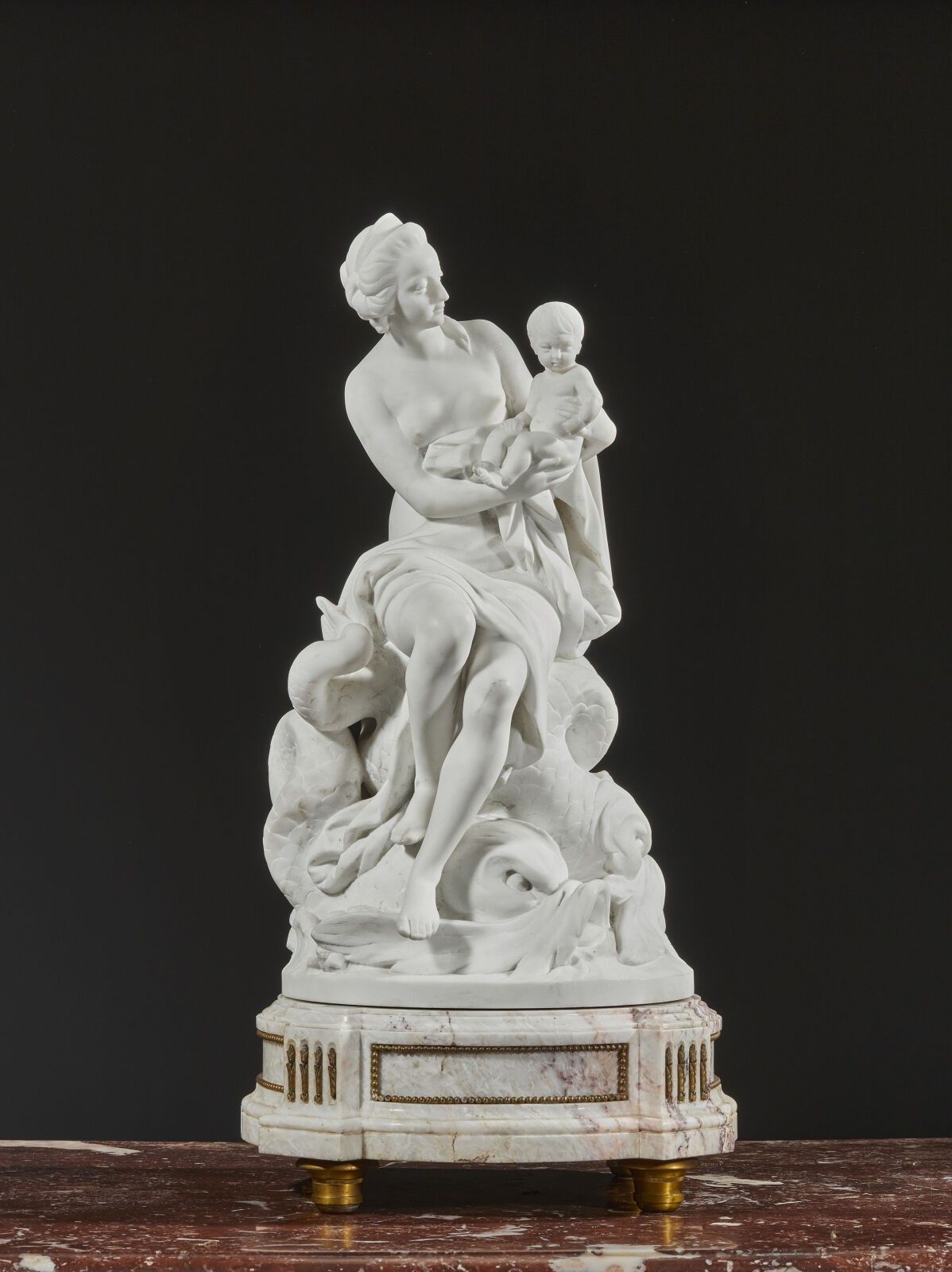 White marble subject on a veined marble base and bronze elements.