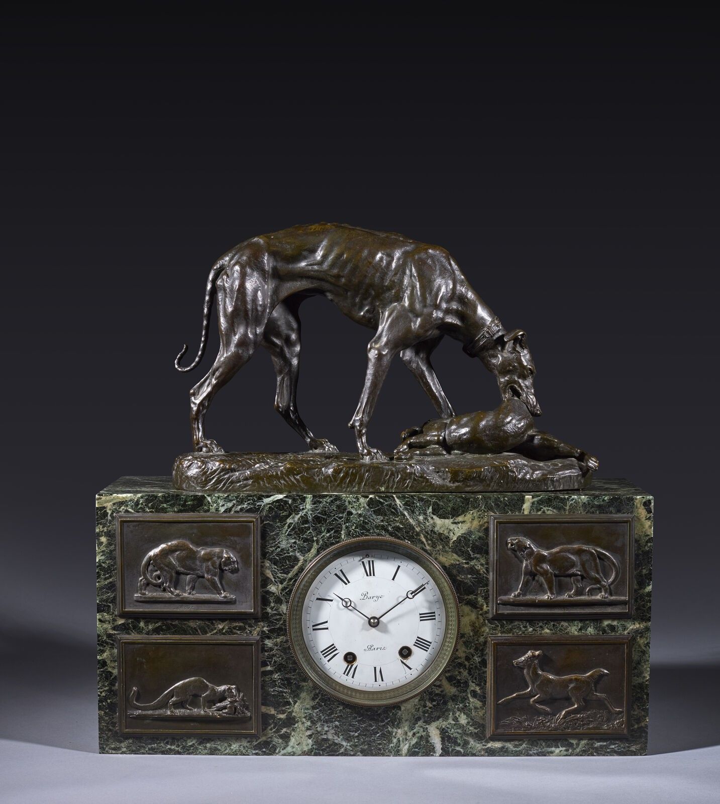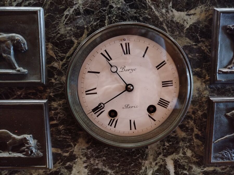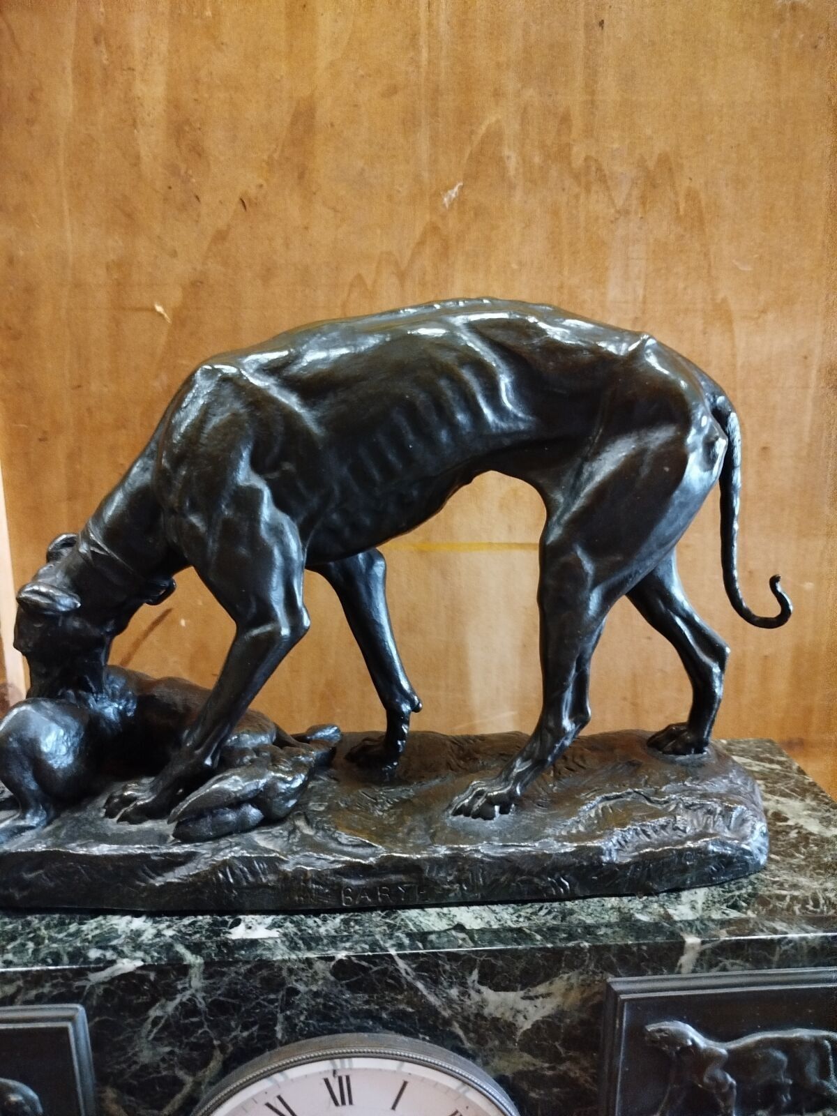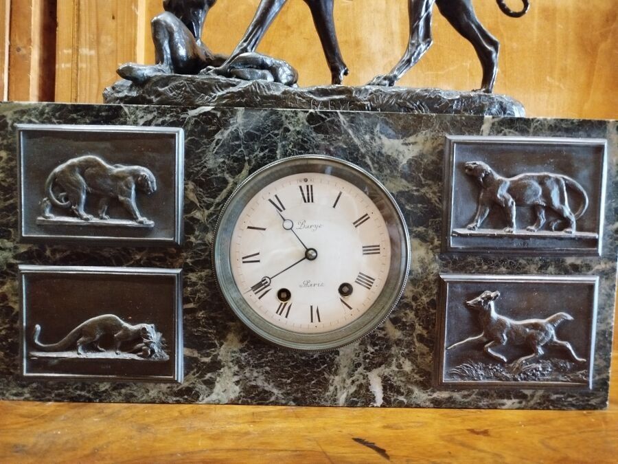 Green veined marble clock decorated with patinated bronzes after Antoine-Louis BARYE (1796-1875) representing, at the top, a greyhound holding a dead hare and, on the front, four reliefs decorated with panthers and stags.