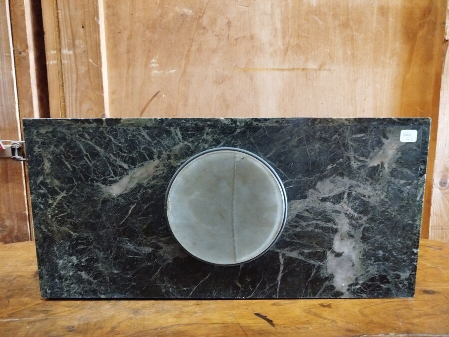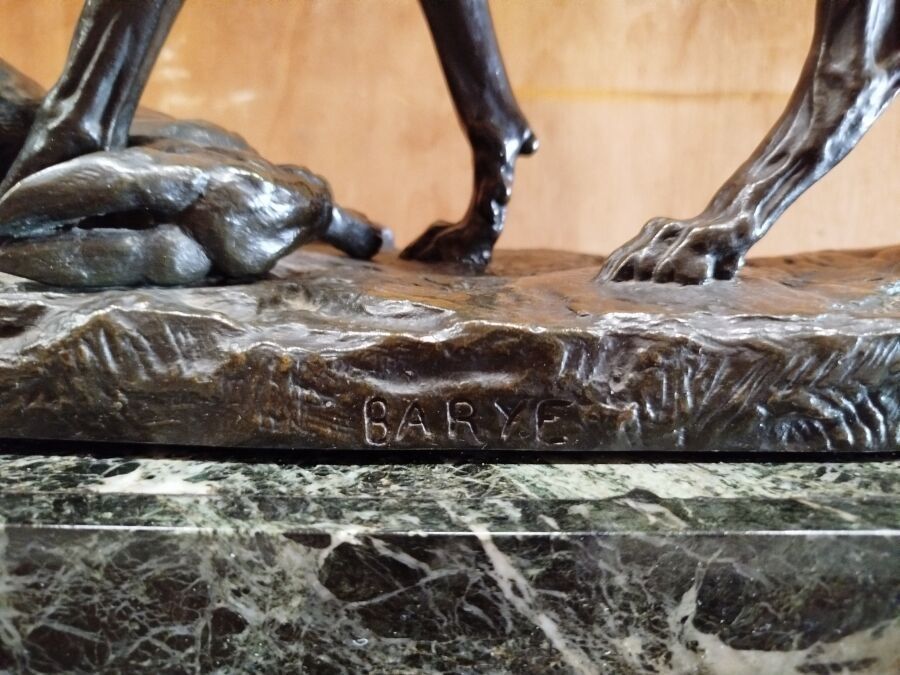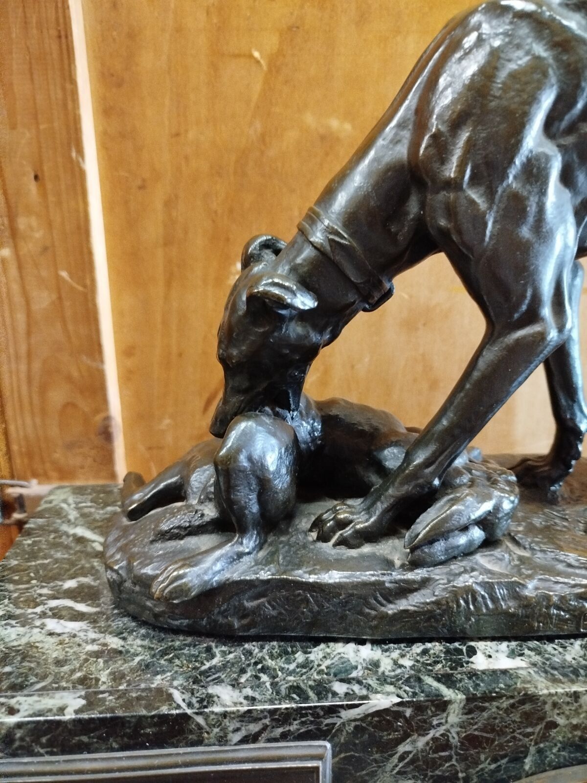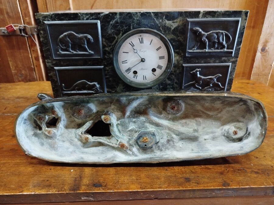 Green veined marble clock decorated with patinated bronzes after Antoine-Louis BARYE (1796-1875) representing, at the top, a greyhound holding a dead hare and, on the front, four reliefs decorated with panthers and stags.