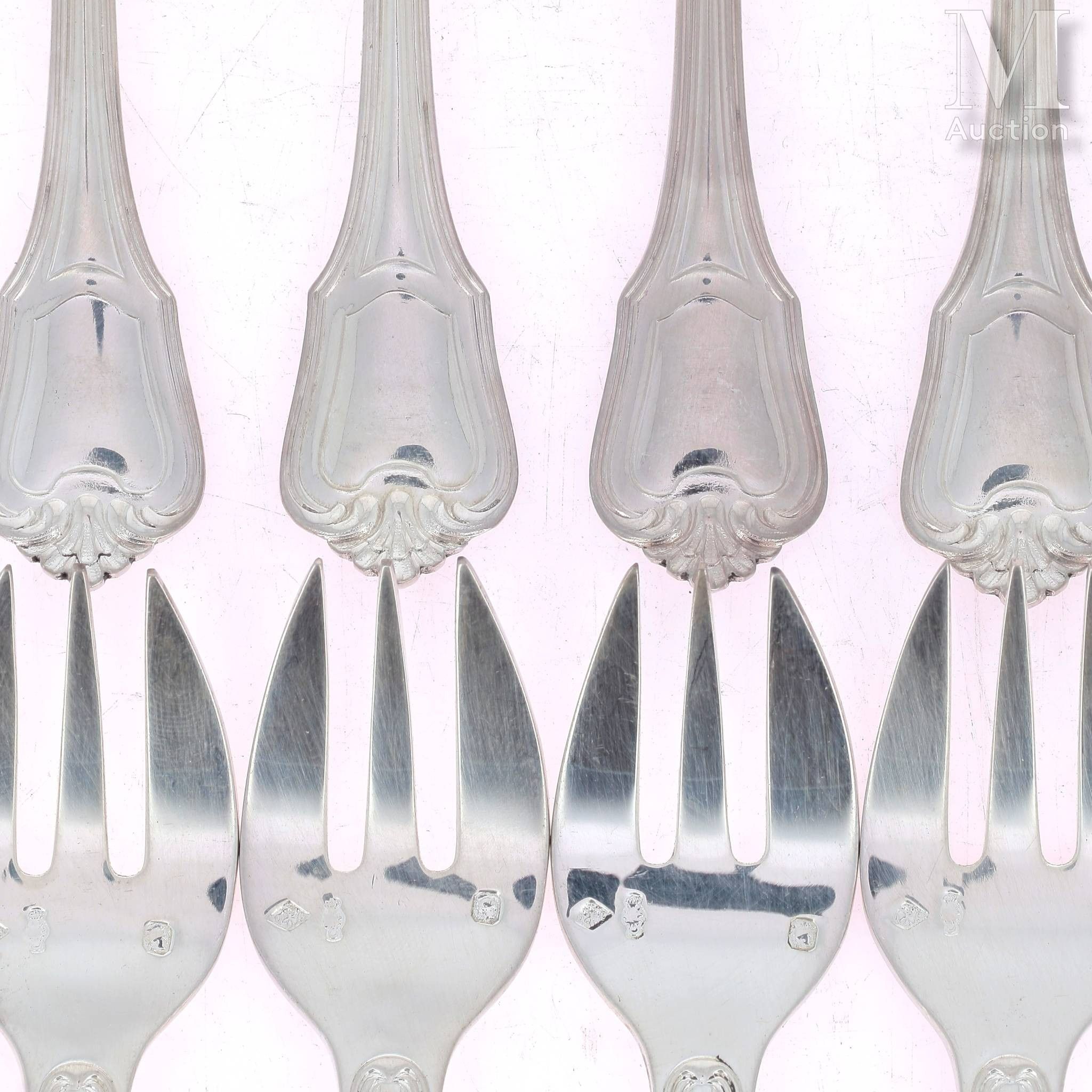 CHRISTOFLE, 20th century 12 silver oyster forks Port Royal" model. Minerve hallmark, 1st title, for 950 thousandths silver. OC hallmark, a bee and three stars, for Christofle after 1932. Mid 20th century. Length : 12.8 cm Net weight: 320 g