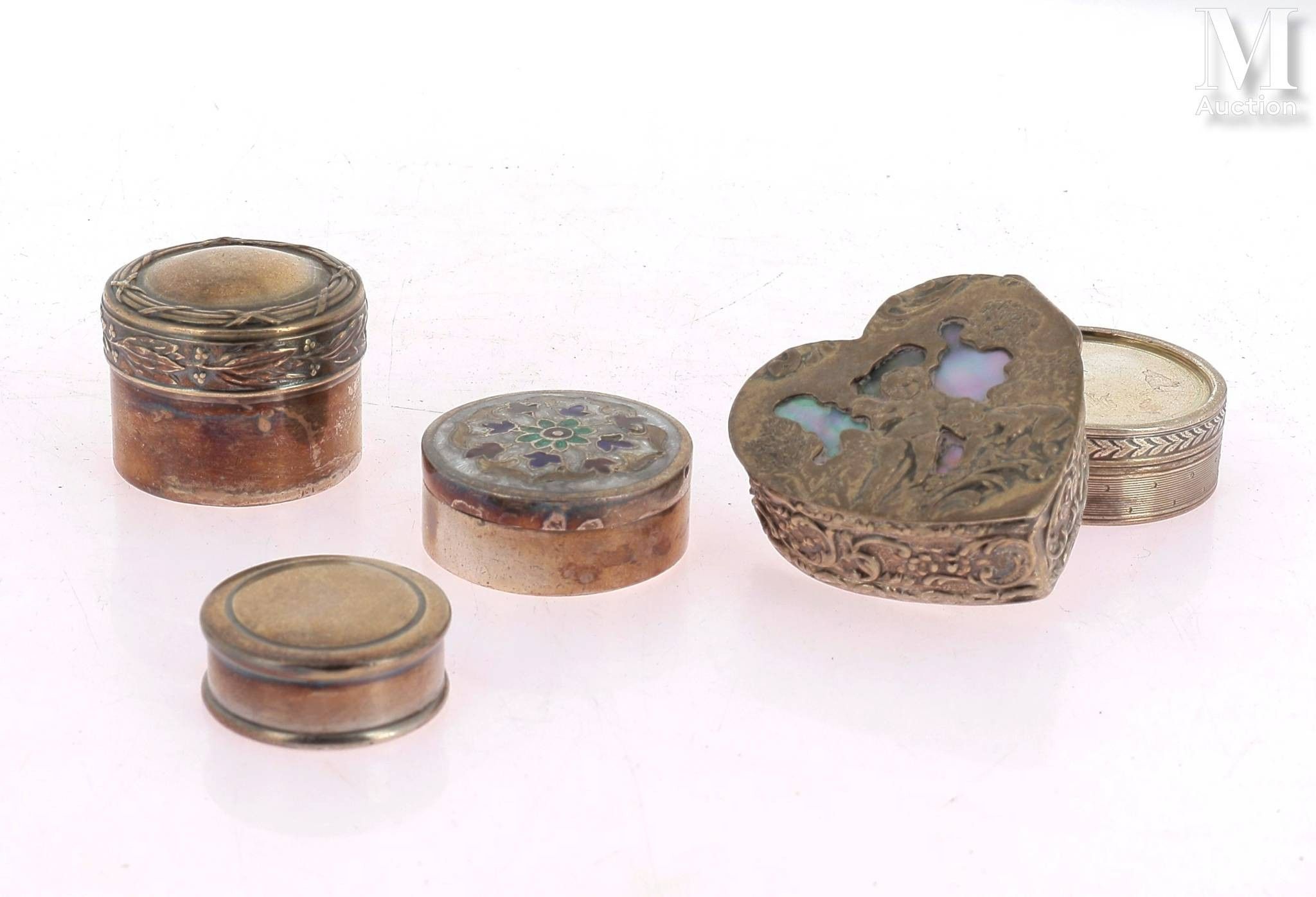 - An 800°° silver and mother-of-pearl box in the shape of a heart decorated with flowers and foliage. The lid features putti in front of a landscape.