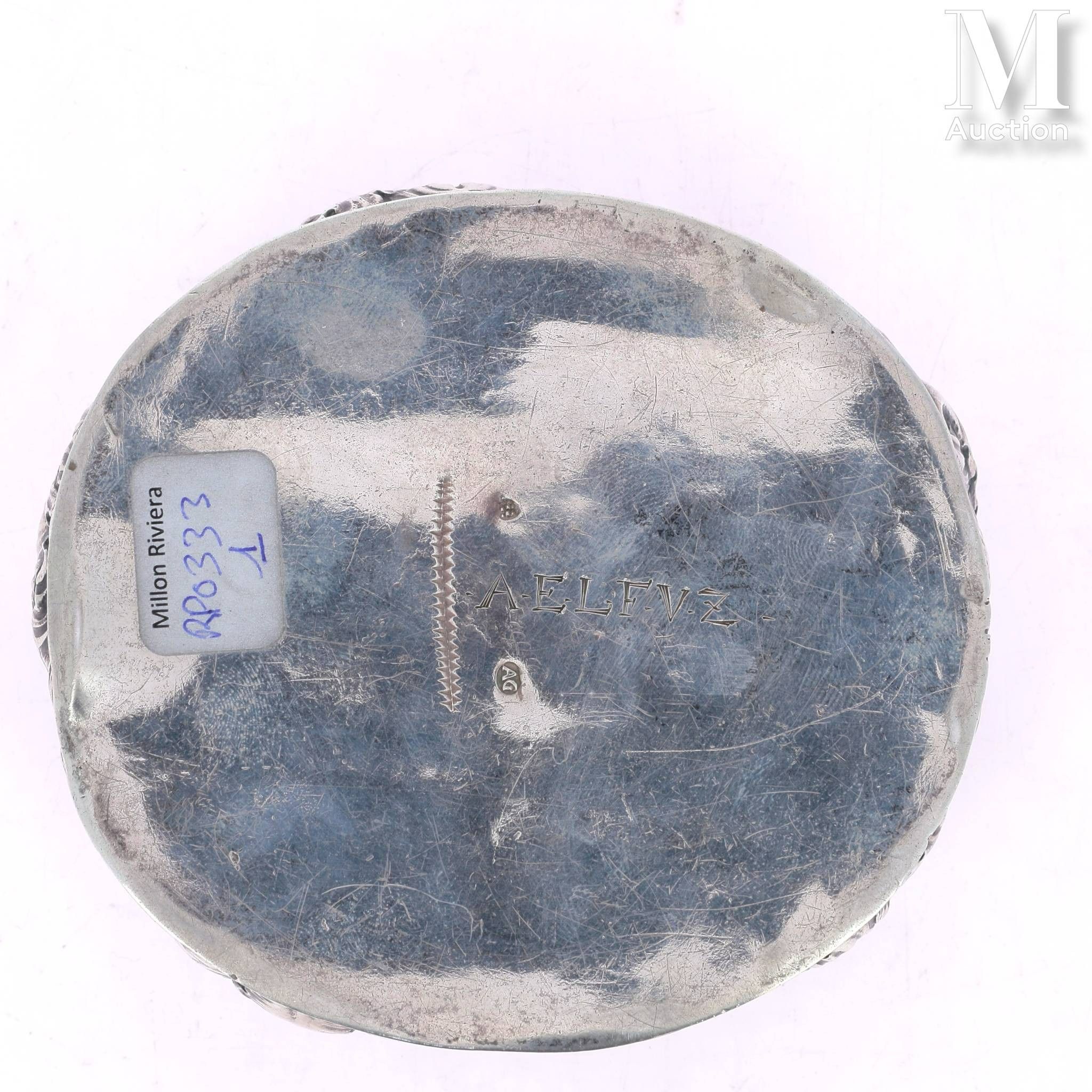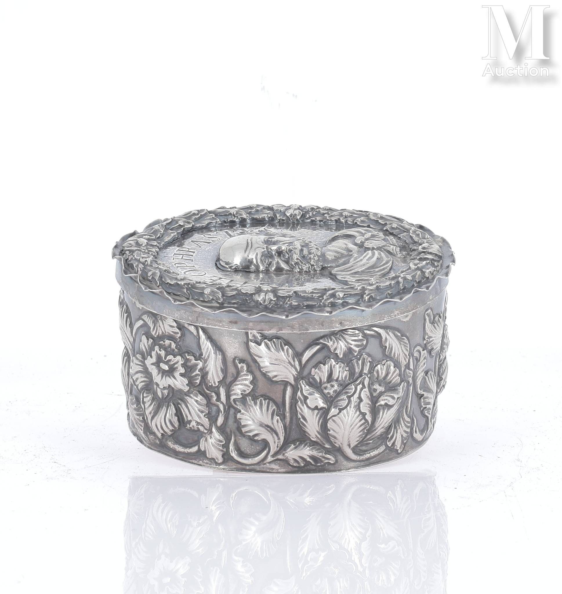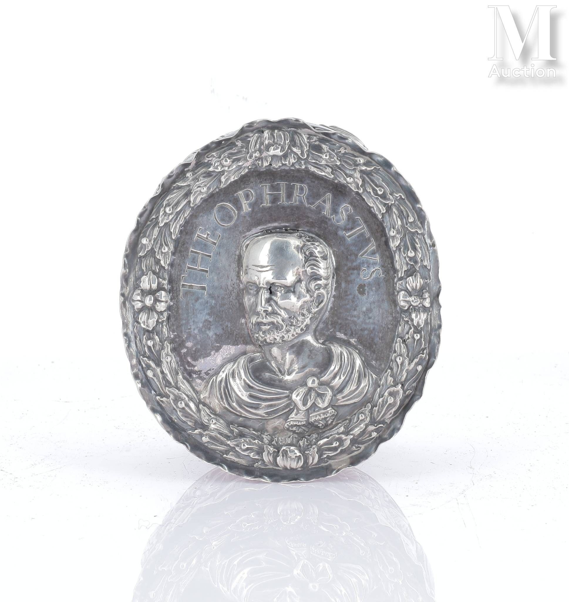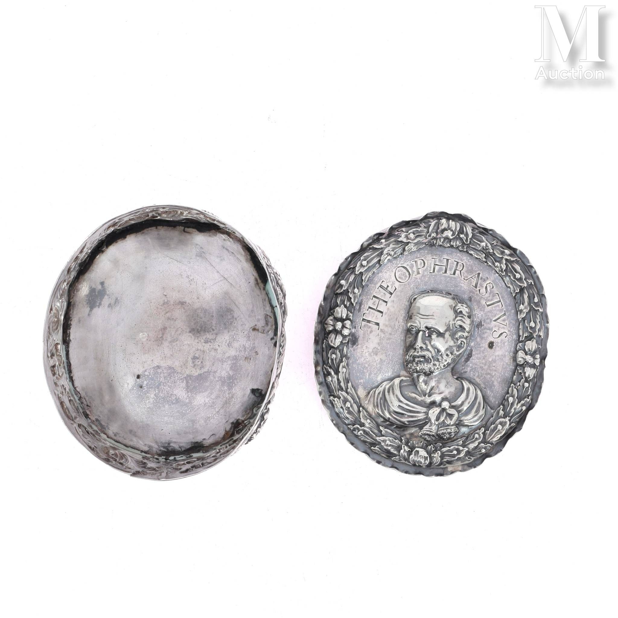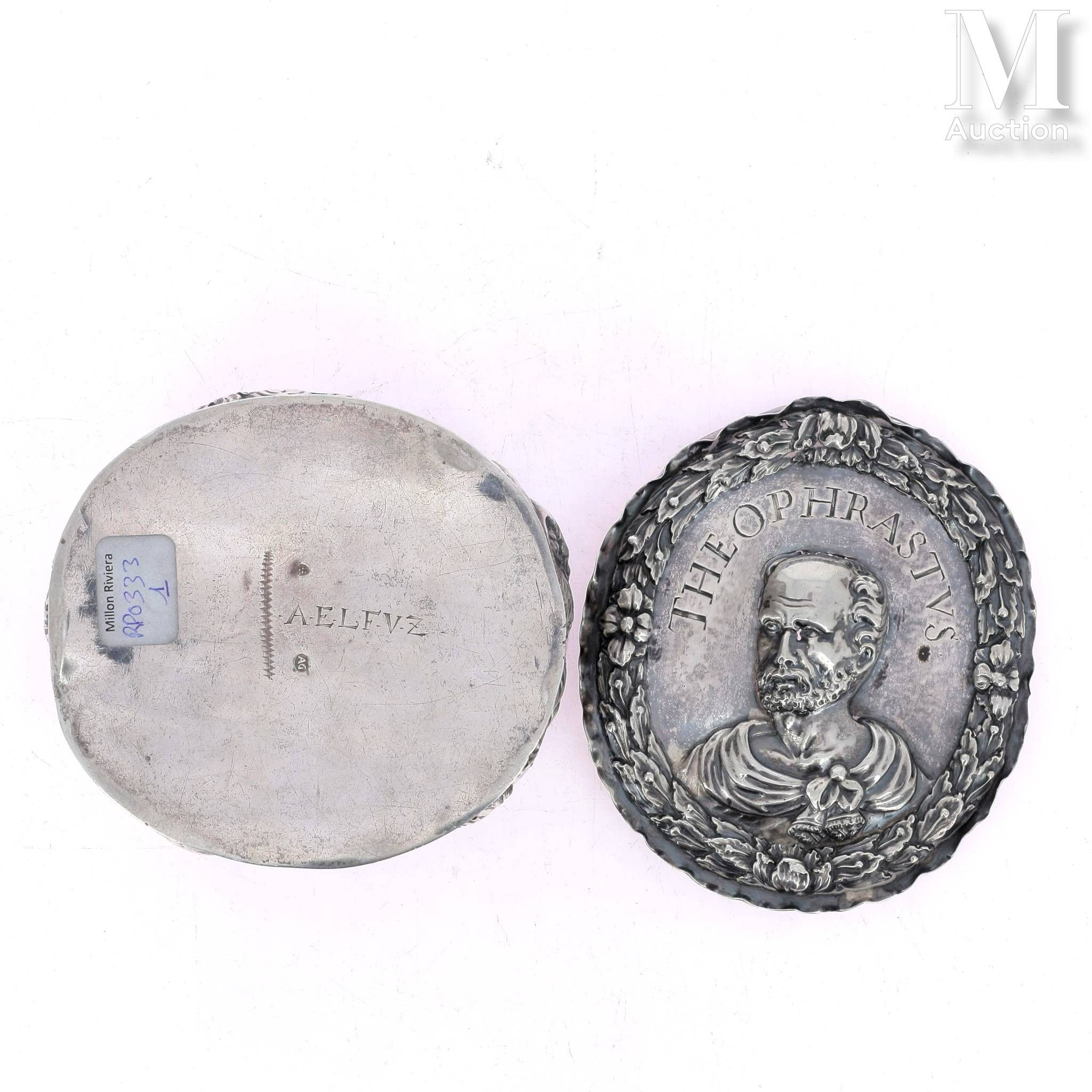 Silver box, oval shape, the body embossed with interlacing flowers in a rotating frieze, the lid decorated with a bas-relief embossed portrait of the philosopher Theophrastus, surrounded by a braid of laurel in the manner of a medallion, and wavy border. Letters "AELFVZ" engraved under the base.