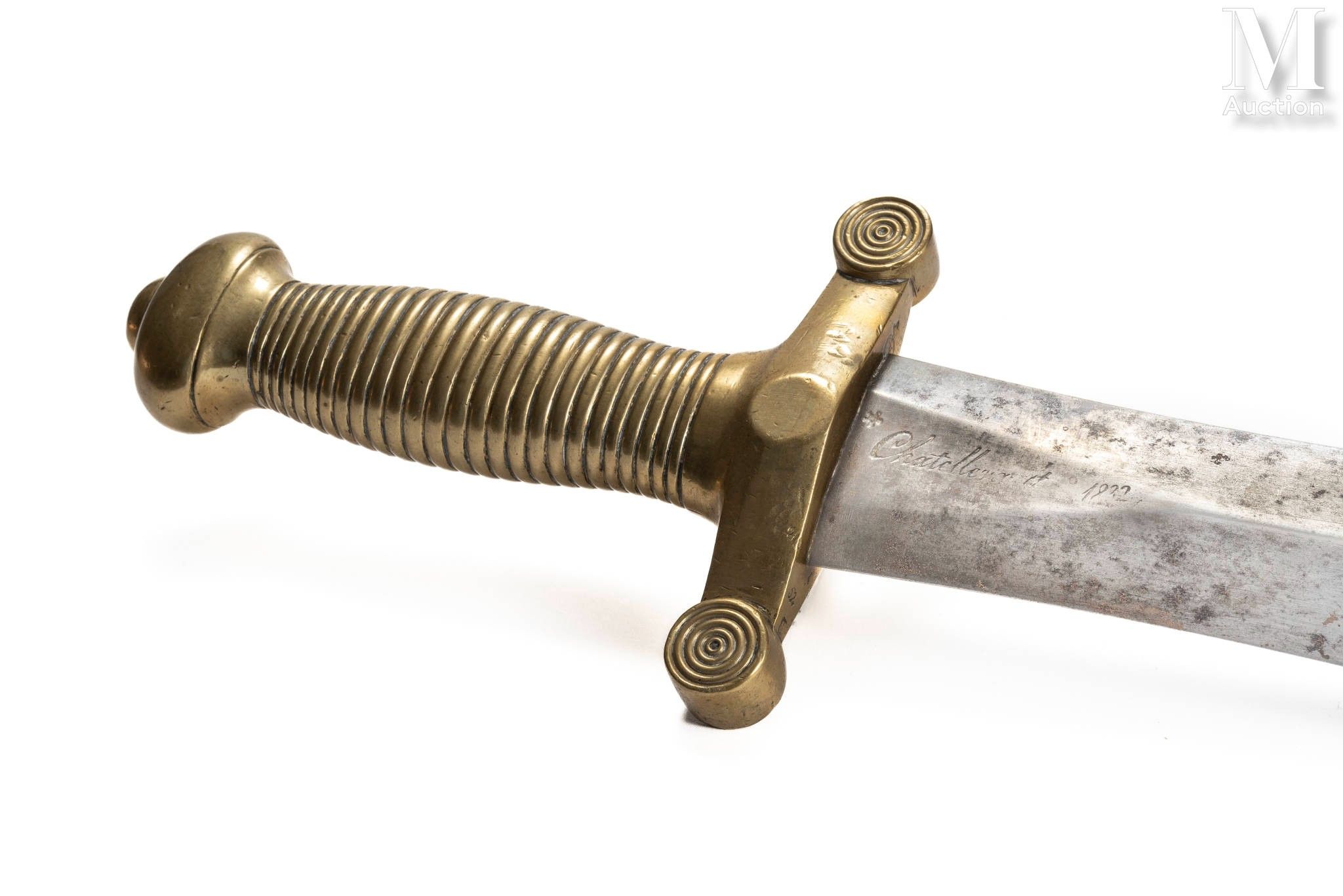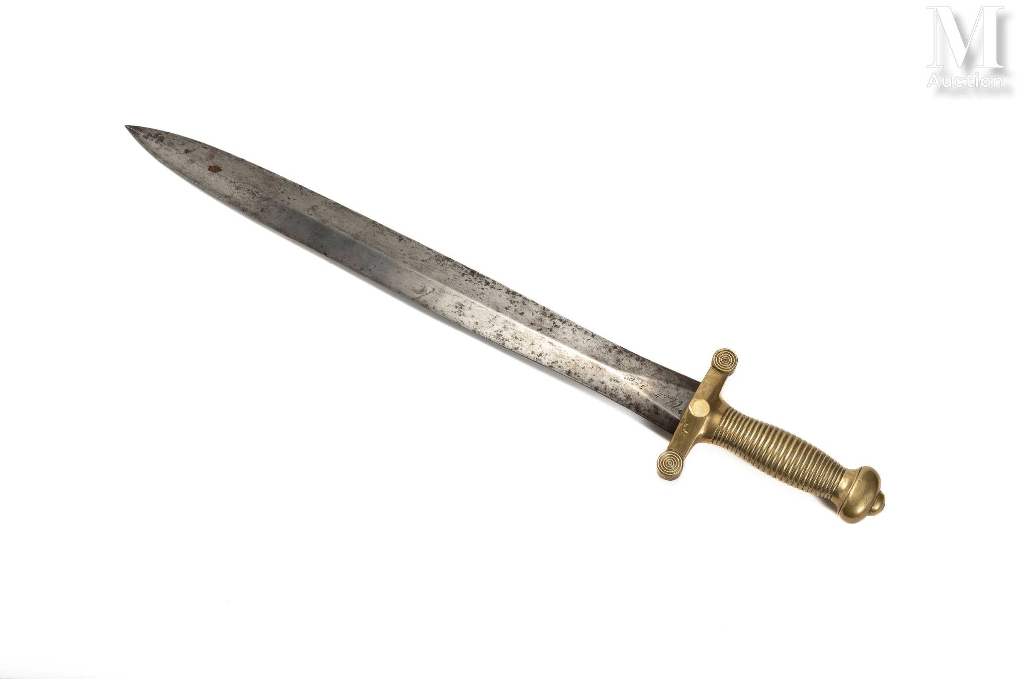 Bronze handle, guard with two straight quillons, hallmarked on the underside. Blade with median edge, hallmarked at the heel, with remains of markings of Châtellerault 1833 and Pihet Frères.