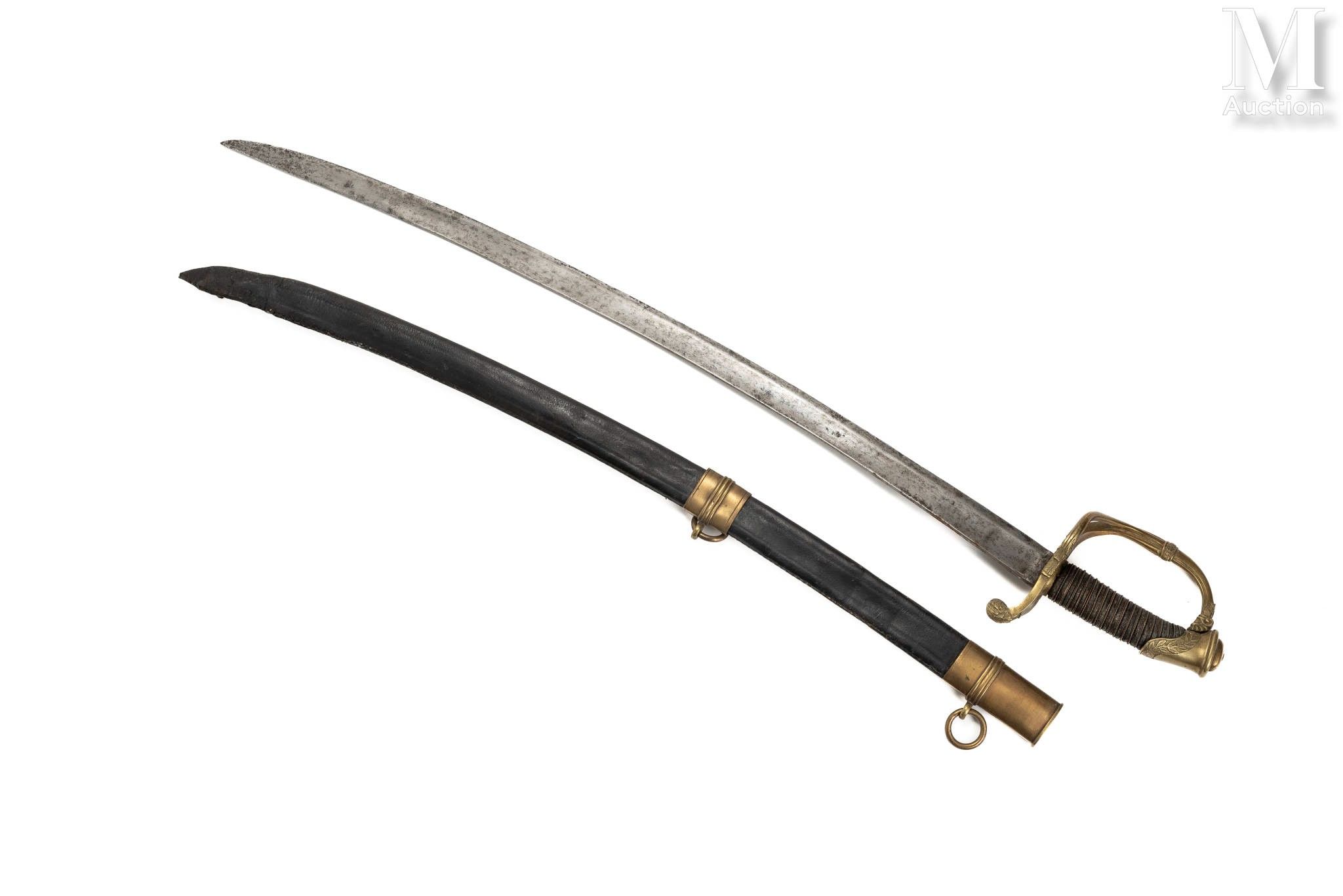 Brass mounting, chased two-prong hilt. Curved blade with flat back and hollow sides (pitting).