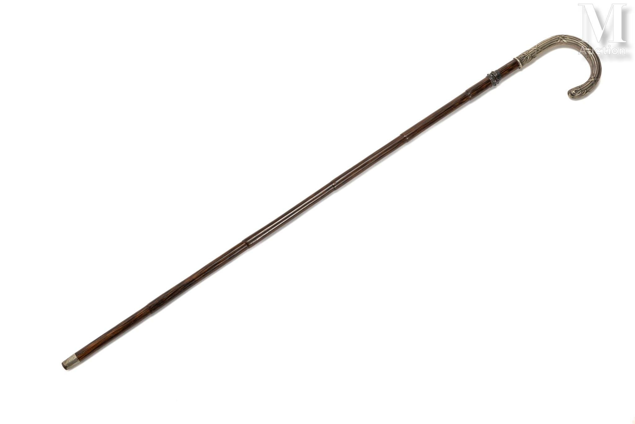 Elegant sword-stick in exotic wood and silver-plated metal, the pommel with ribboned rushes and acanthus leaves, the blade engraved with interlacing and signed "TOLEDO".