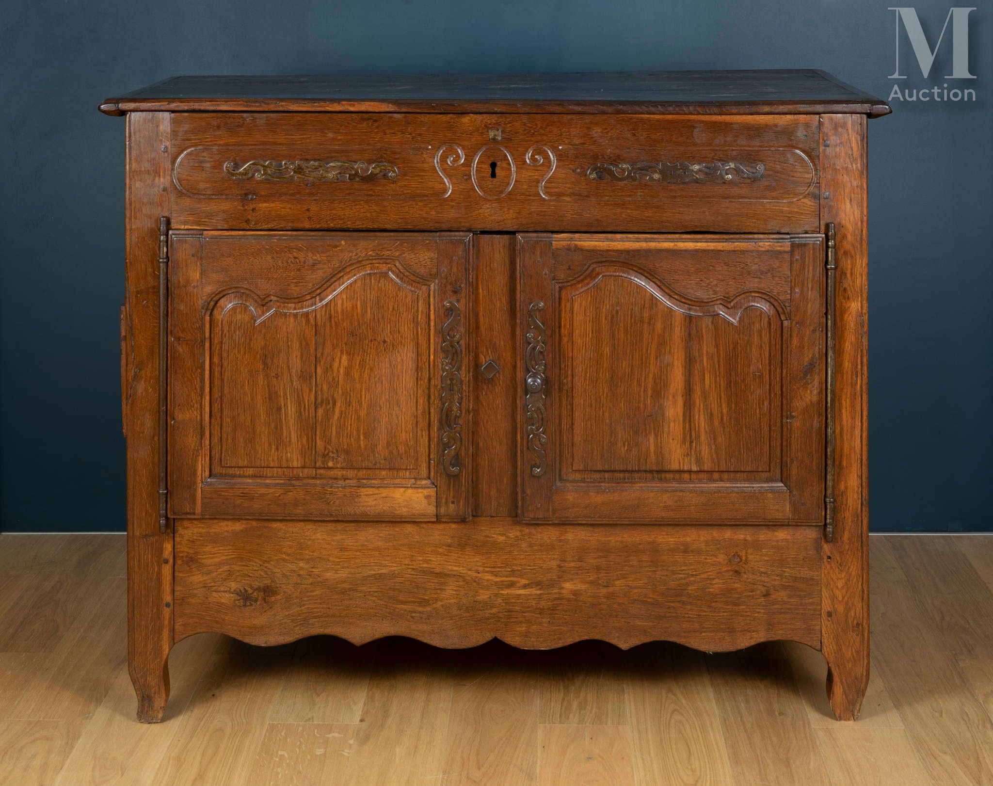 Natural moulded wood, opening with two doors and a drawer. Rectangular top and cut-out belt. Lateral trapdoor opening by a slide.