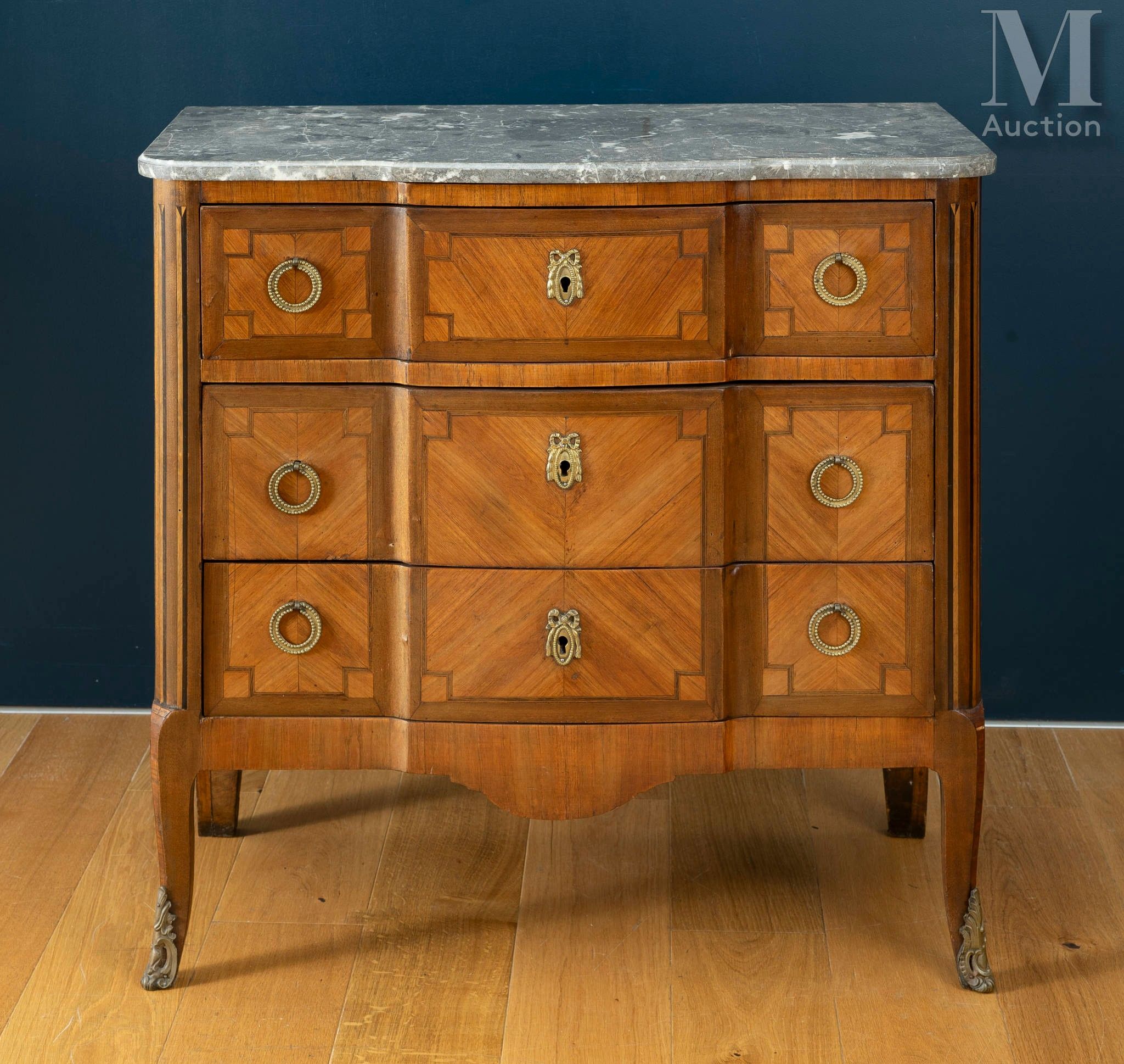 Wood and wood veneer of various species, opening with three drawers in front decorated with marquetry fillets and diamond-shaped frieze.