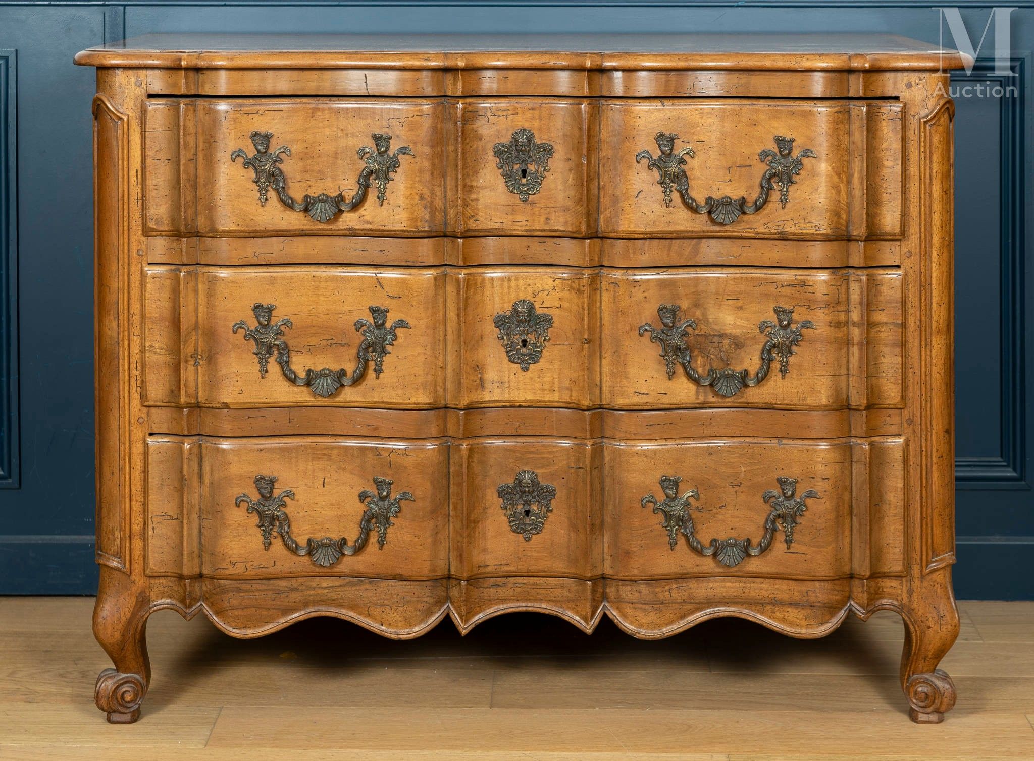 Natural moulded wood, opening with three drawers, wooden top, curved belt and curved legs.