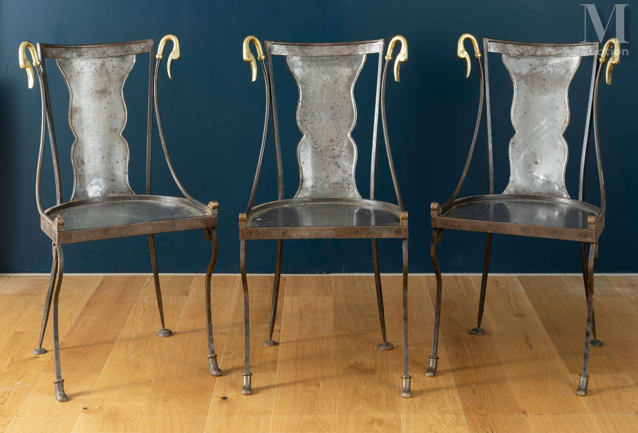 Patinated metal, concave back with swan-necked uprights and slender curved front legs with claws.