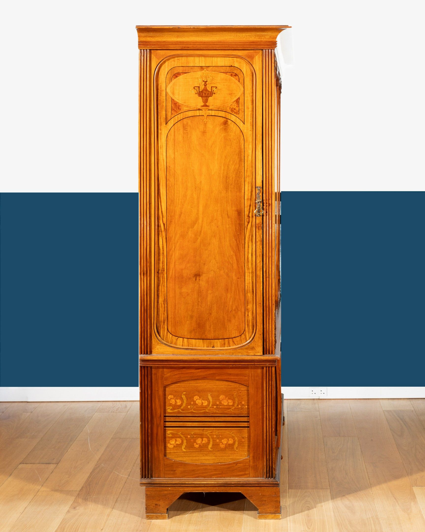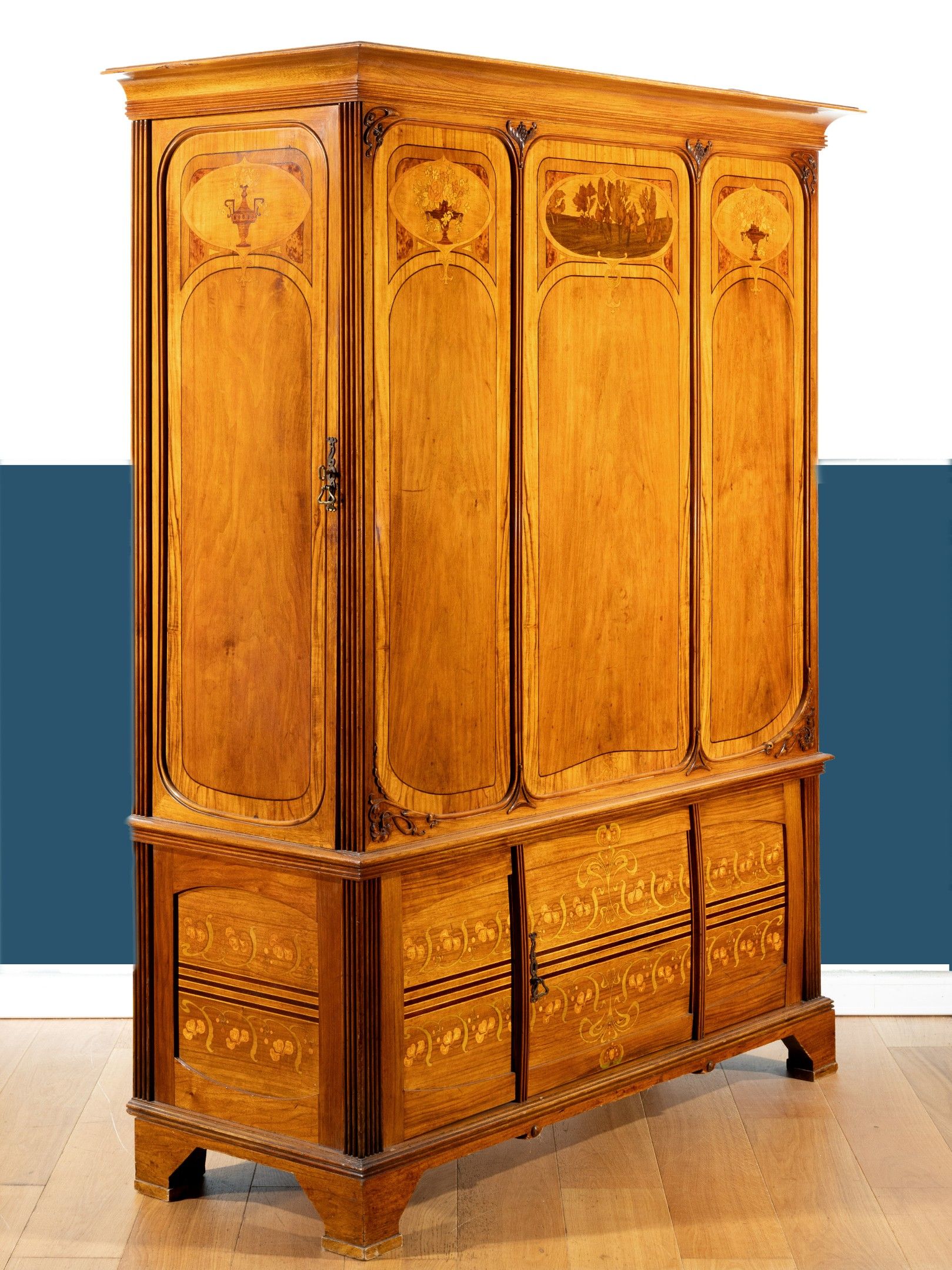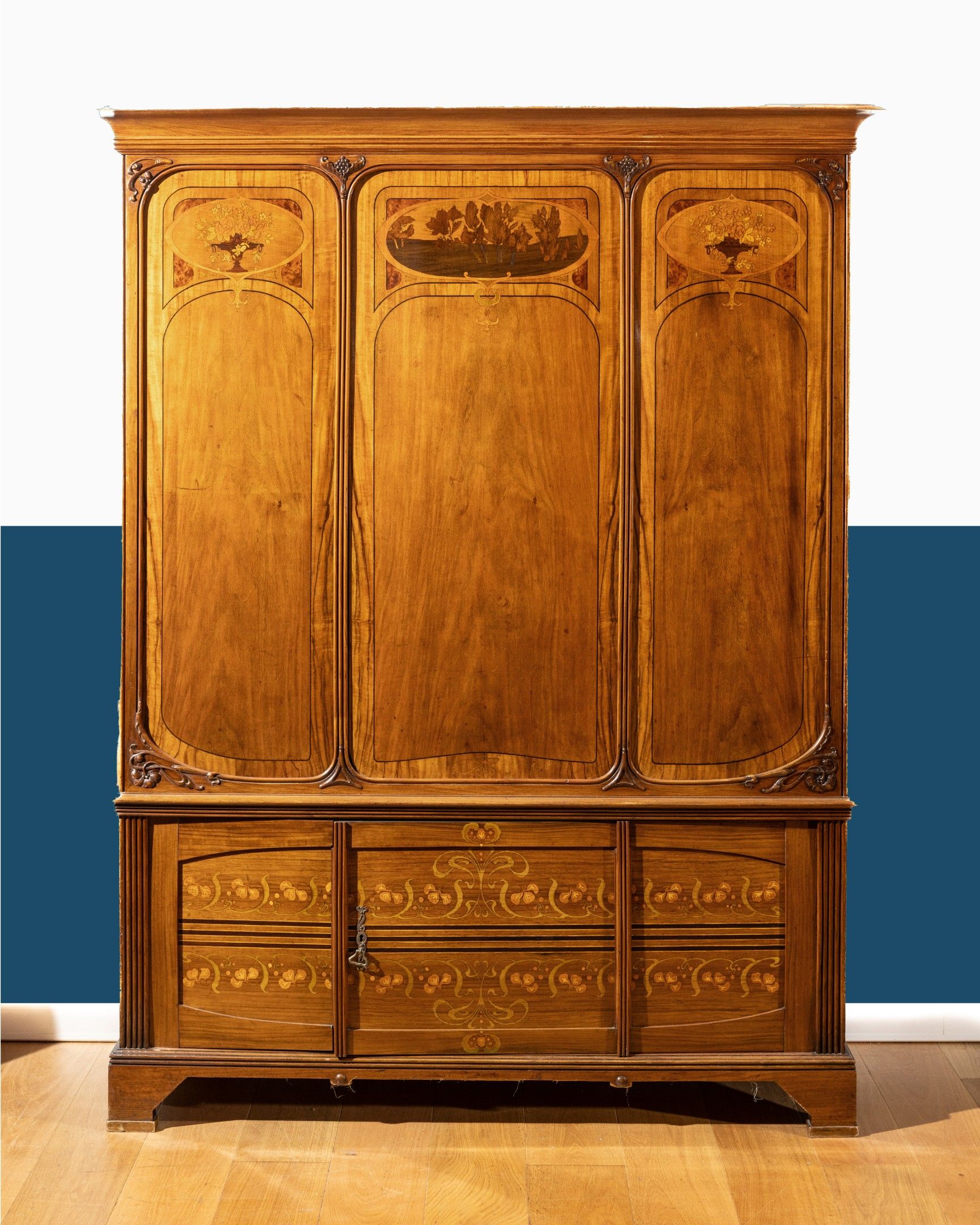 The upper part of the cabinet features a front carved with flowers, fruit and stylised triangles, and decorated with burr, boxwood, light wood and green-stained wood marquetry of a landscape and flowering vases in cartouches. It is flanked on either side by a side door revealing four compartments. It is flanked on either side by a side door revealing four compartments. The lower part opens with two leaves moulded with baguettes and decorated with a marquetry of stylised plant motifs. Brass escutcheons (with two keys).