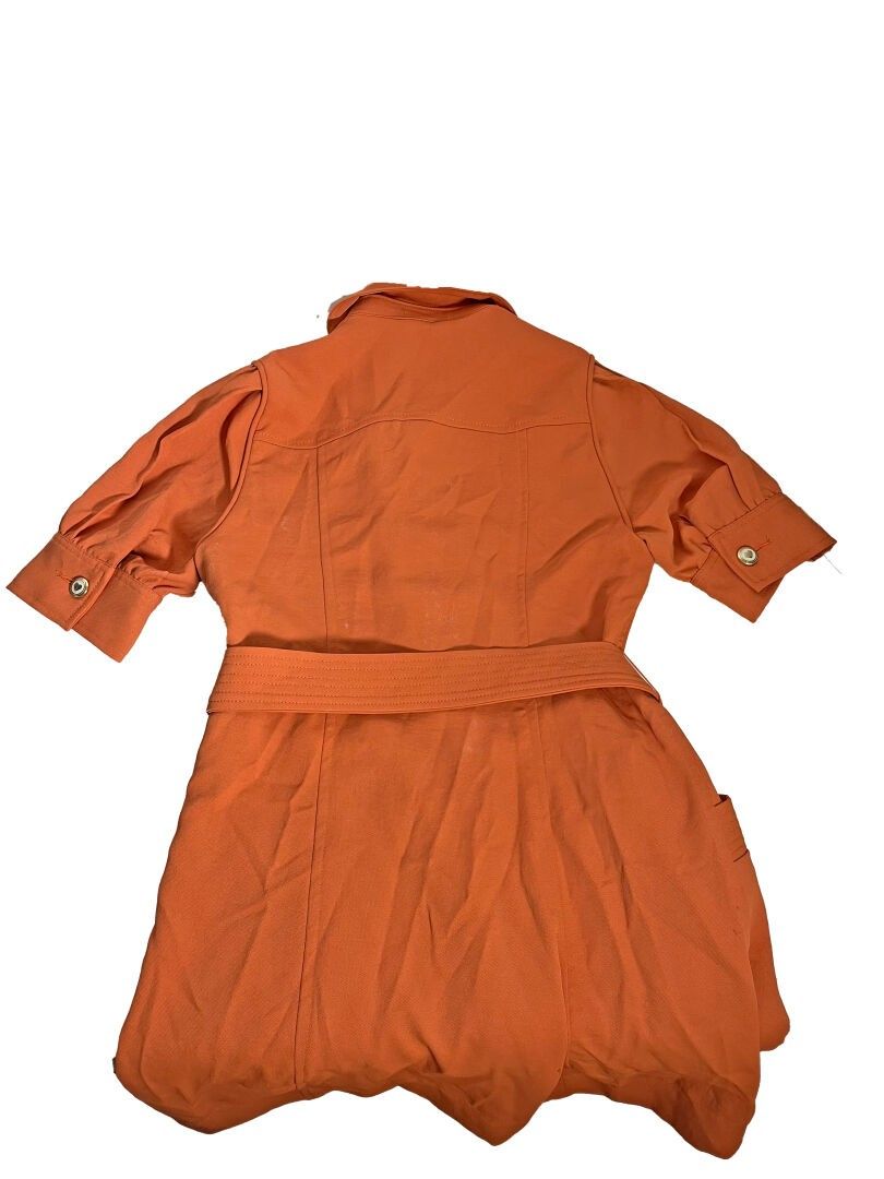 Shirt dress with short balloon sleeves in orange polyester, belted at the waist, fastened with gold-plated metal buttons decorated with hearts.
