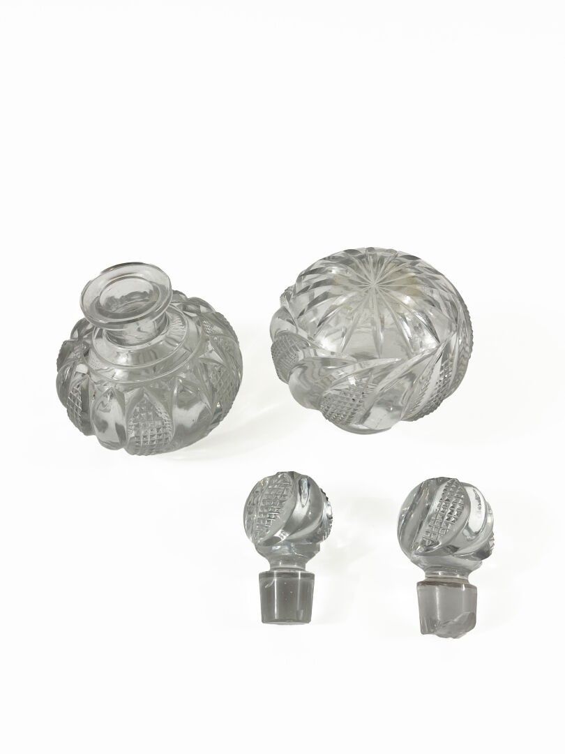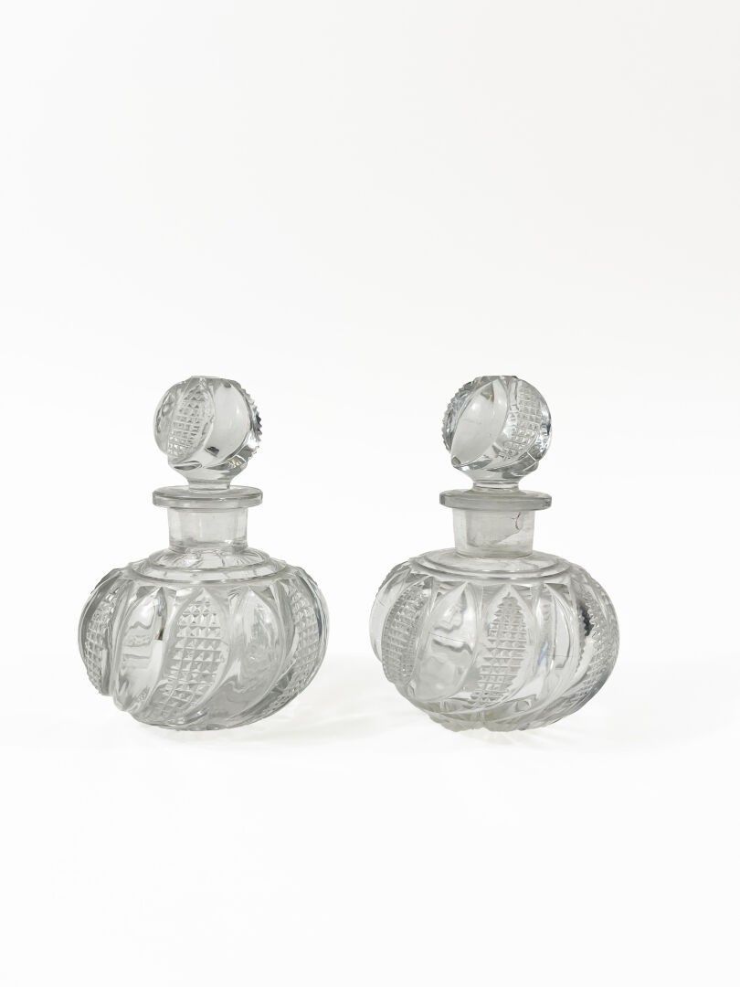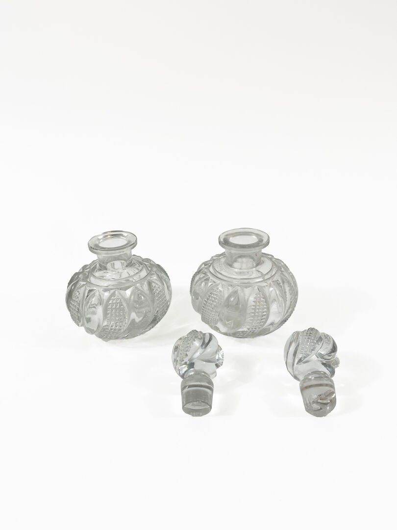 A pair of cut crystal bottles and stoppers with twisted gadroon decoration. Chips on the bases of the stoppers Height: 13.5 cm