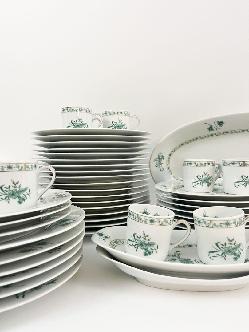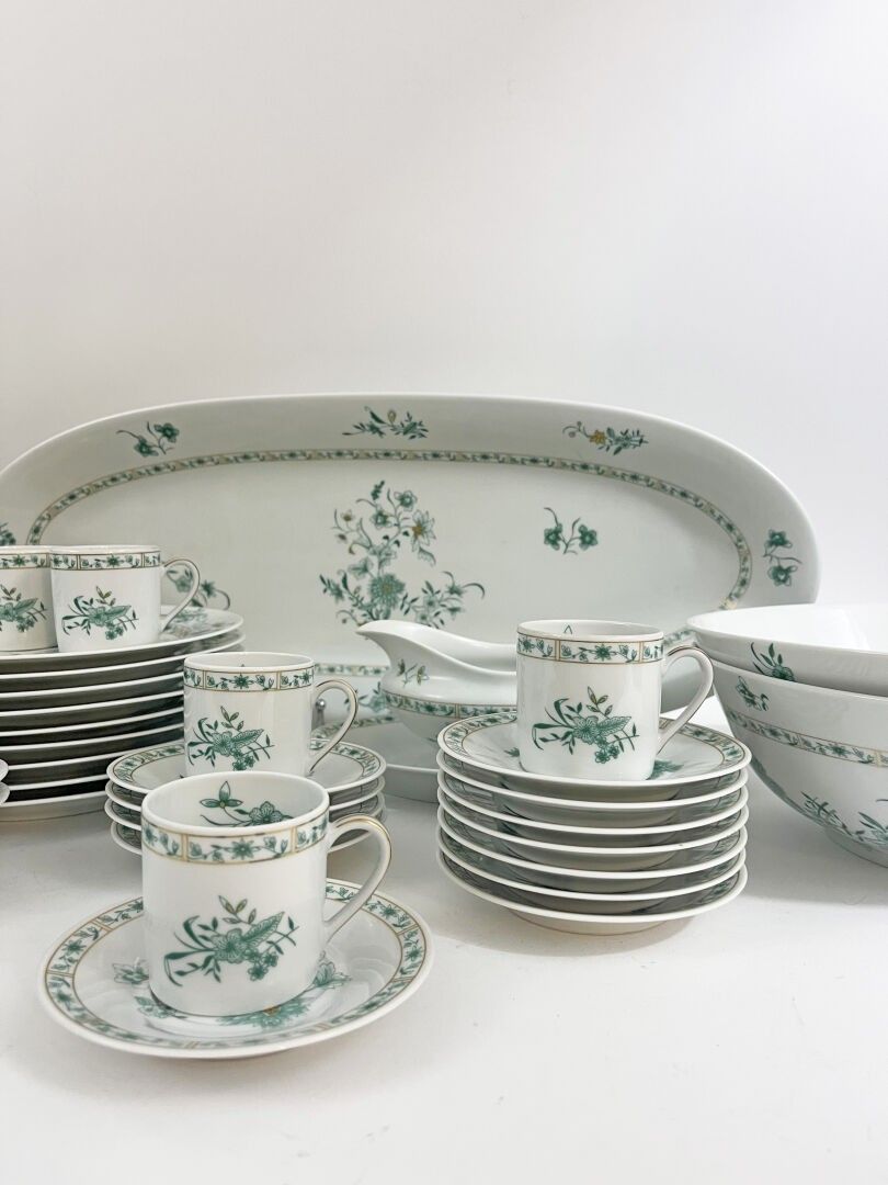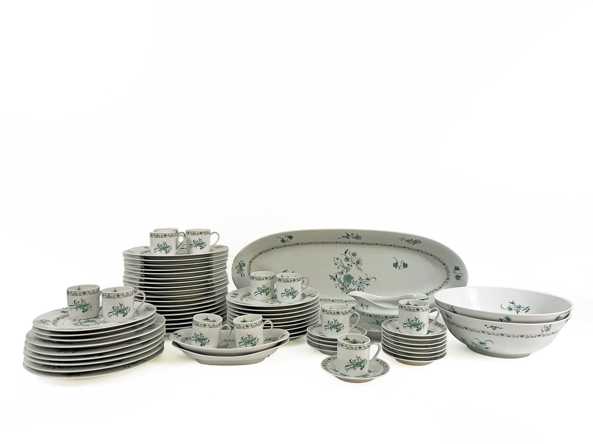 Polychrome porcelain dinner service with gilded highlights, "Peking" model, including 1 large dinner plate, 24 dinner plates, 12 saucers, 12 dessert plates, 1 sauceboat with stand, 12 coffee cups, 2 ravioli dishes, 2 salad bowls, 1 platter, 1 soup plate, 1 large dinner plate.
