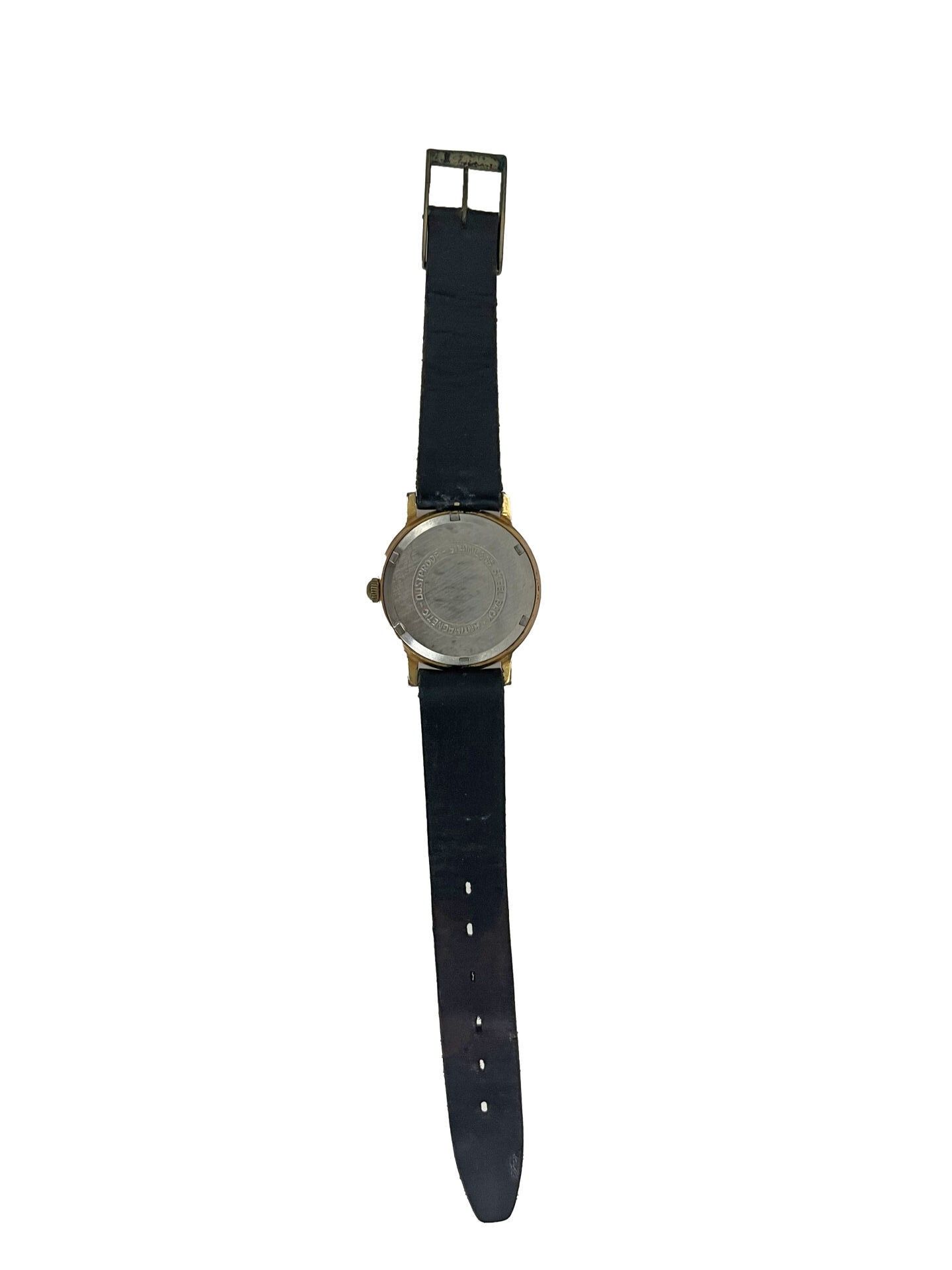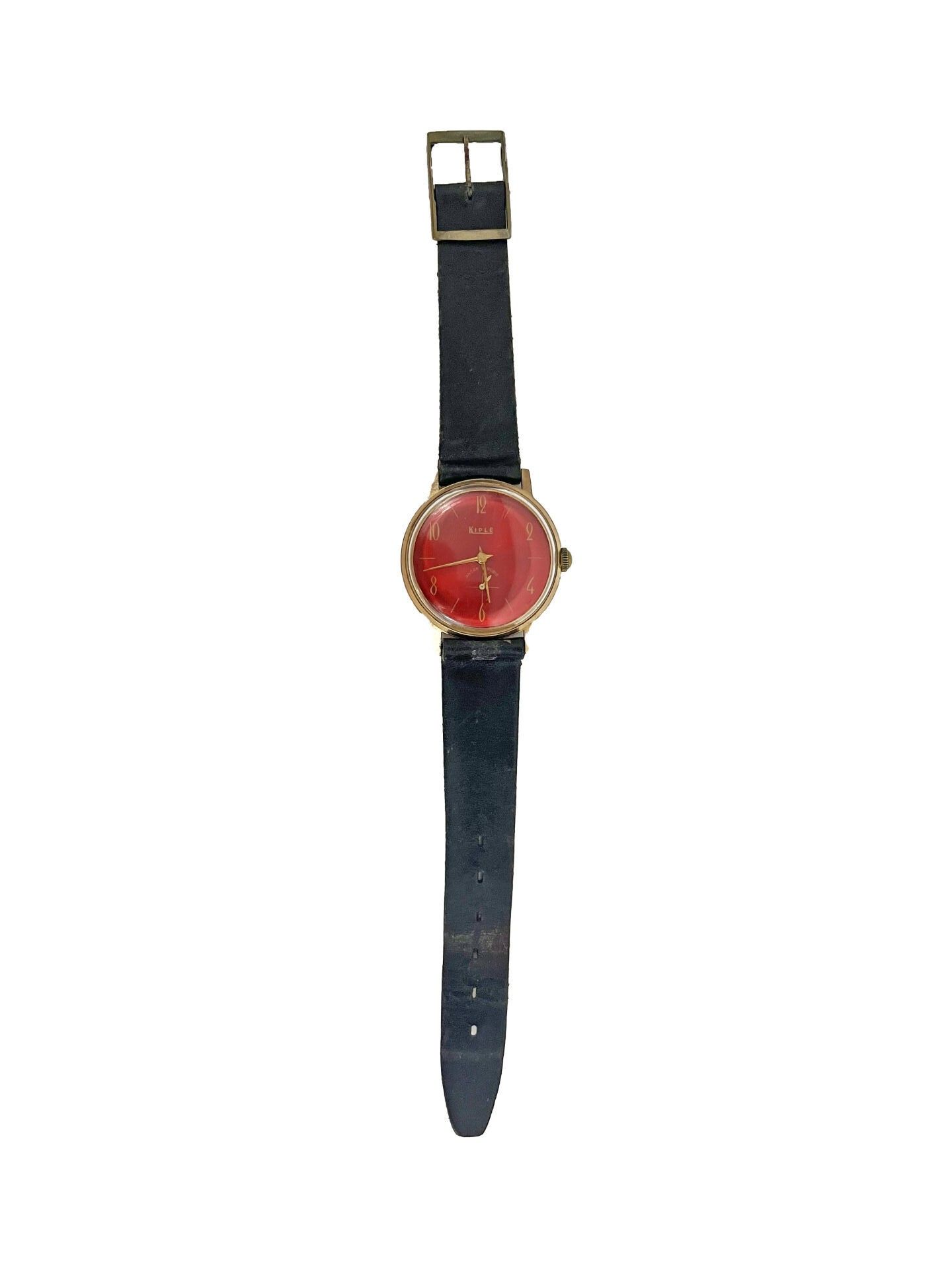- gilt steel wristwatch with red dial, mechanical movement, leather strap with pin buckle.