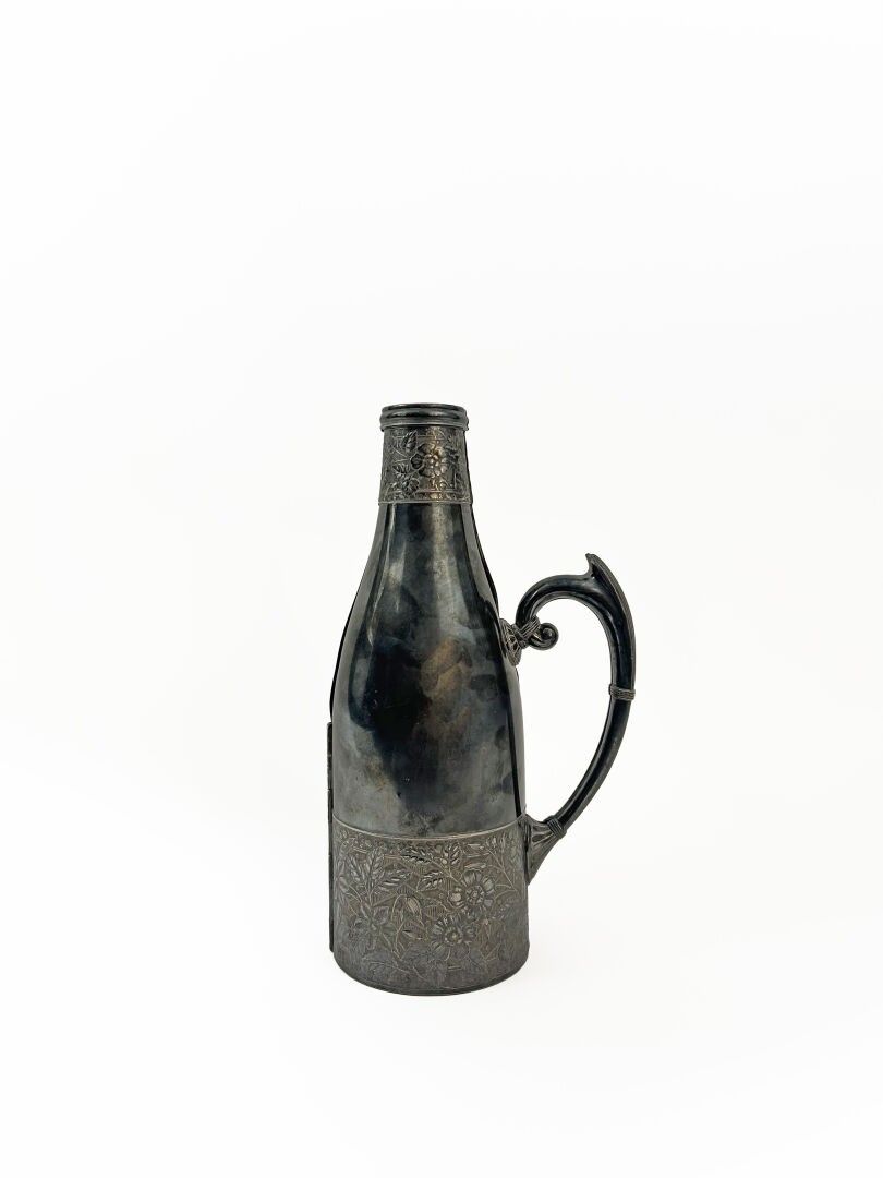 Chased silver metal bottle case decorated with flowers and foliage, stylised handle