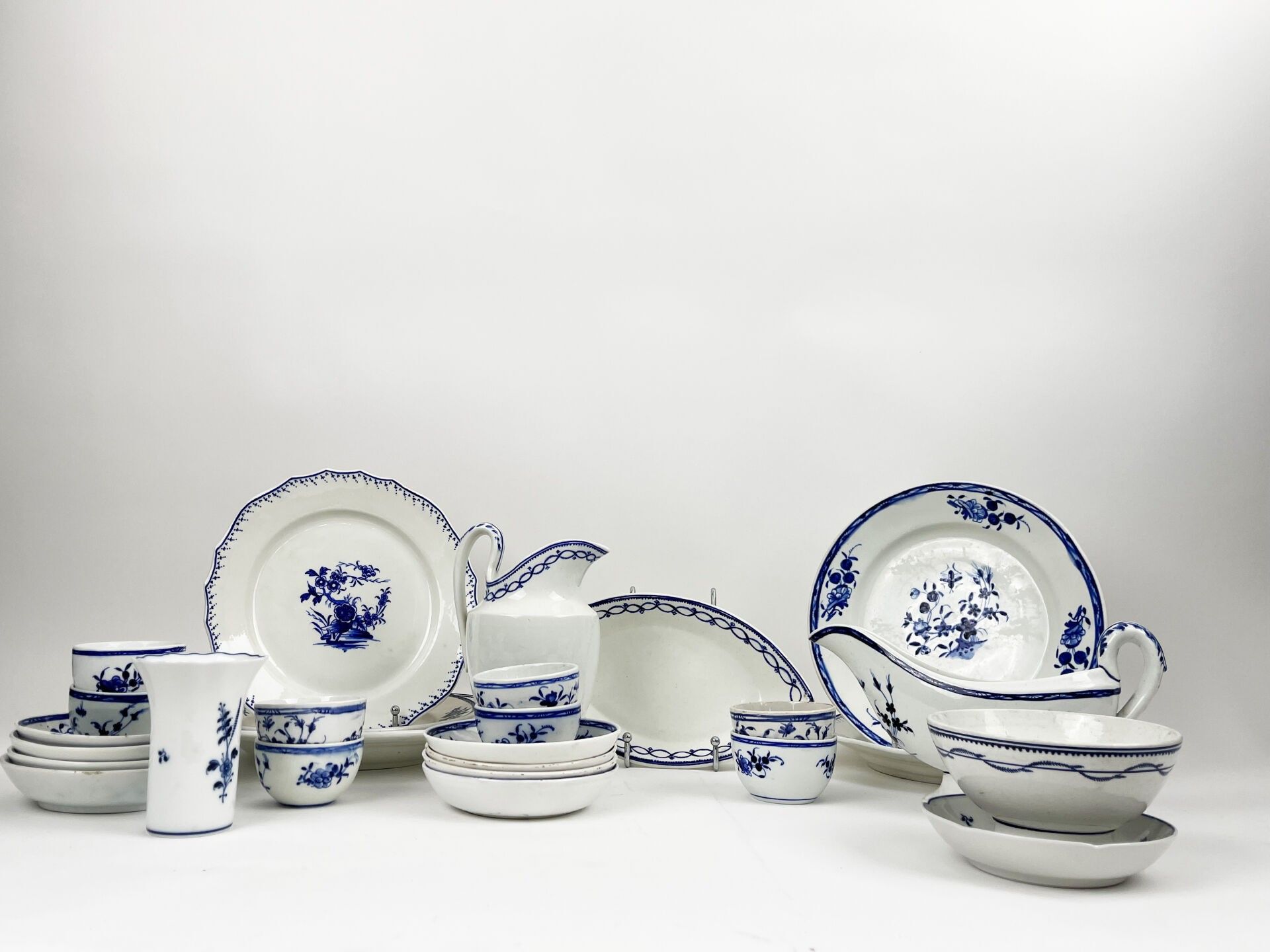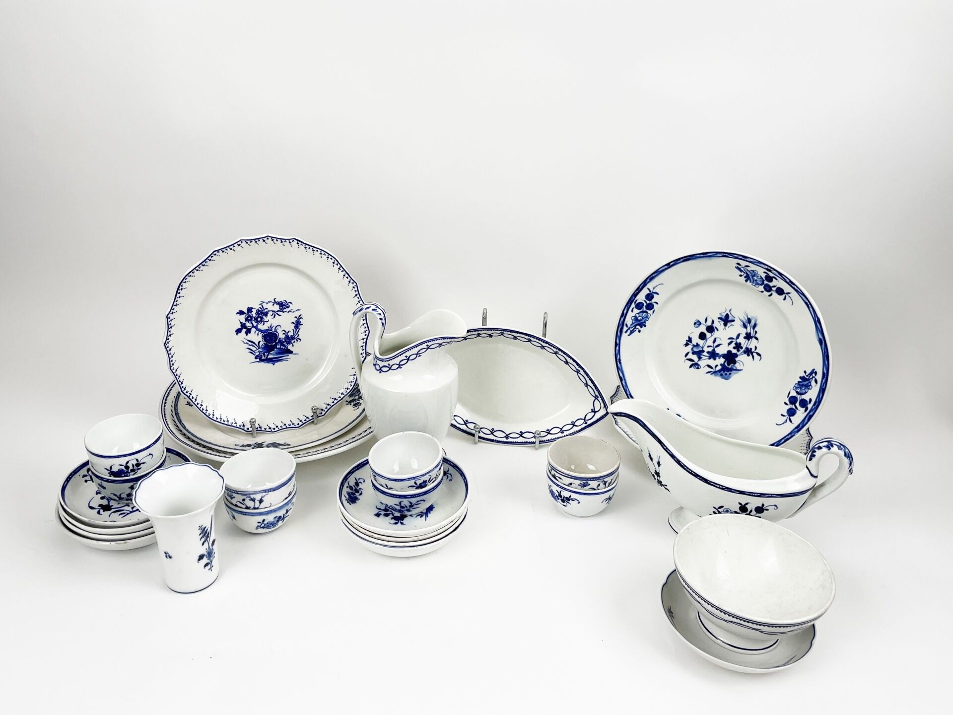 1 large ravier dish; 1 water jug, 1 sauceboat, 8 small bowls, 1 platter; 9 small bowls, 1 pedestal bowl on foot, 1 large dinner plate, 4 dinner plates