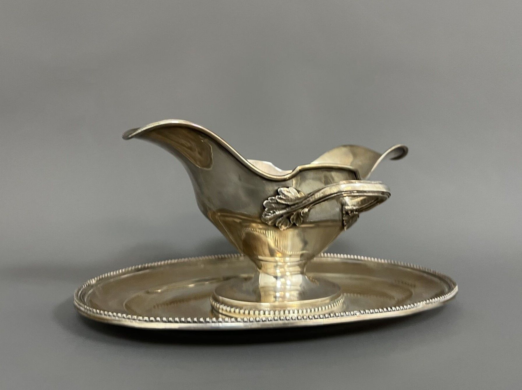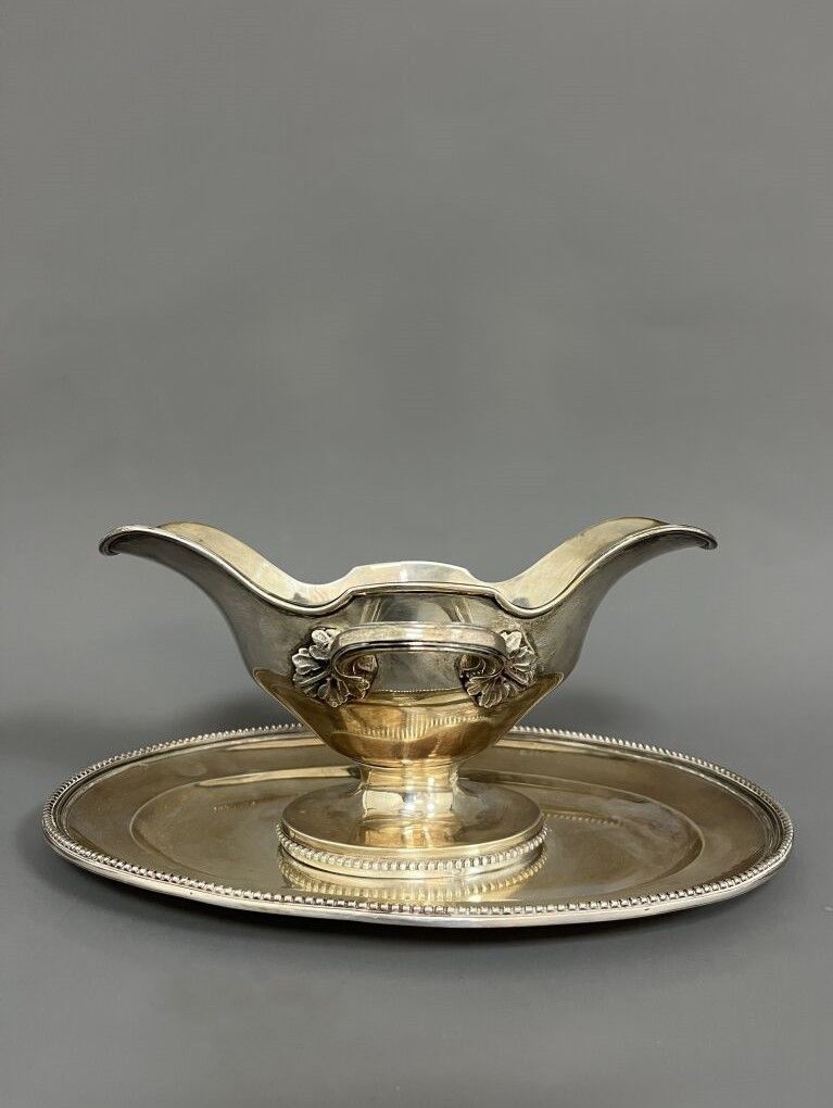 SAUCIERE in silver 950/°°°, 18th century style, and its adherent tray, filet contour and pearl frieze model, two lateral handles.