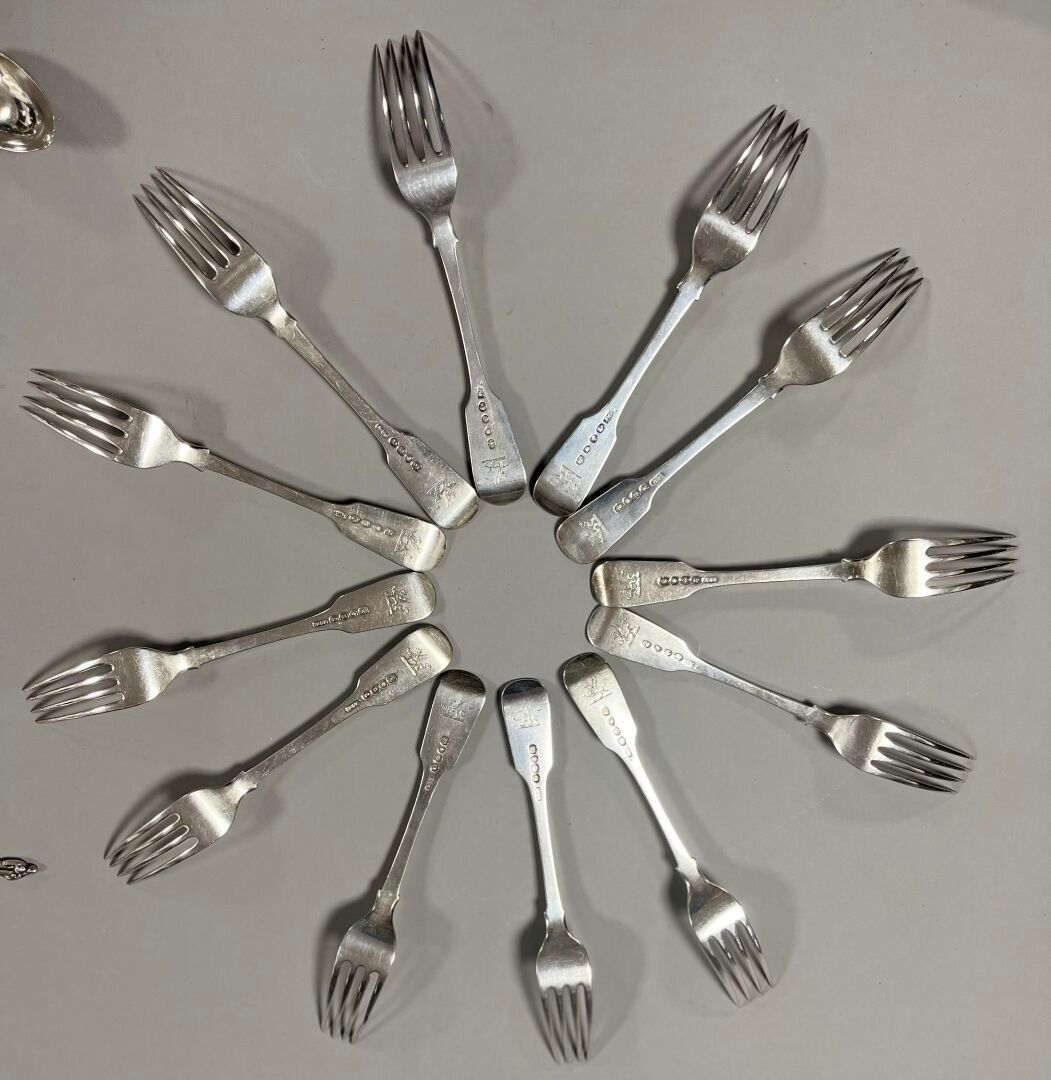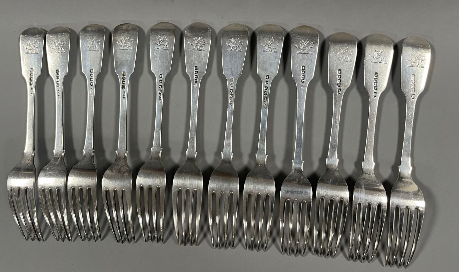 - 12 flat forks with engraved griffin design. Hallmarks: Silver, London, (x4) 1828, Adey Bellamy Savory (ABS) and (x2) 1835, (x3) 1840 and (x3) 1842, John James Whiting (JW). Weight: 935.02 g.