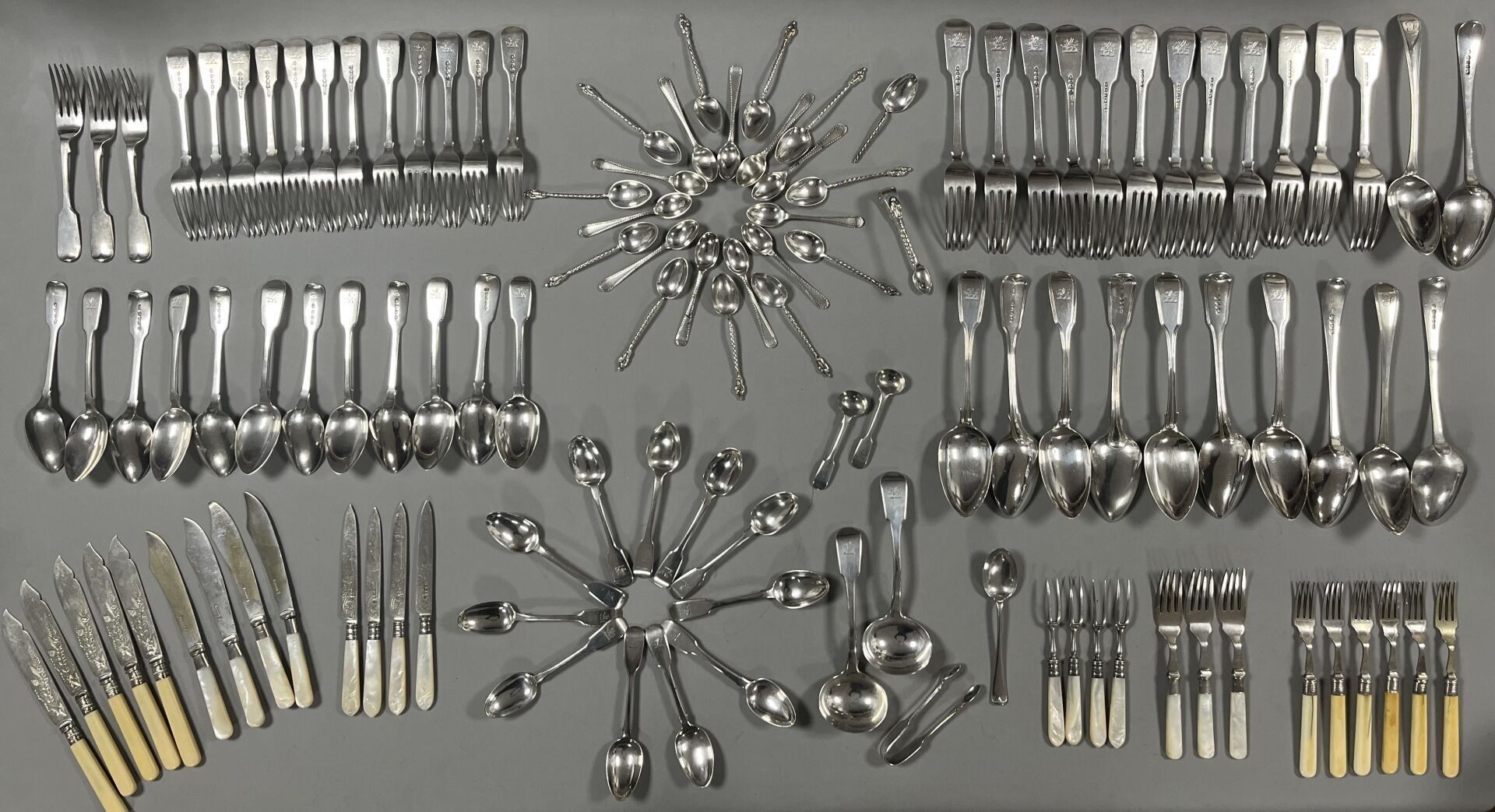 Provenance: This English silver menagère has been in daily use by various branches of the Campbell family since the second half of the 18th century. In the 19th and 20th centuries the family consisted of Col. Charles Campbell and his two sisters. Col. Campbell was aide-de-camp to George V; his wife, Mary de Teck, entrusted him with their two sons, the future Edward VIII and George VI, and wrote to him: "that they had both taken great pleasure in seeing them begin to assume their public duties" under his direction. (Handwritten letter, 26 May 1920, on Buckingham Palace letterhead).