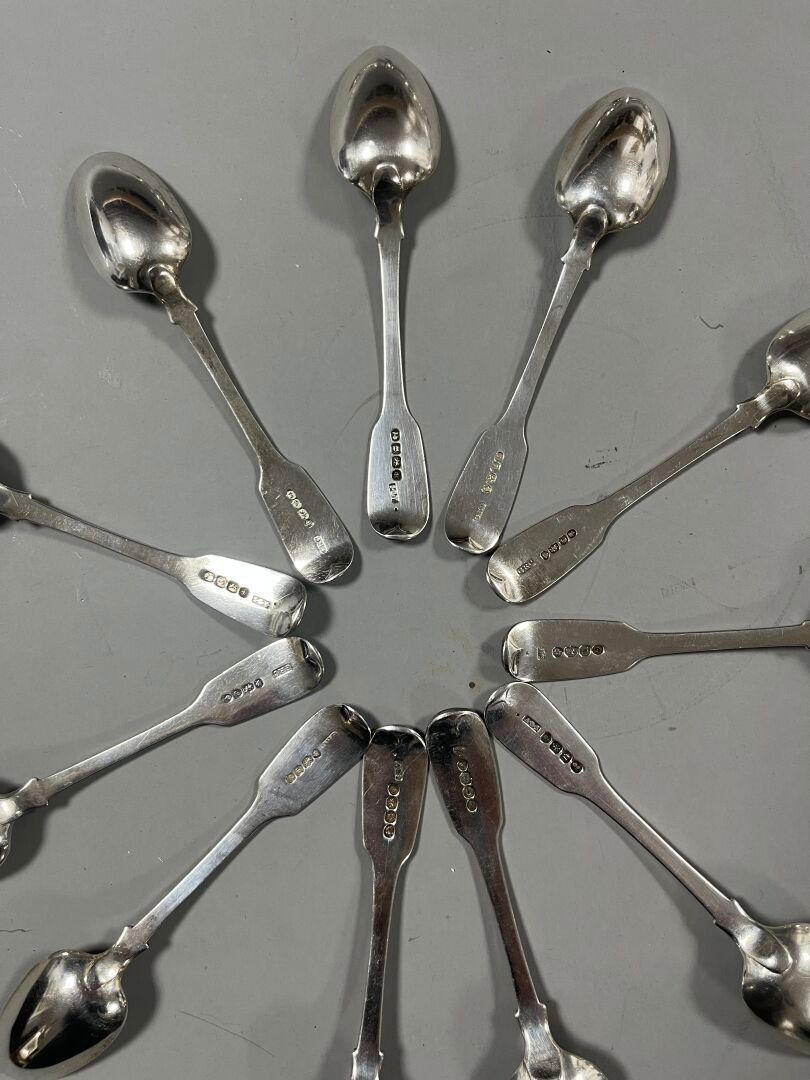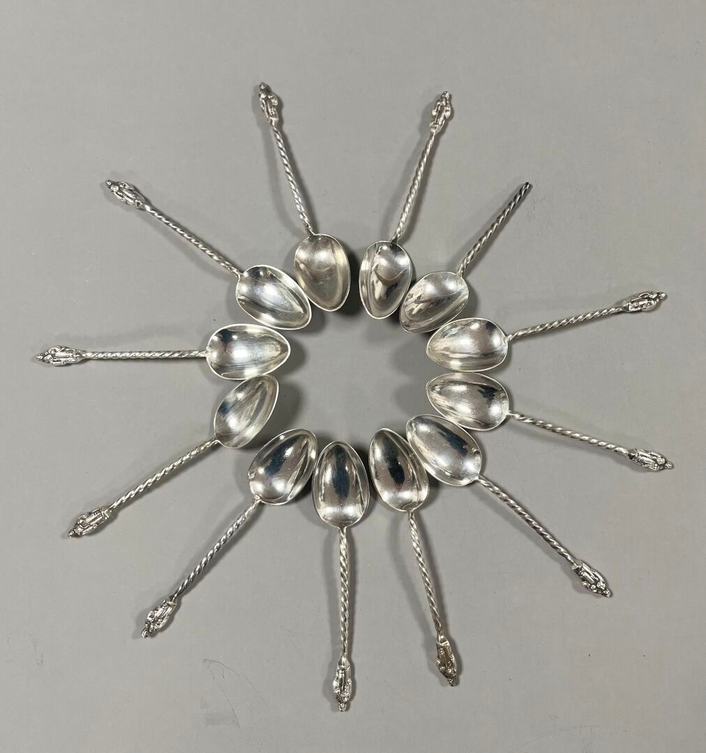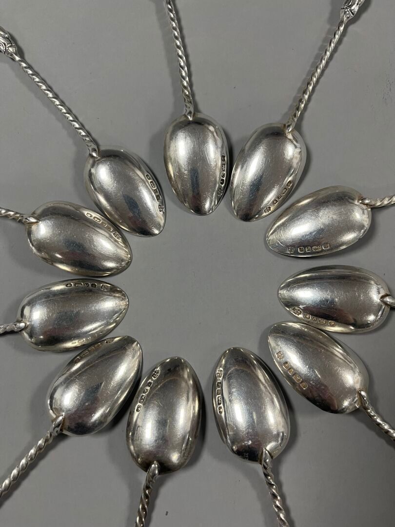 - 12 teaspoons decorated with an apostle (1 broken). Marks : Silver, Sheffield, (x12) 1888, James Deakin & Sons - John & William Deakin (JDWD). Weight : 197,05 g.