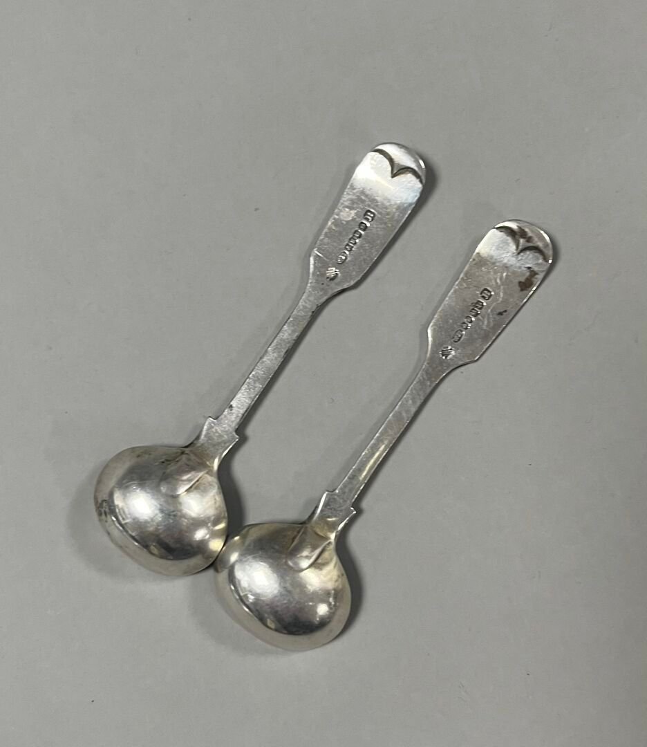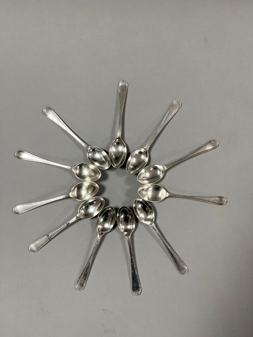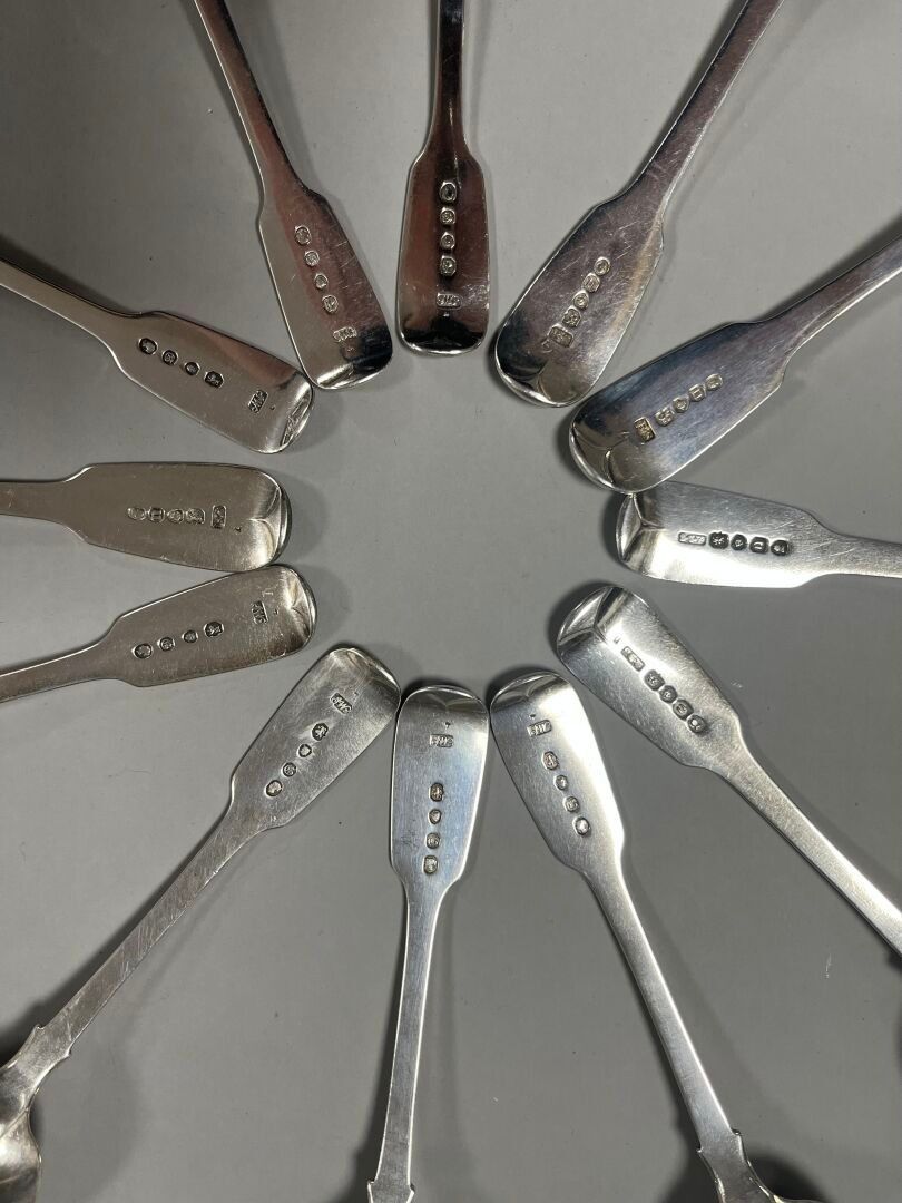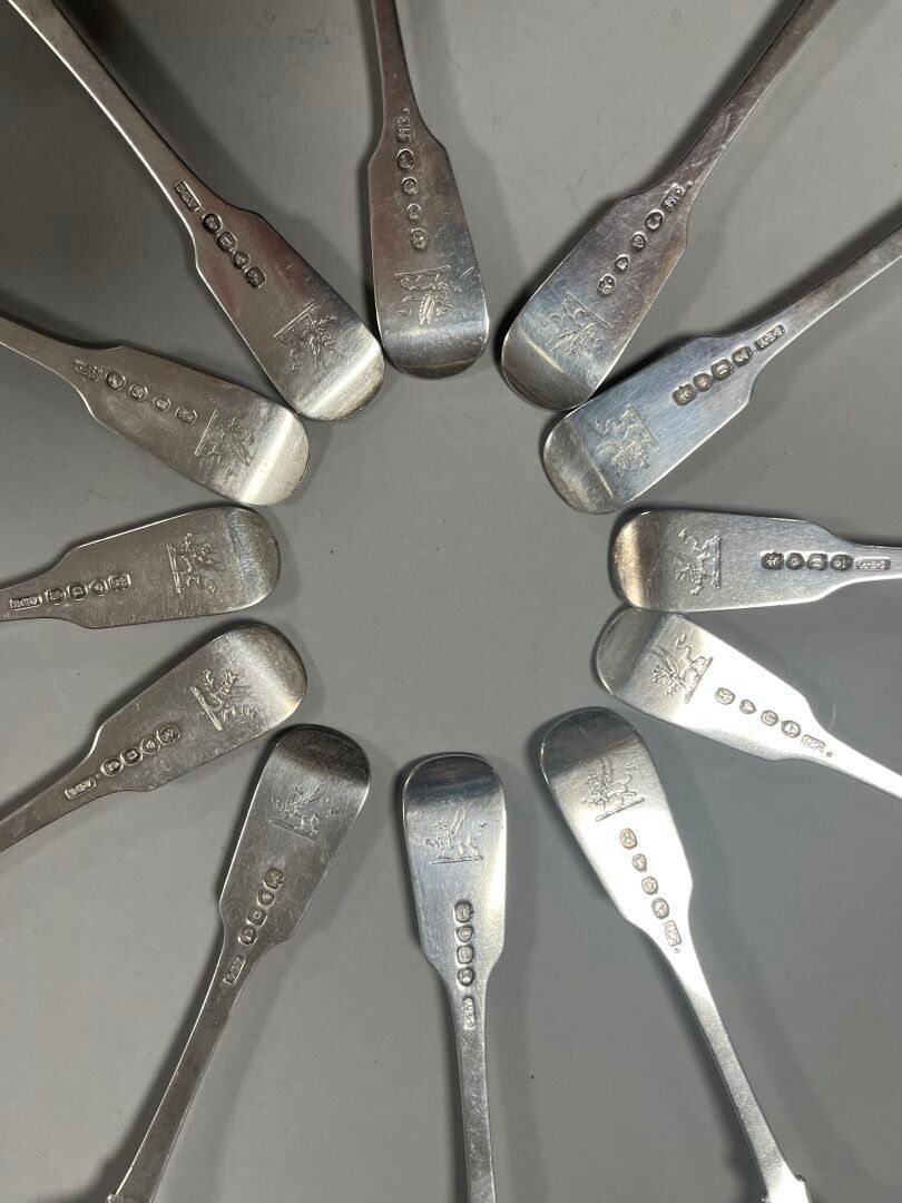 - 11 small spoons, uniplat model, engraved with a griffin. Marked : Silver, London, (x5) 1838 (GRC), (x4) 1828, Adey Bellamy Savory (ABS), (x2) 1835, John James Whiting (JW). Weight: 304.52 g.