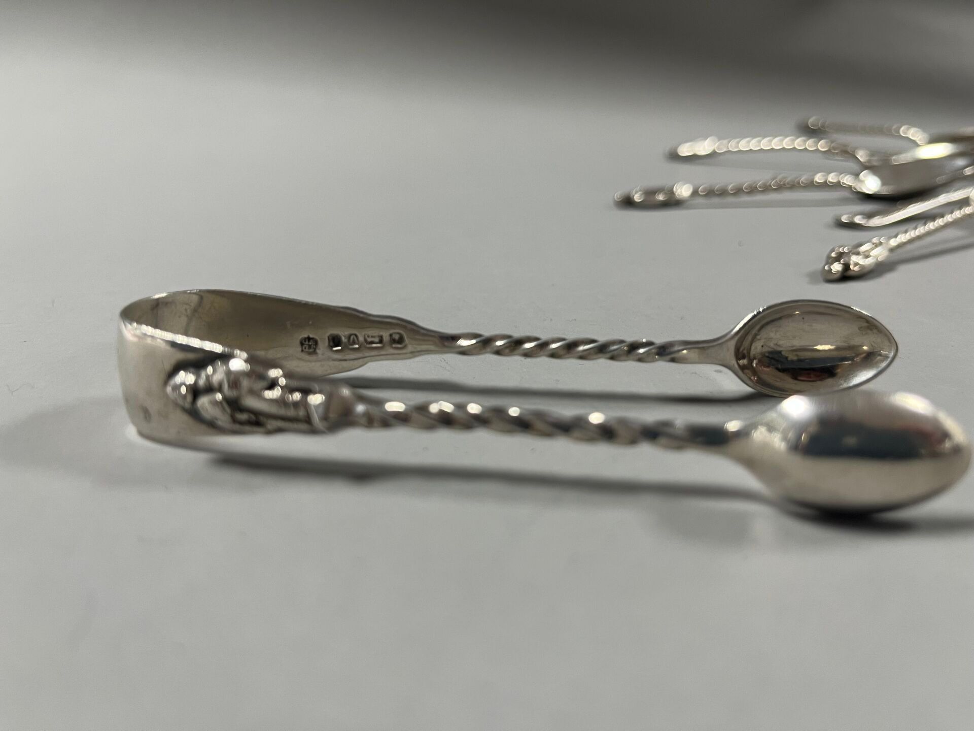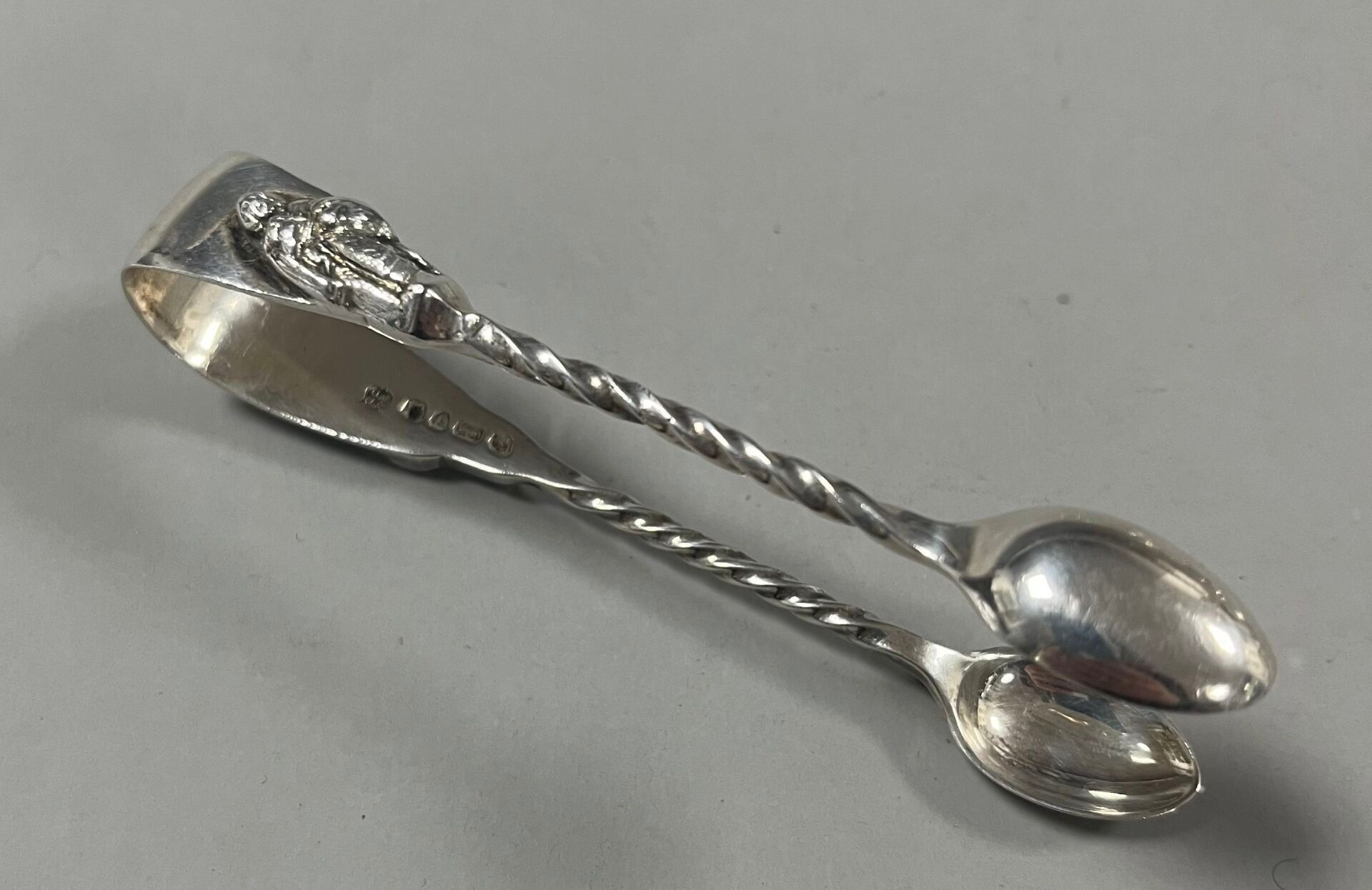 - A pair of sugar tongs decorated with an apostle. Hallmarks: Silver, Sheffield, 1888, James Deakin & Sons - John & William Deakin (JDWD). Weight: 26.03 g.