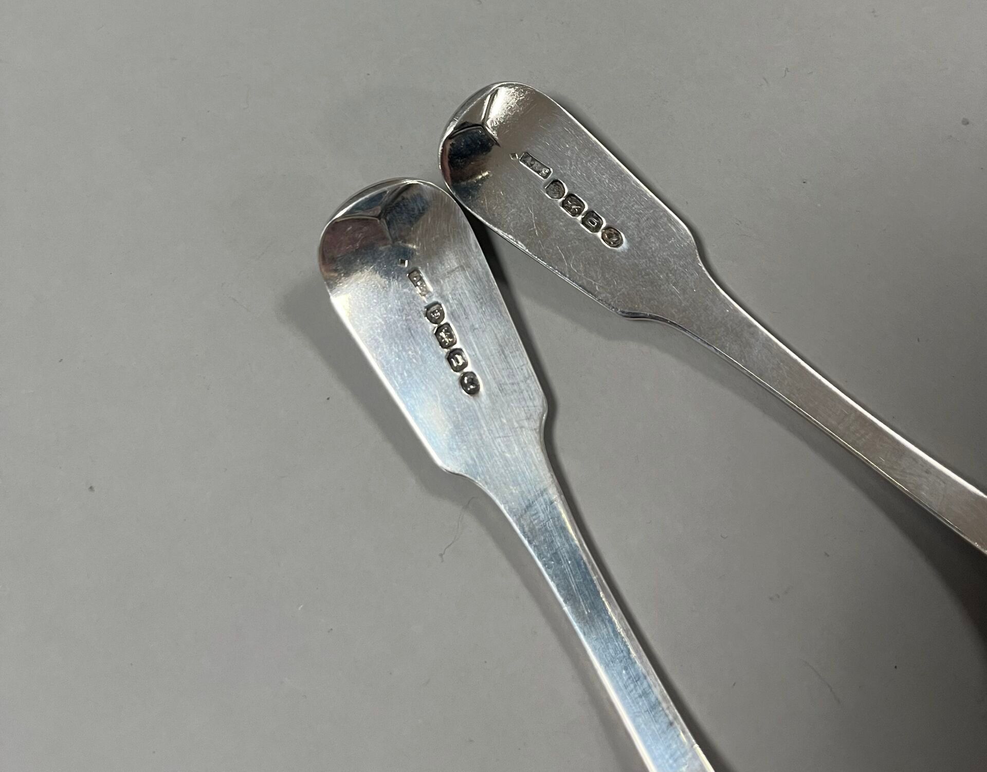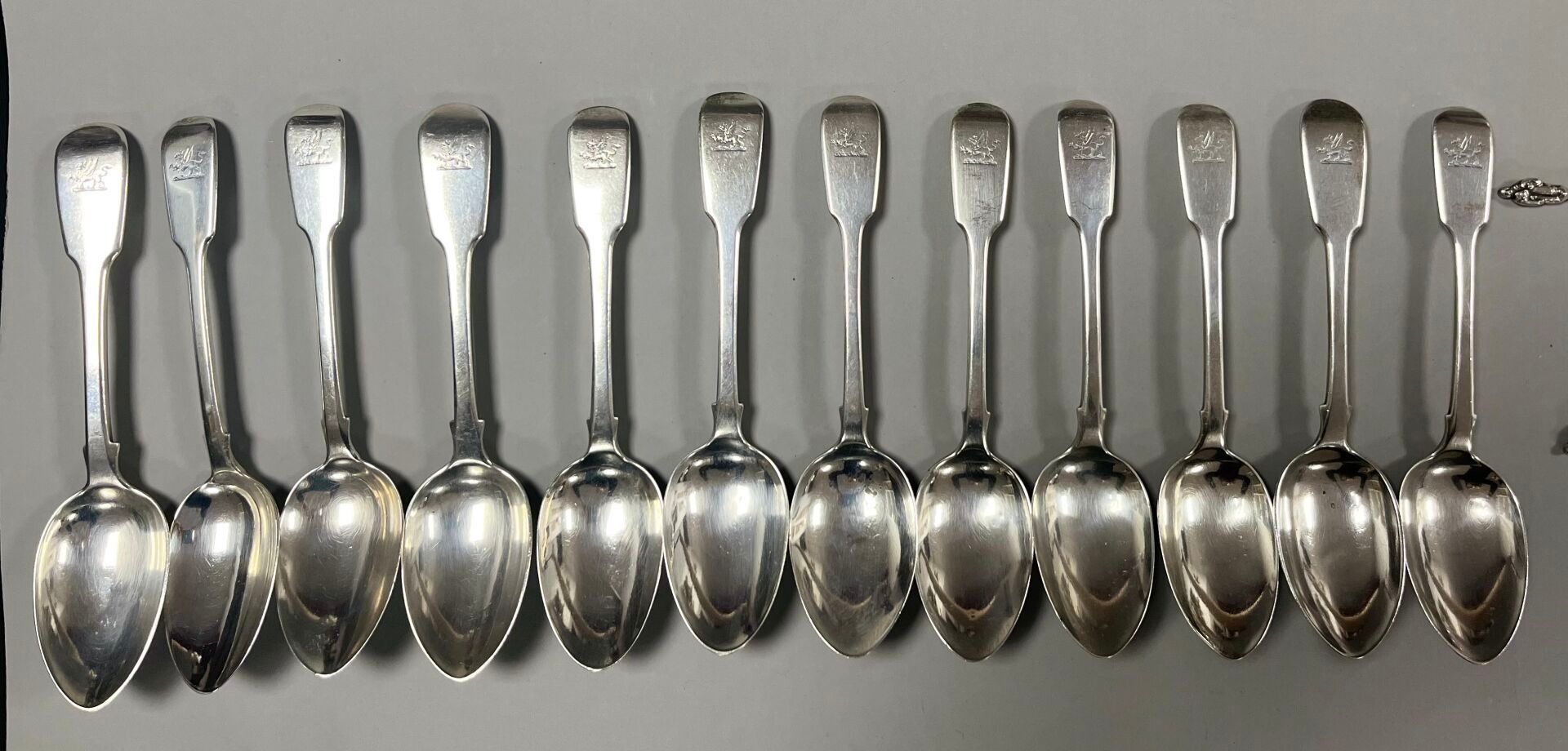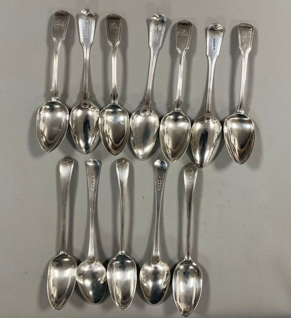 - 12 spoons, 5 of which are of the contour filet design, monogrammed F, and 7 engraved with a griffin. Marked: Silver, London, (x5) 1792, Peter & Ann Bateman (PBAB), (x2) 1804 and (x1) 1806, Richard Crossley (RC), (x4) 1842, John James Whiting (JW). Weight: 841.51 g.
