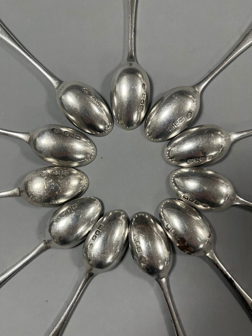 - 11 coffee spoons. Marked: Silver, London, (x5) 1902 and (x6) 1903. Weight : 153,42 g.