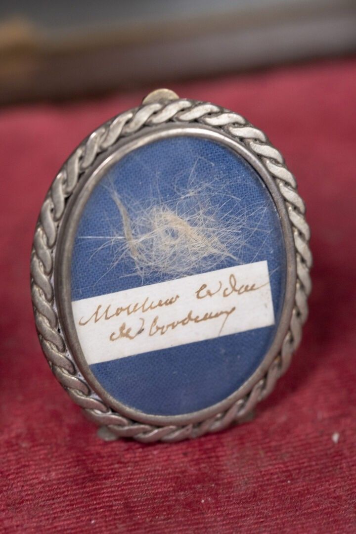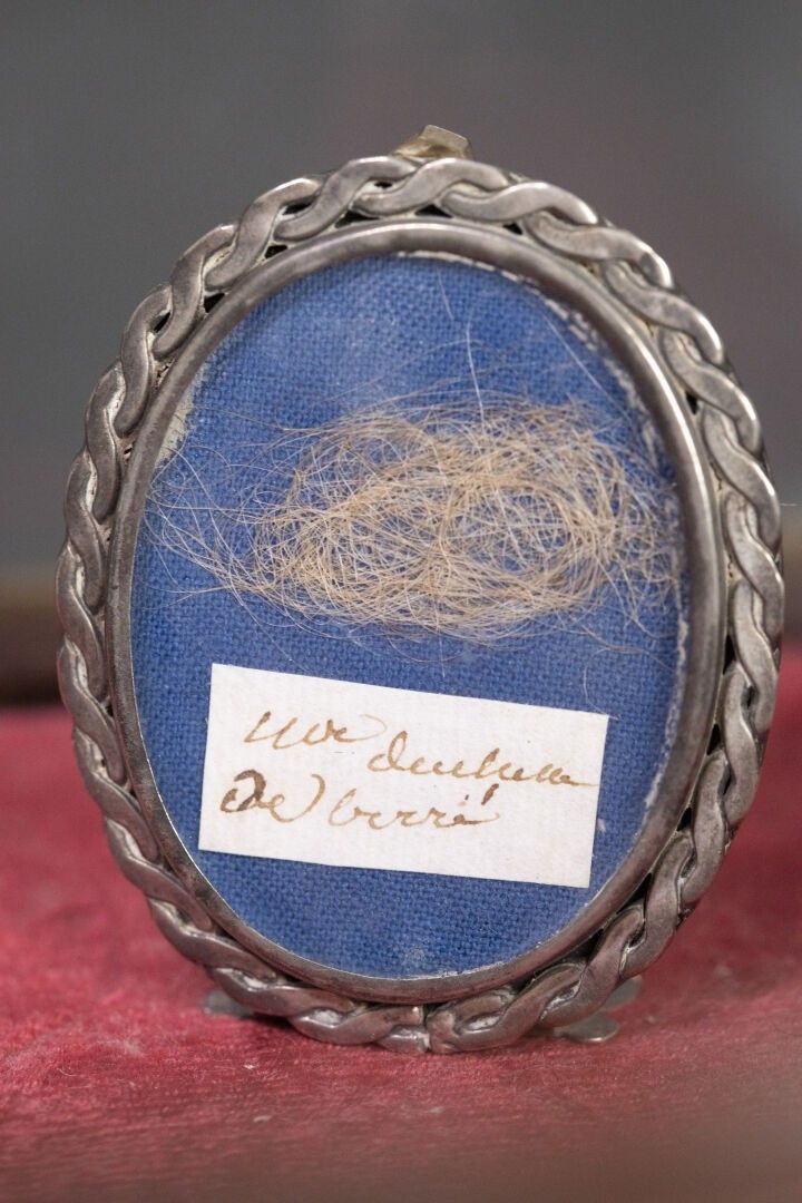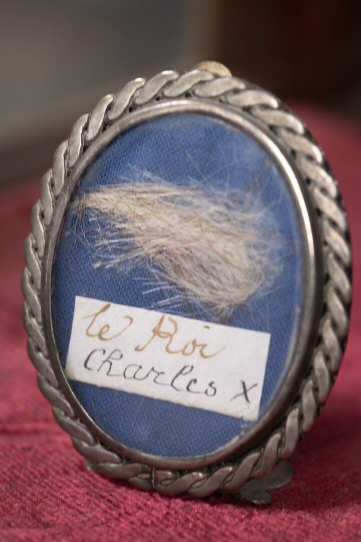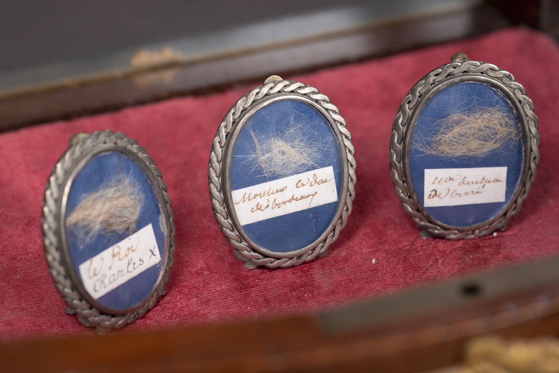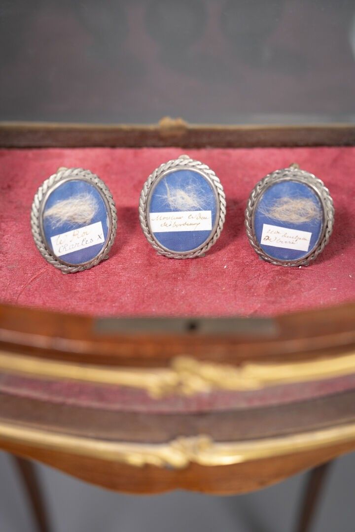 [Historical Souvenir]. SET OF THREE silver MEDALONS (to be verified) containing under glass the presumed hair of King Charles X, the Duchess of Berry and the Duke of Bordeaux specified by labels written in ink.