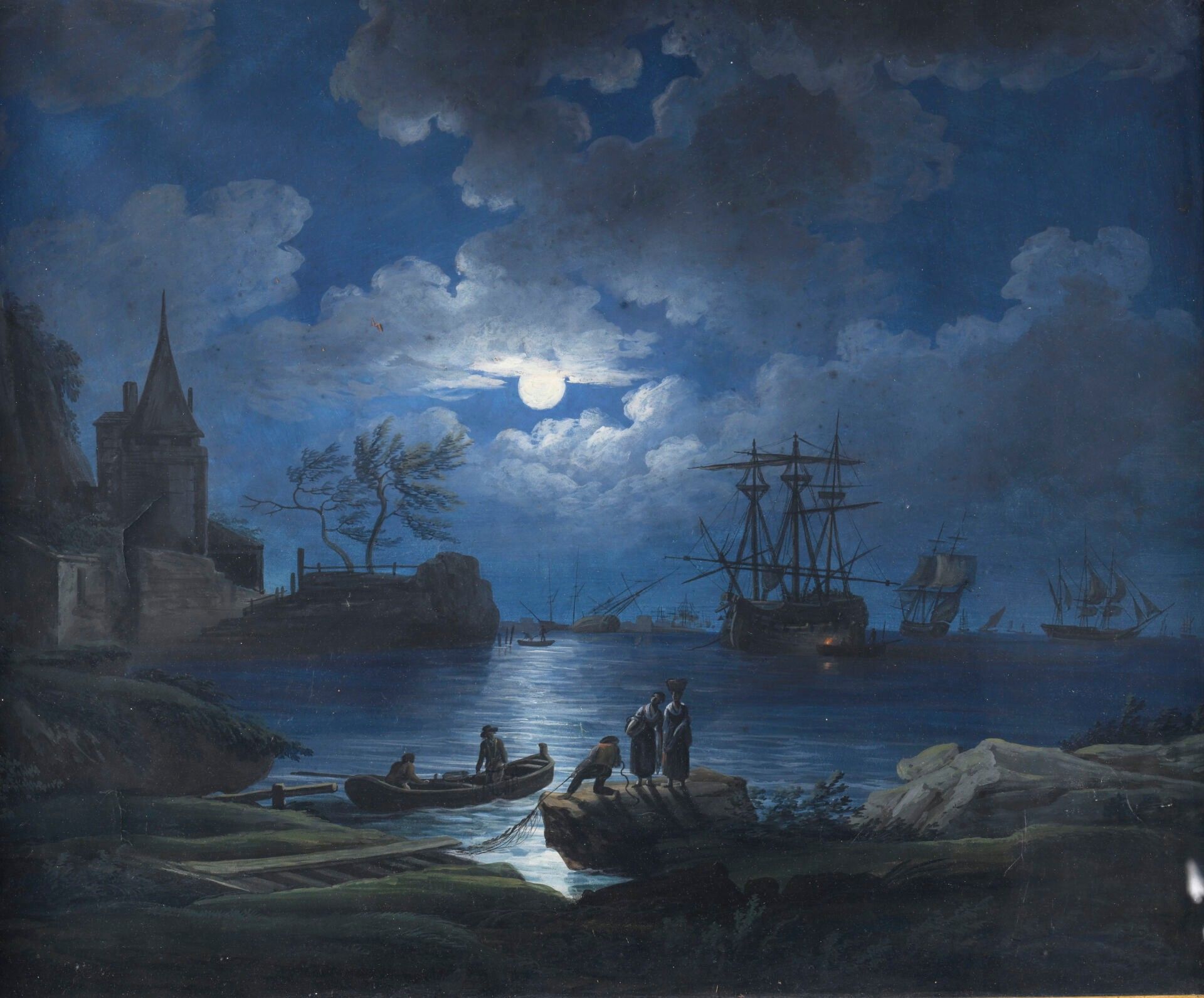 19th century school View of a busy port at dusk
