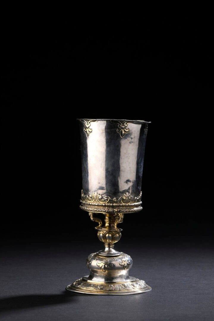Silver and partially gilded pedestal goblet. The foot is bordered by a frieze, the stretched umbilicus decorated with foliage, the stem is composed of a knot and consoles, the straight chalice is bordered by friezes and foliage.